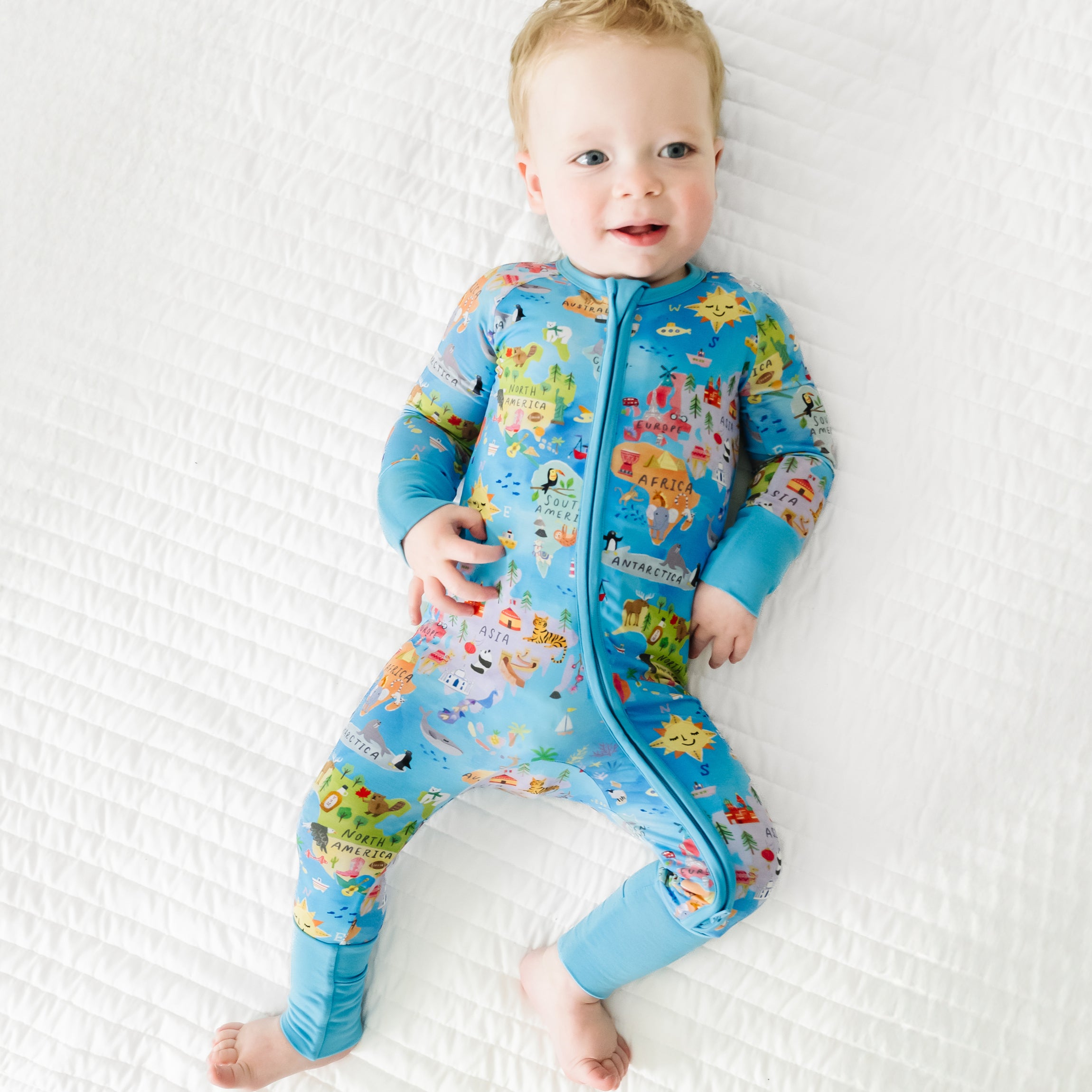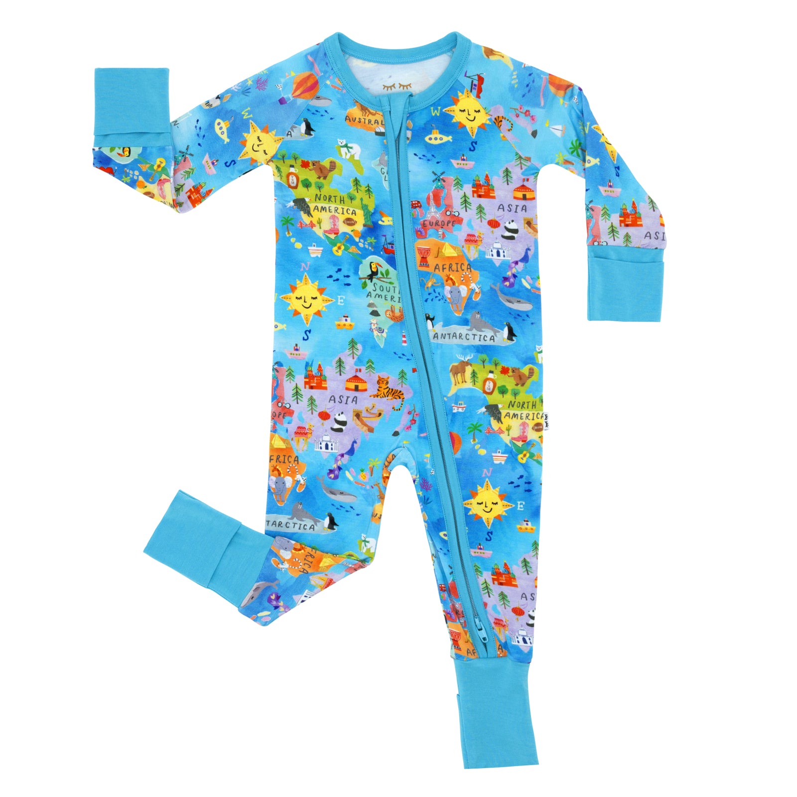 Oh. the places you’ll go! Tuck your baby in for sweet dreams of future adventures with this one-piece Zippy. featuring a hand painted world map with iconic landmarks and animals. Made from our buttery soft Lunaluxe® Bamboo. it includes thoughtful features like fold-over feet and mittens. a 2-way zipper and no scratchy tags. Snag styles for your whole globetrotting crew!