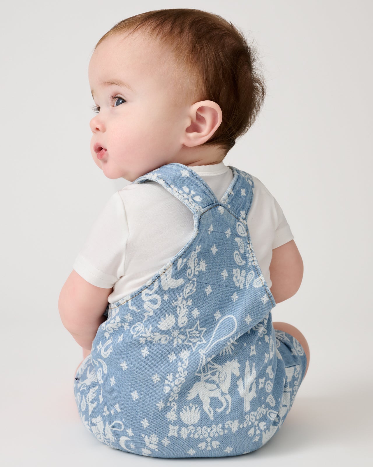 Western charm for everyday wear. The Bandana Blues Denim Shorty Overall features subtle rodeo icons on our special printed denim that’s always soft. Made from durable Soluxe® Bamboo. these baby overalls have adjustable straps and a relaxed fit perfect for playtime. Layer over their fave LS tops!