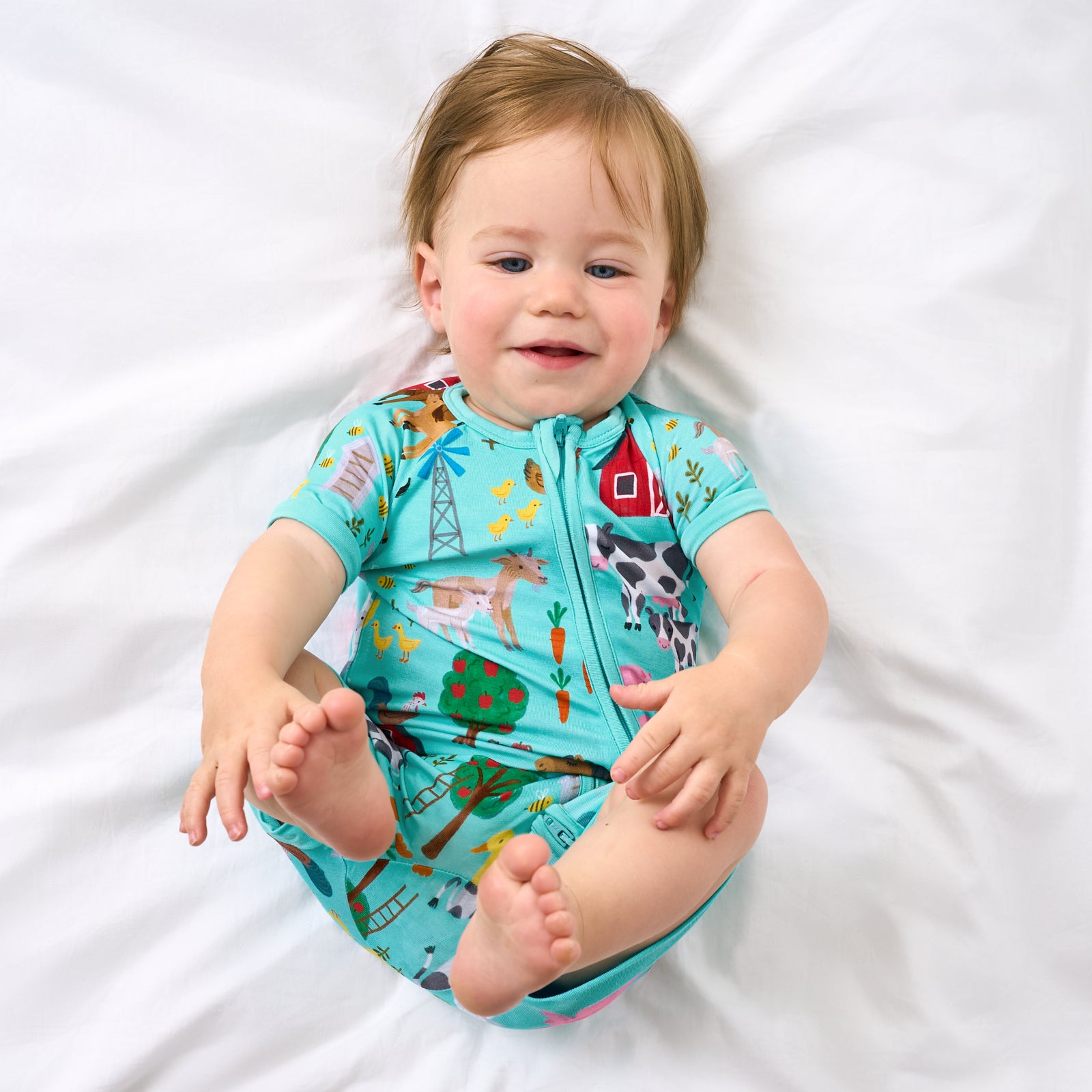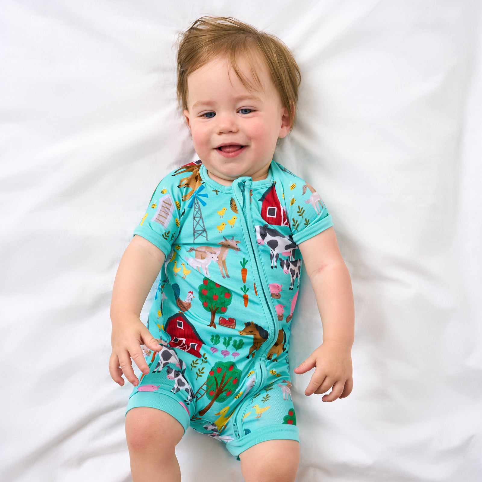 Time to hit the hay! This bamboo baby sleeper features hand-drawn barnyard friends on a cheerful teal blue backdrop. Made from our signature Lunaluxe® Bamboo. the Farm Fam Shorty Zippy brings cloud-soft comfort that lasts. Same fan-fave fit as our classic Zippy. just shorter for warmer nights. Snag matching styles for your whole crew!
