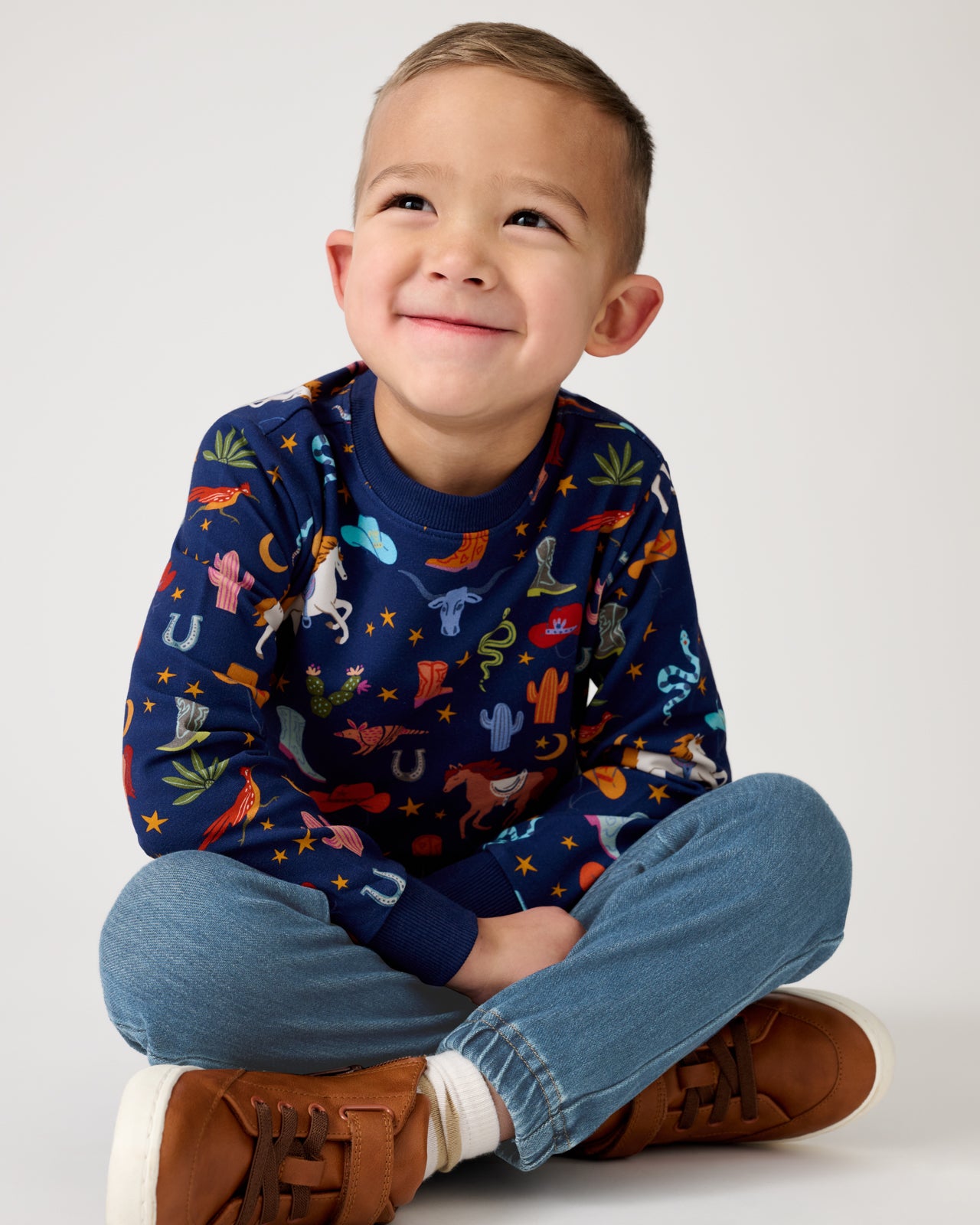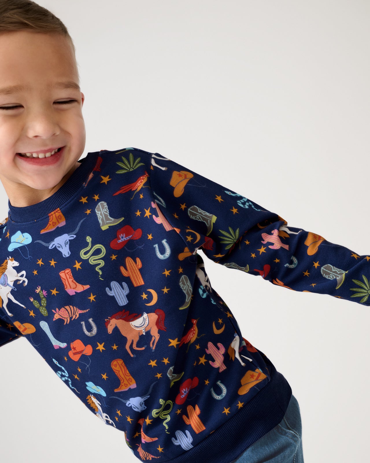 Ready to rodeo! The Rancher Roundup Crewneck Sweatshirt features classic western icons on a deep navy backdrop. Made from soft Soluxe® Bamboo with a cozy French terry interior. this kids sweatshirt has a relaxed fit that’s perfect for layering. Mix & match with their fave LS bottoms!