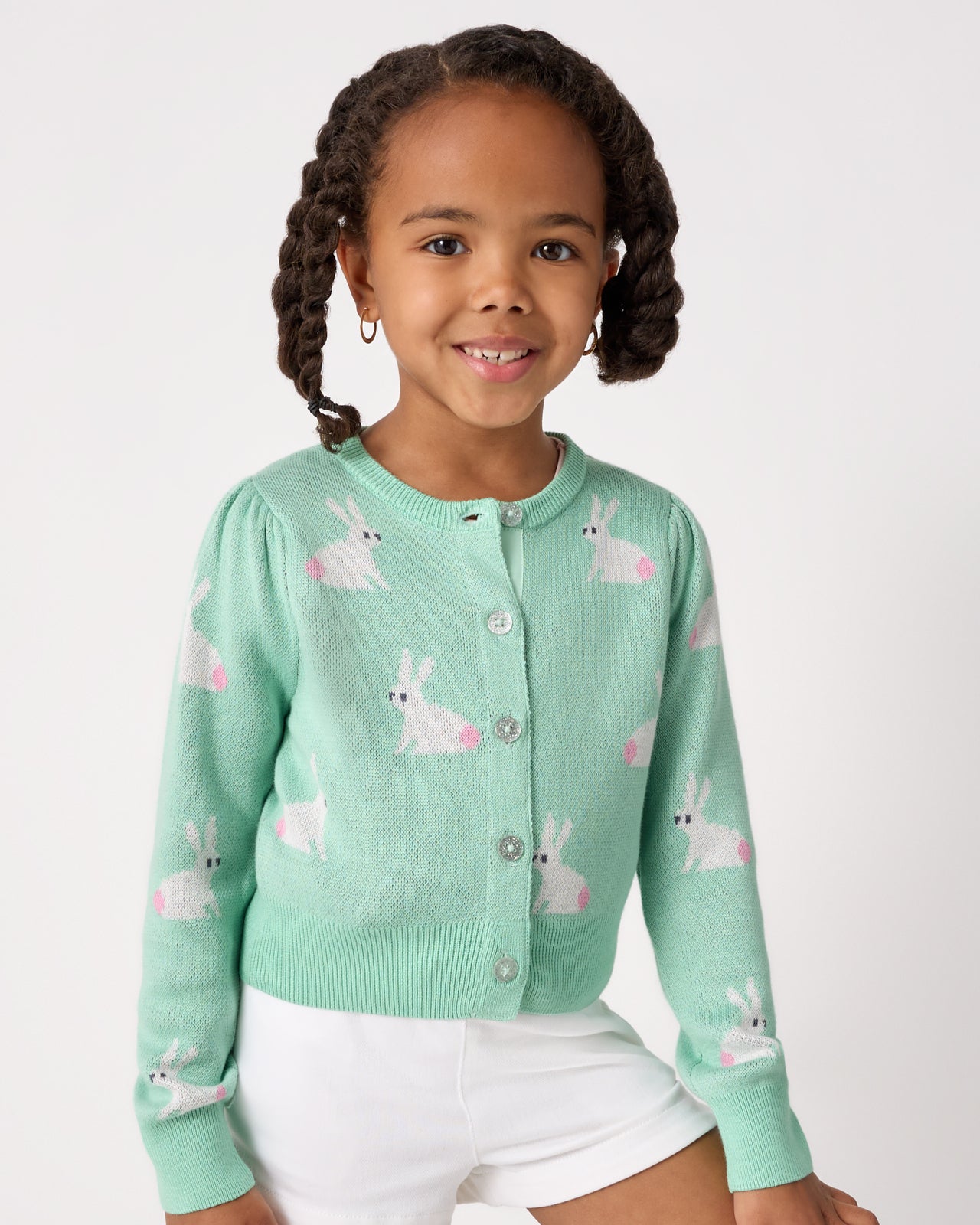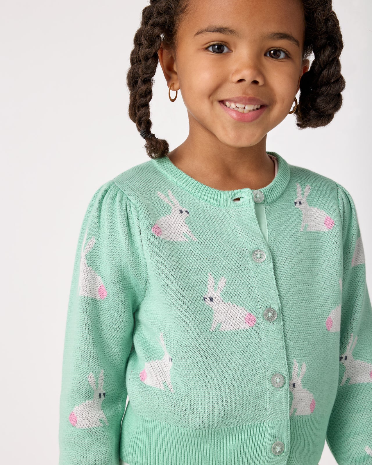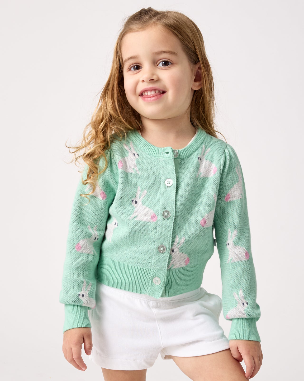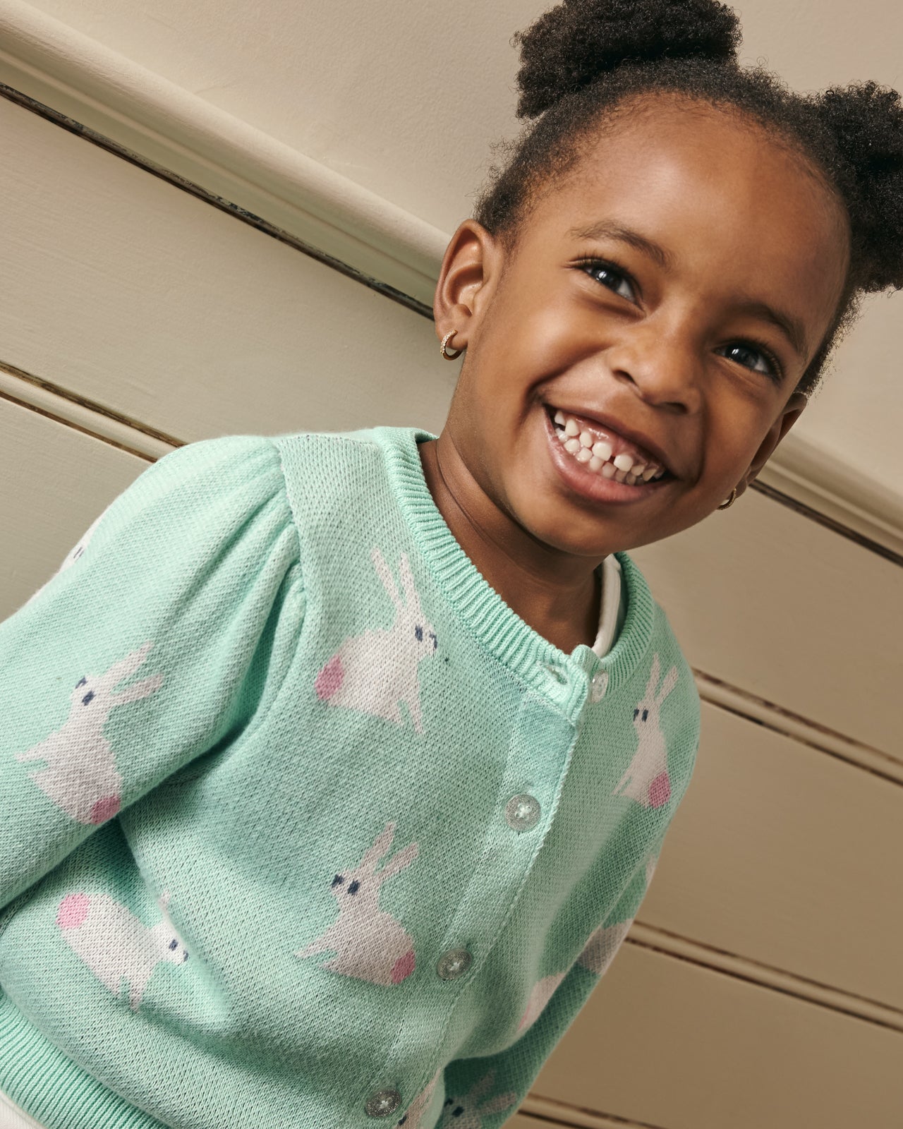 No bunny does it better. The Blush Bunnies Puff Sleeve Cardigan Sweater features sweet bunnies on mint Soluxe® Bamboo knit with glitter buttons that pop. This girls sweater has adorable puff sleeves and a classic button-front style. Layer it over their fave LS dresses for a picture-perfect Easter look!