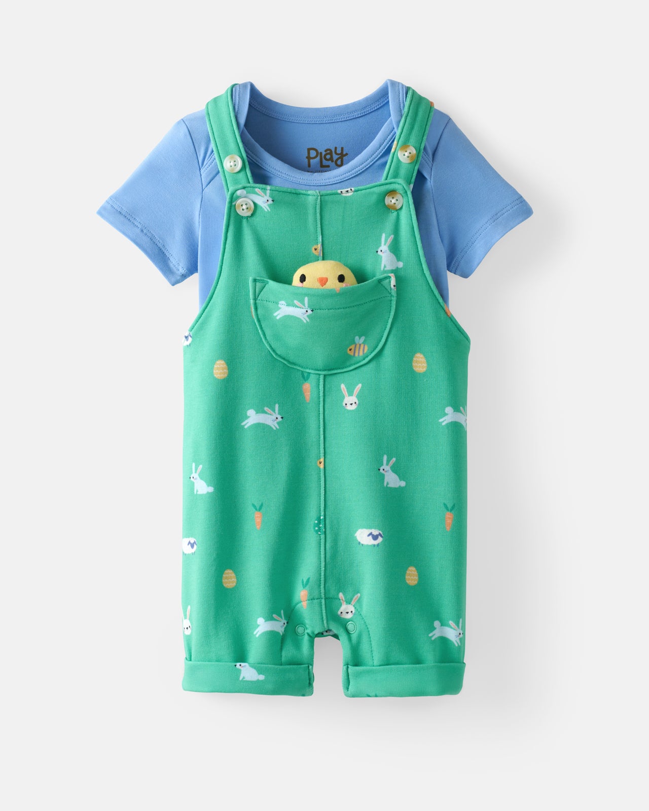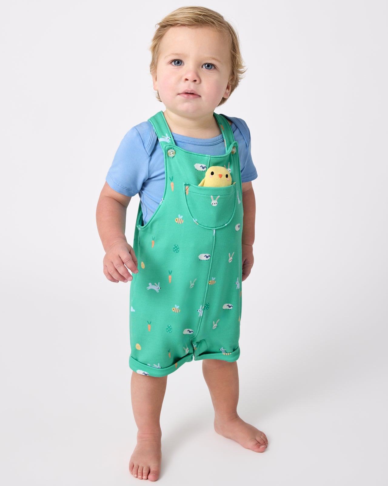 Hey. little chick! The Bunny Burrow Shorty Overall Set features playful bunnies. carrots. and Easter eggs on soft Soluxe® Bamboo with an adorable pouch pal peeping out to say hello. These baby overalls have adjustable straps and a coordinating bodysuit included. So perfect for their Easter outfit!