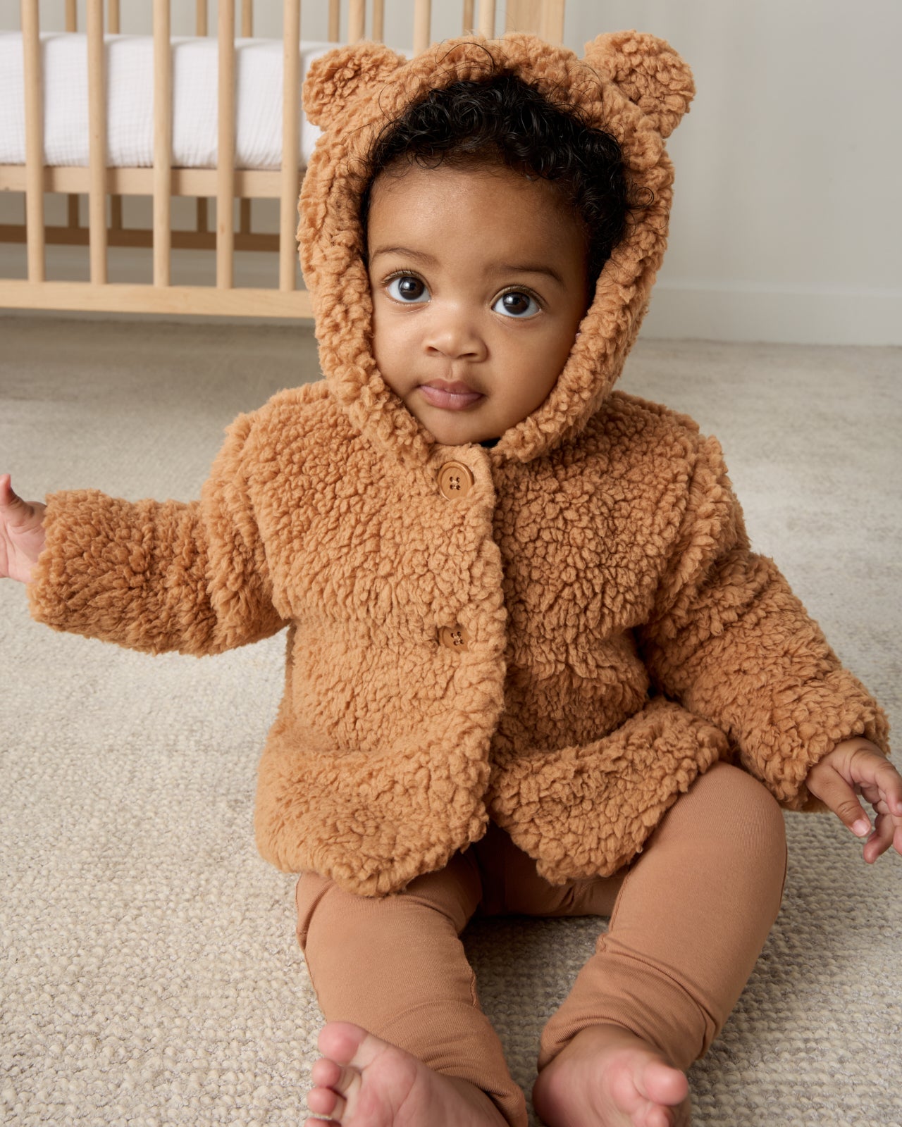 Keep your little cub cozy. This adorable Chestnut Brown Sherpa Baby Jacket is the softest winter essential for baby. Made from Soluxe® Bamboo sherpa. complete with two cute buttons. 3D bear ear details and a soft jersey lining. Bundle them up for winter adventures and get ready for all the awws!