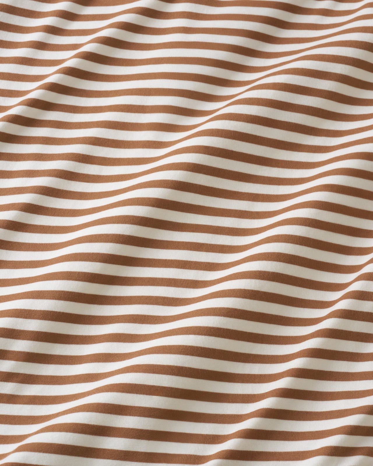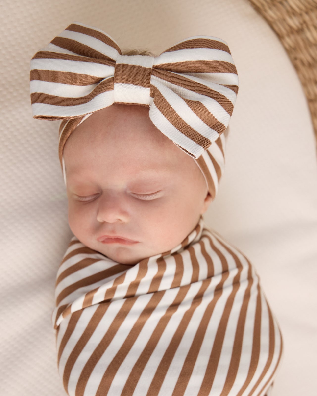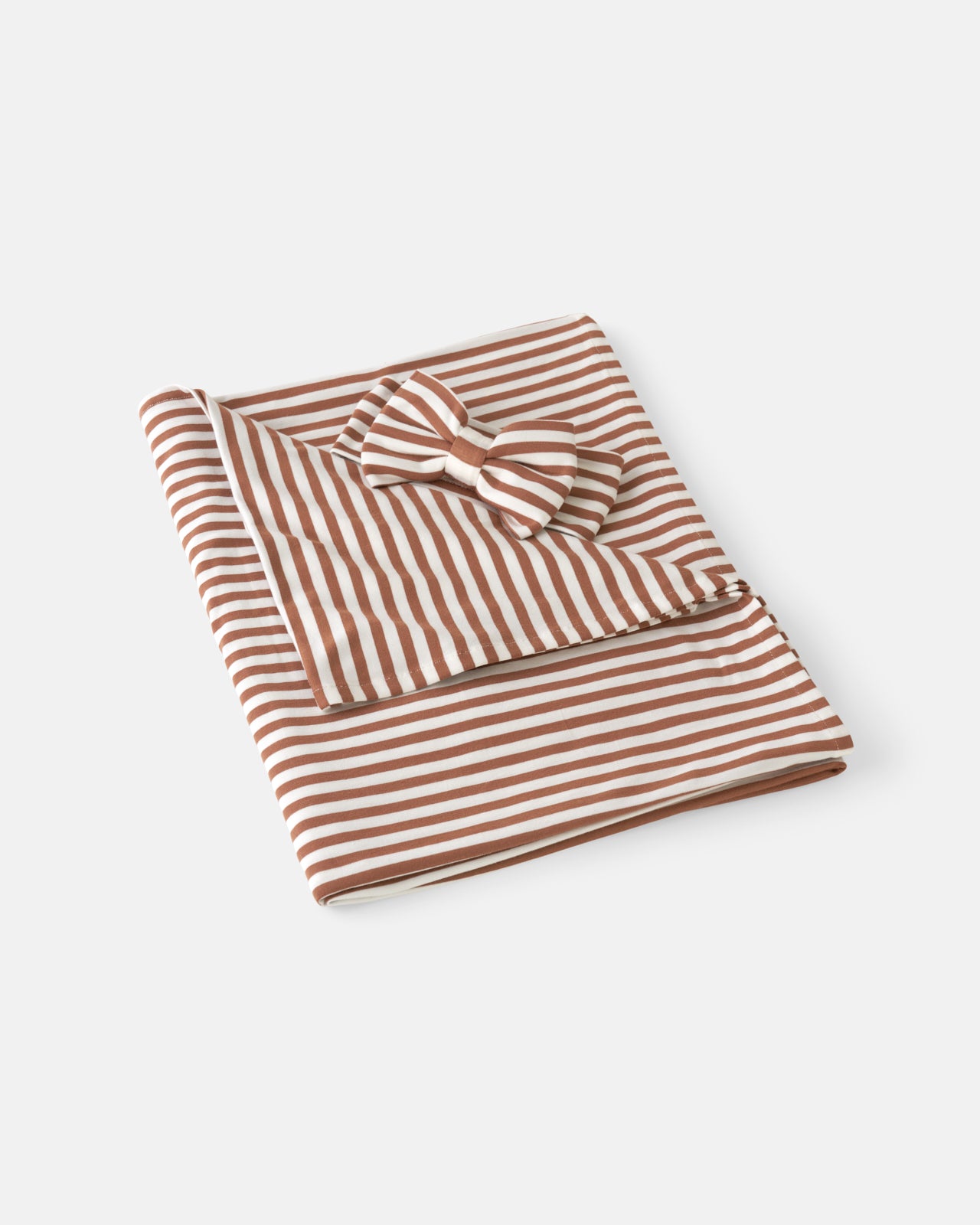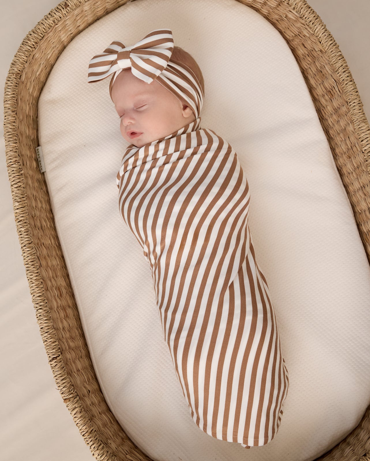 Keep baby cozy. from day one. The Chestnut Brown Stripe Swaddle & Luxe Bow Set is made from soft bamboo that’s breathable. hypoallergenic. and gentle on sensitive newborn skin. Its oversized design is so versatile and perfect for tummy time. The matching Luxe Bow adds a photo-worthy touch. Just the perfect baby shower gift!