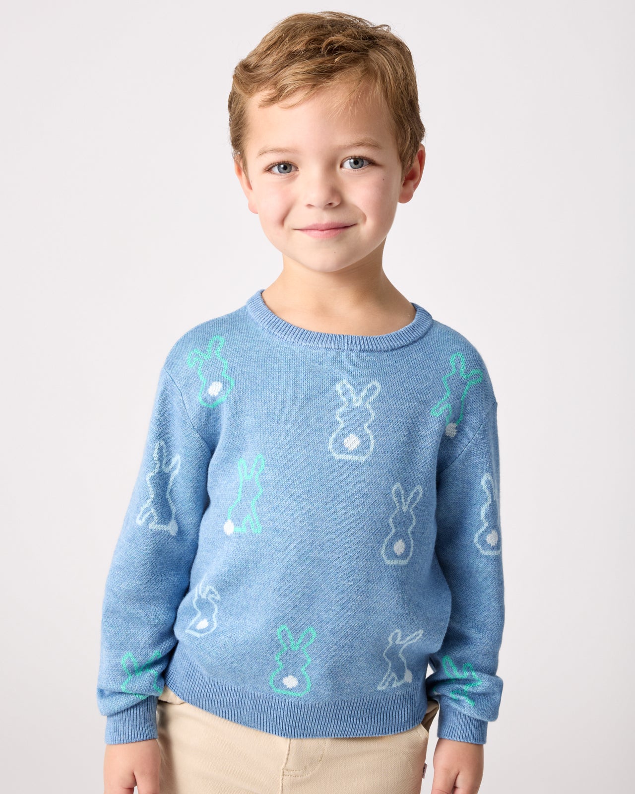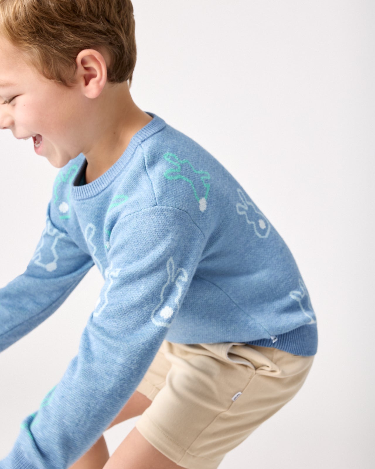 Bunny-soft for Easter. The Cozy Cottontails Sweater features subtle bunny outlines on cozy heather blue Soluxe? Bamboo knit. This kids sweater has a classic pullover style with a flat sewn-in tag for extra comfort. Pair it with their fave LS bottoms for springtime adventures!