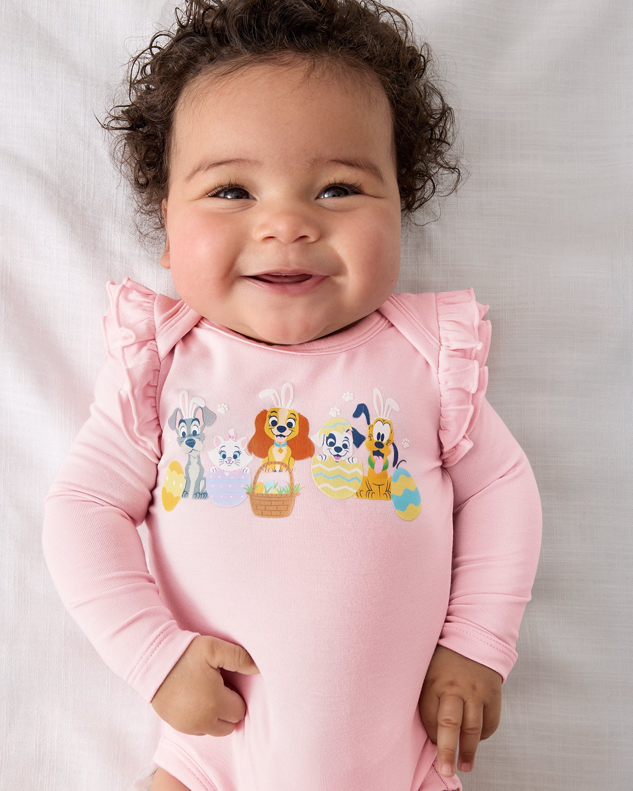 Ready for Easter! The Disney Peekaboo Pets Flutter Bodysuit features a sweet graphic with beloved Disney pets from their favorite movies with bunny ears and Easter eggs. Made from durable Soluxe? Bamboo. this pastel pink baby bodysuit has flutter sleeves. lap shoulders. and a snappable bottom for easy changes. Grab the matching Flutter Tee for sibling moments!