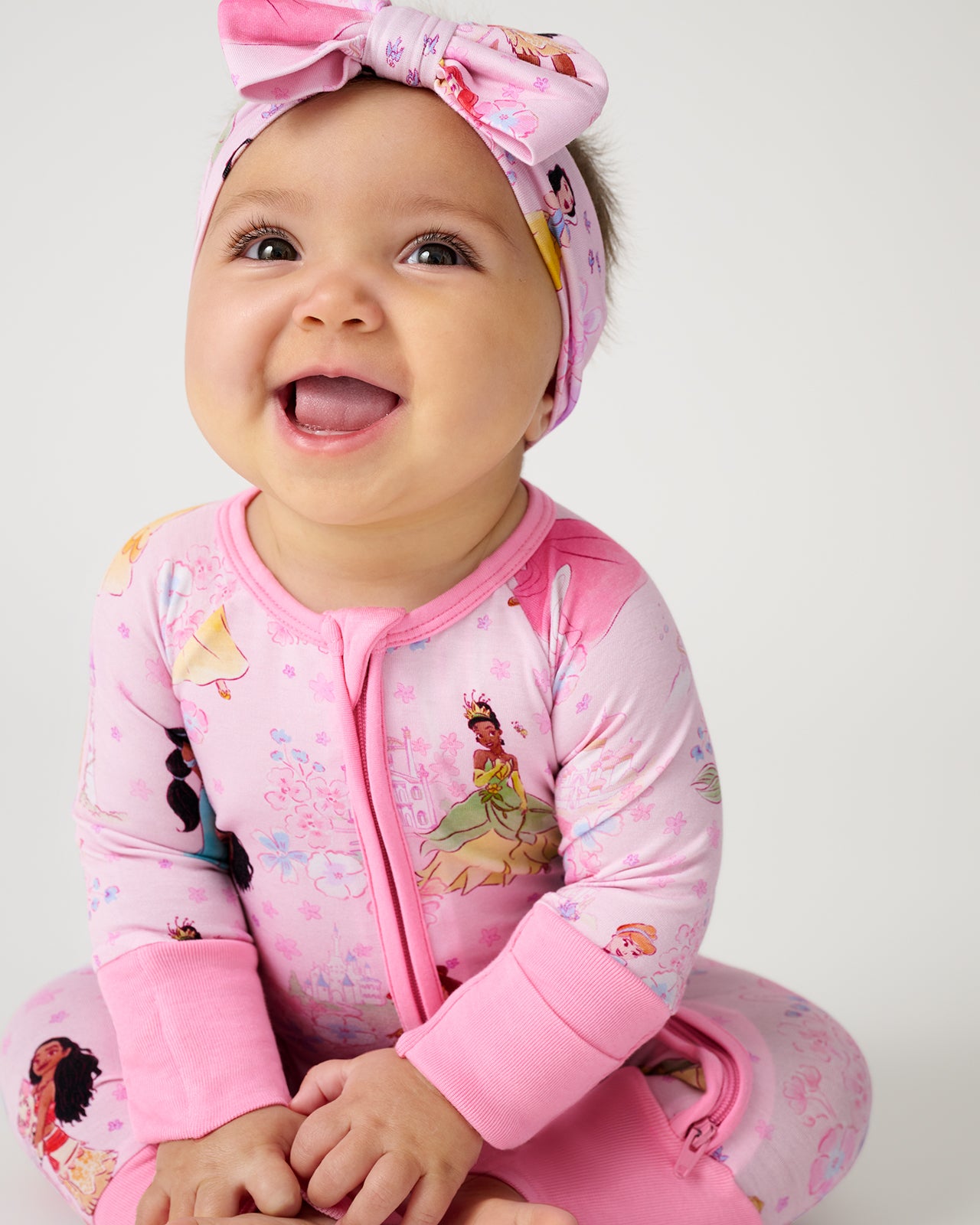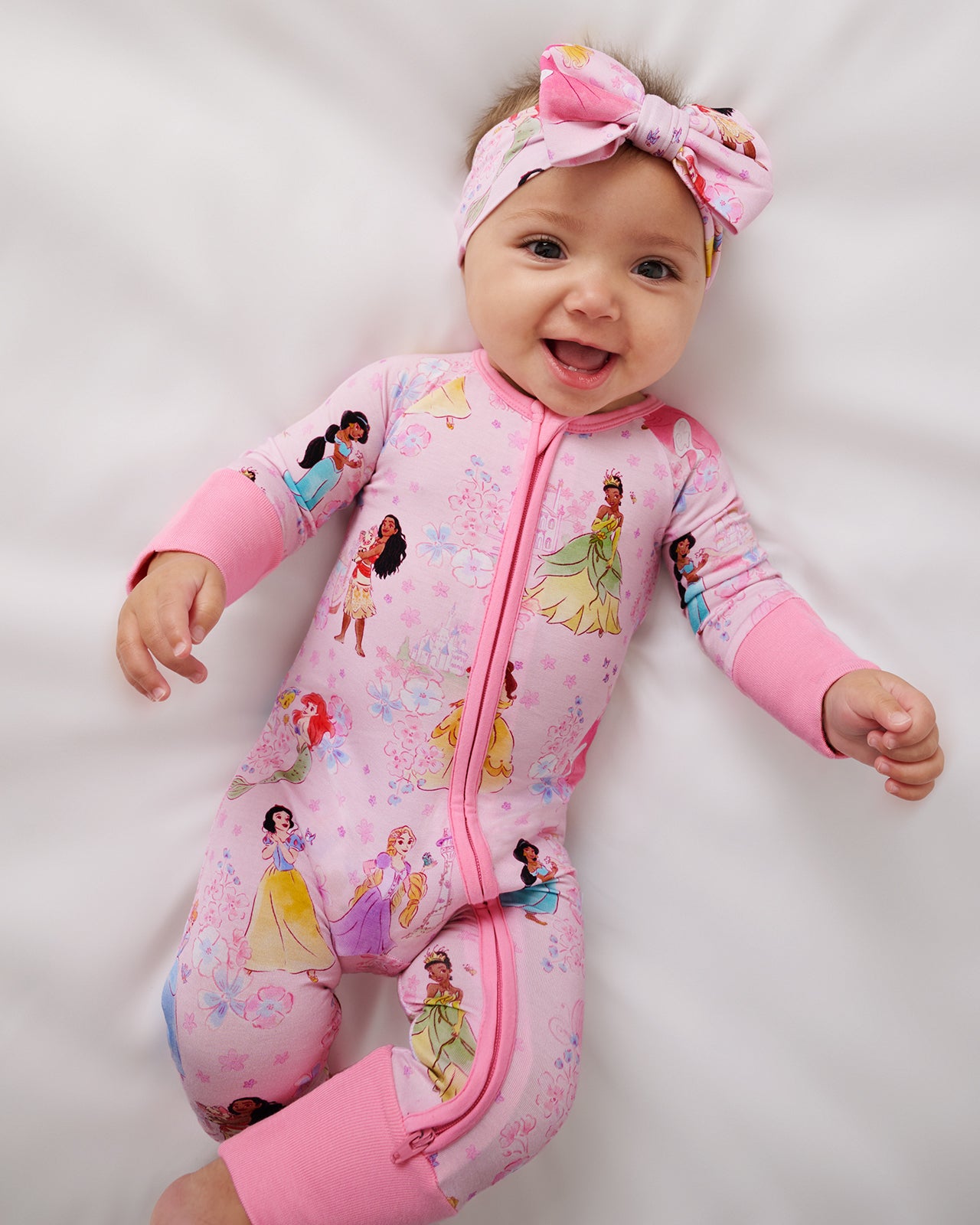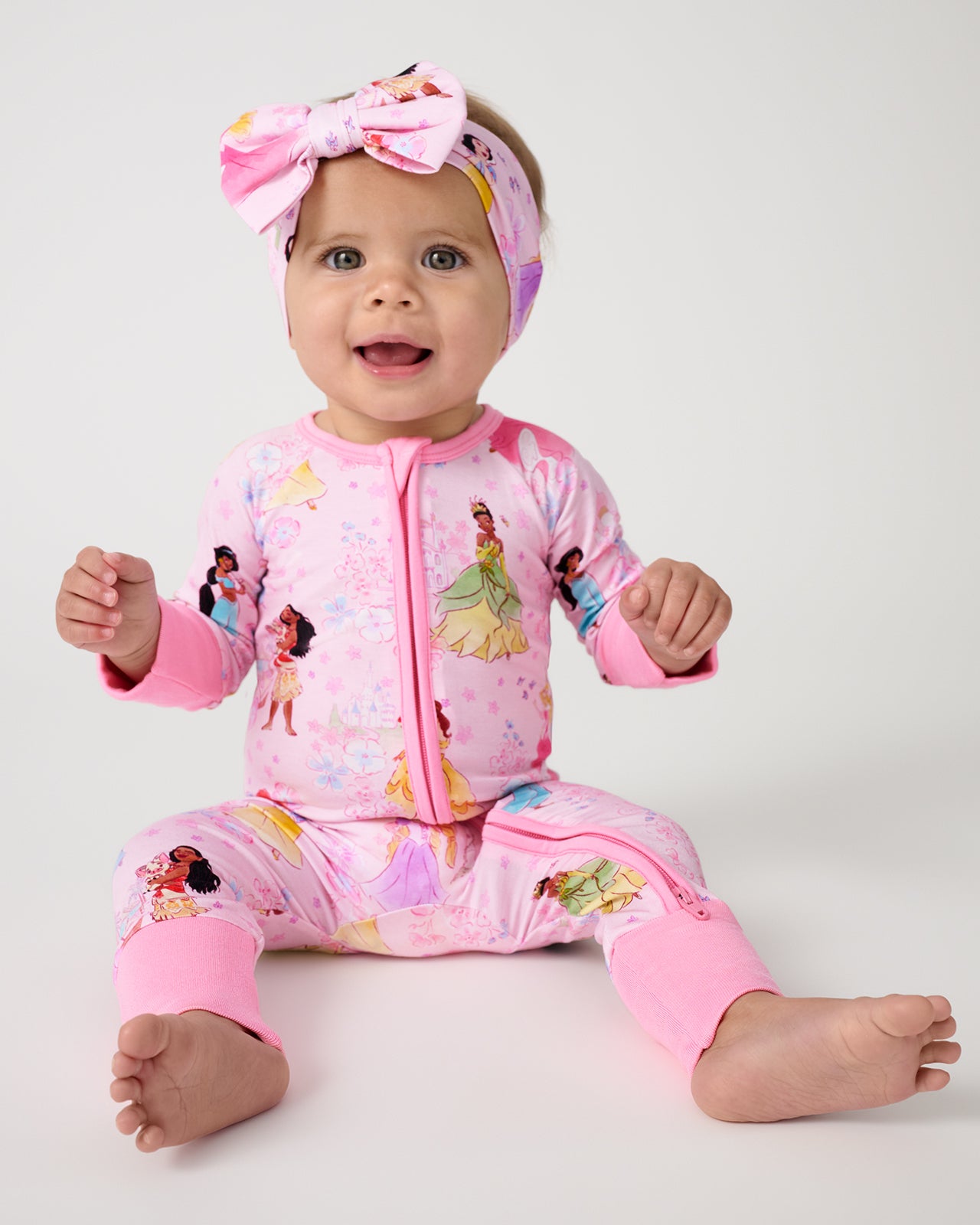Softly ever after. The Disney Princess Garden Zippy features beloved Disney Princesses on an enchanting pink floral backdrop. Made from ultra-soft Lunaluxe® Bamboo that’s gentle on sensitive skin. this bamboo baby sleeper keeps them comfy with fold-over mittens. convertible foot cuffs. and an easy double zipper. Perfect for story time and family matching!