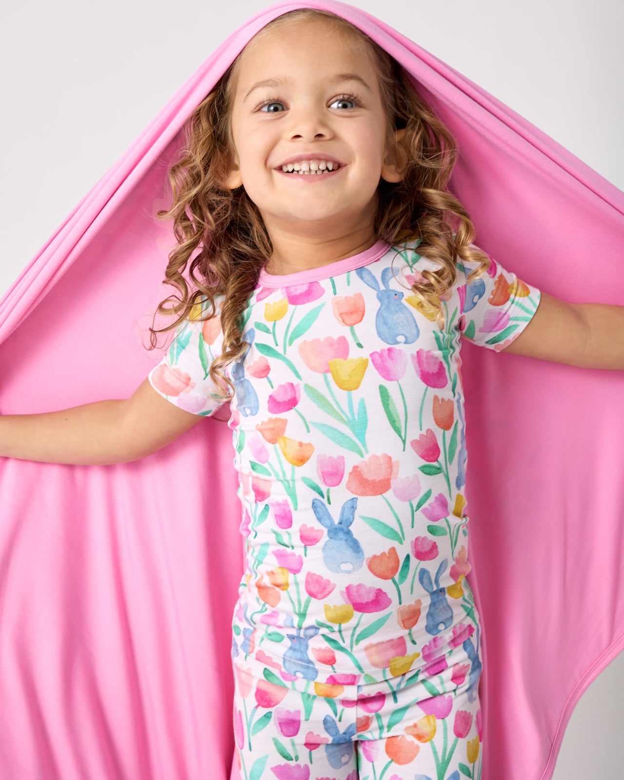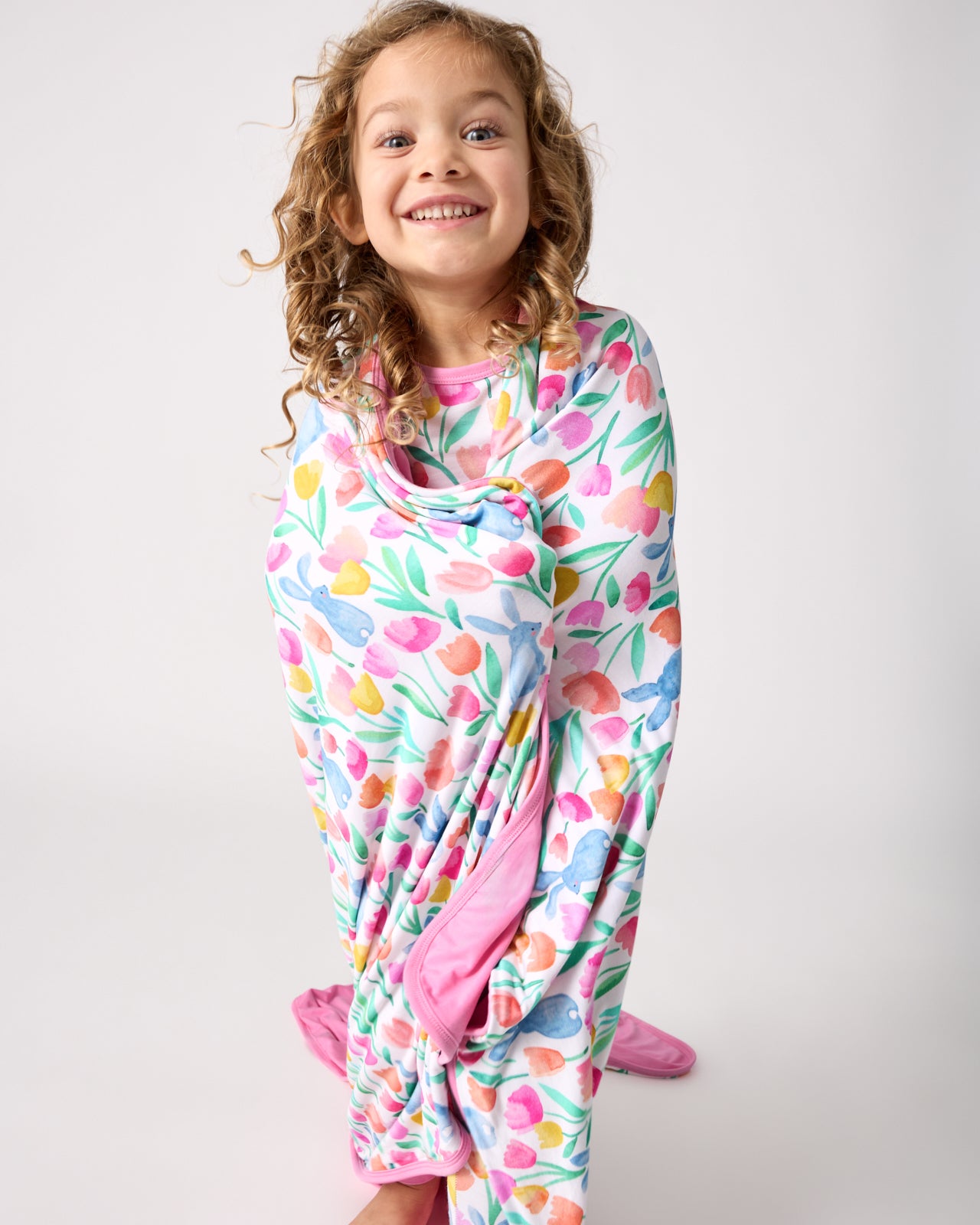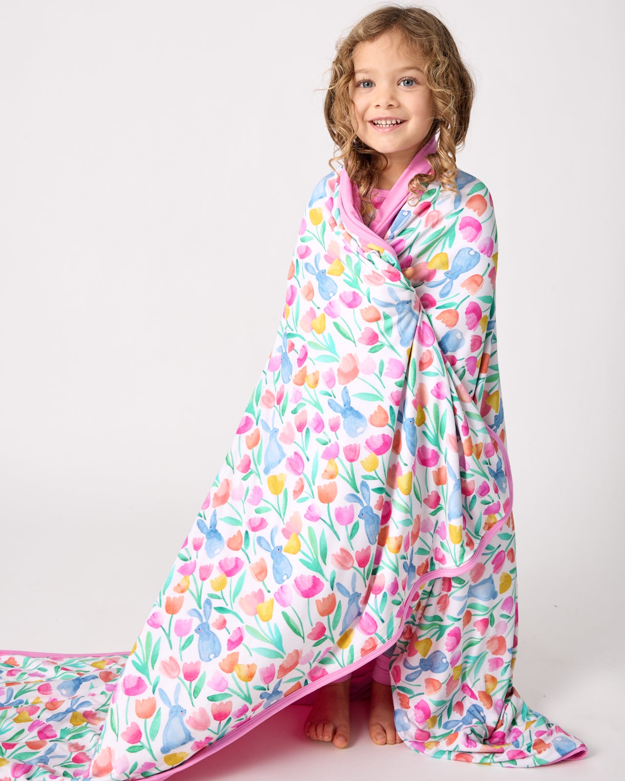 Springtime snuggles. Made from triple-layered Lunaluxe? Bamboo. the Garden Hop Large Cloud Blanket? is ultra-soft and perfect for together-time on the couch. Featuring watercolor tulips and sweet bunnies with a coordinating pink shade on the back. Pair with the matching PJs!