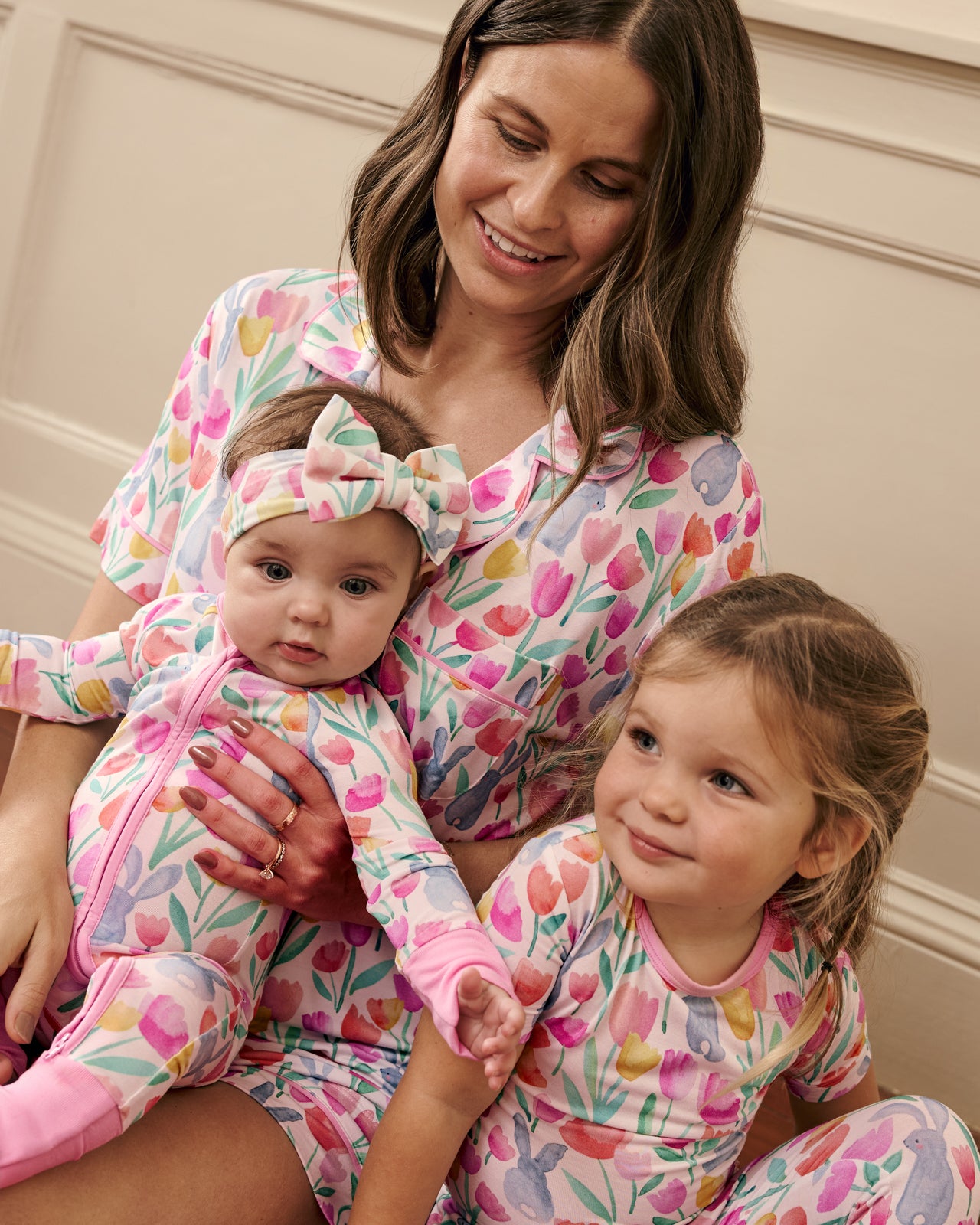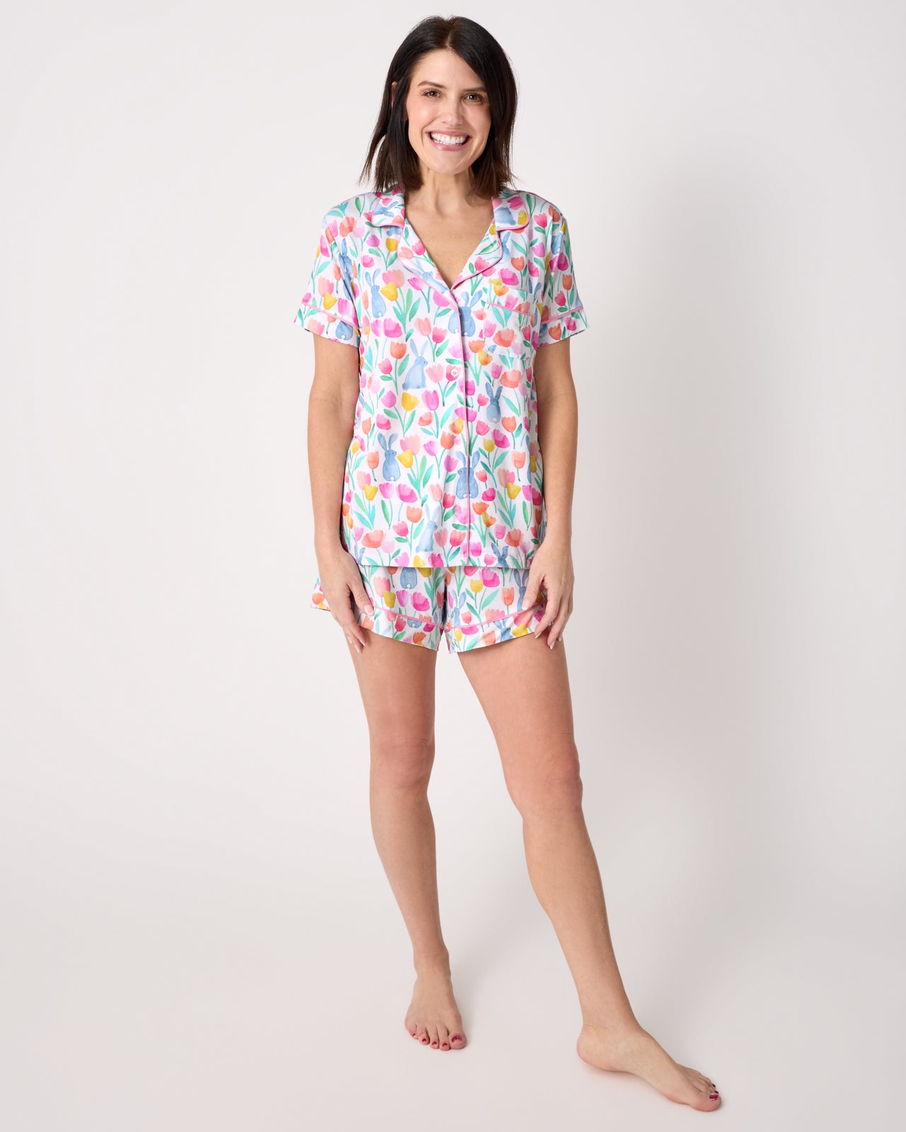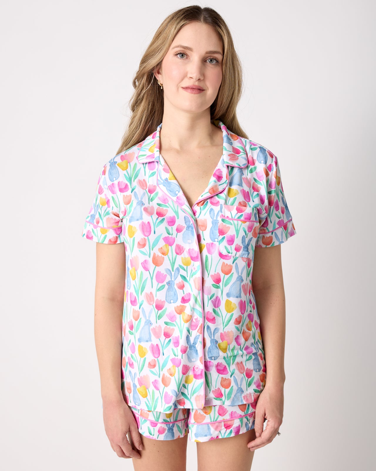 Springtime soft. The Garden Hop Women’s Pajama Set features watercolor tulips and sweet bunnies on a fresh white background. Made from ultra-soft Lunaluxe® Bamboo. this matching pajama set has a button-down top for easy nursing access and relaxed shorts with a bump-friendly waistband. The contrast piping detail and notched collar are the perfect finishing touches. So cute for Easter morning!