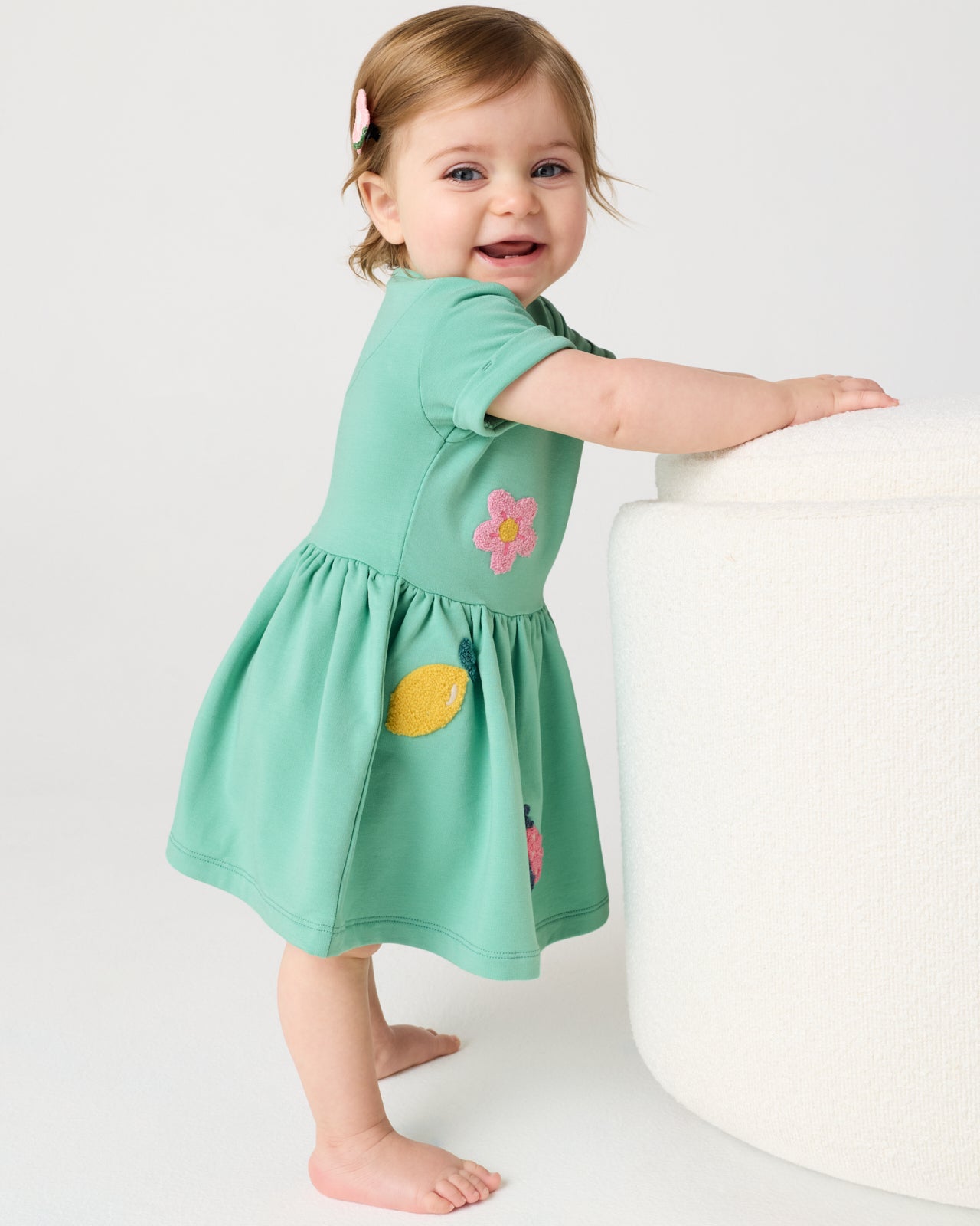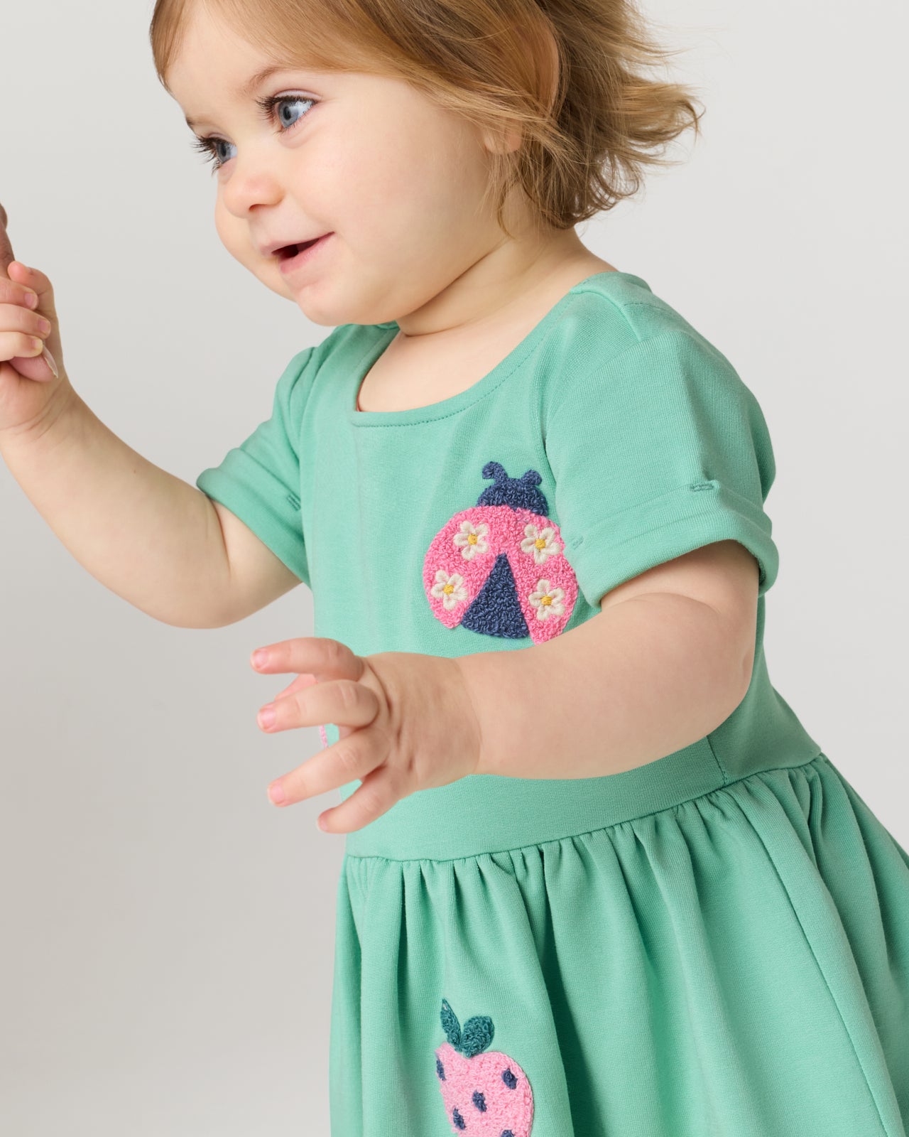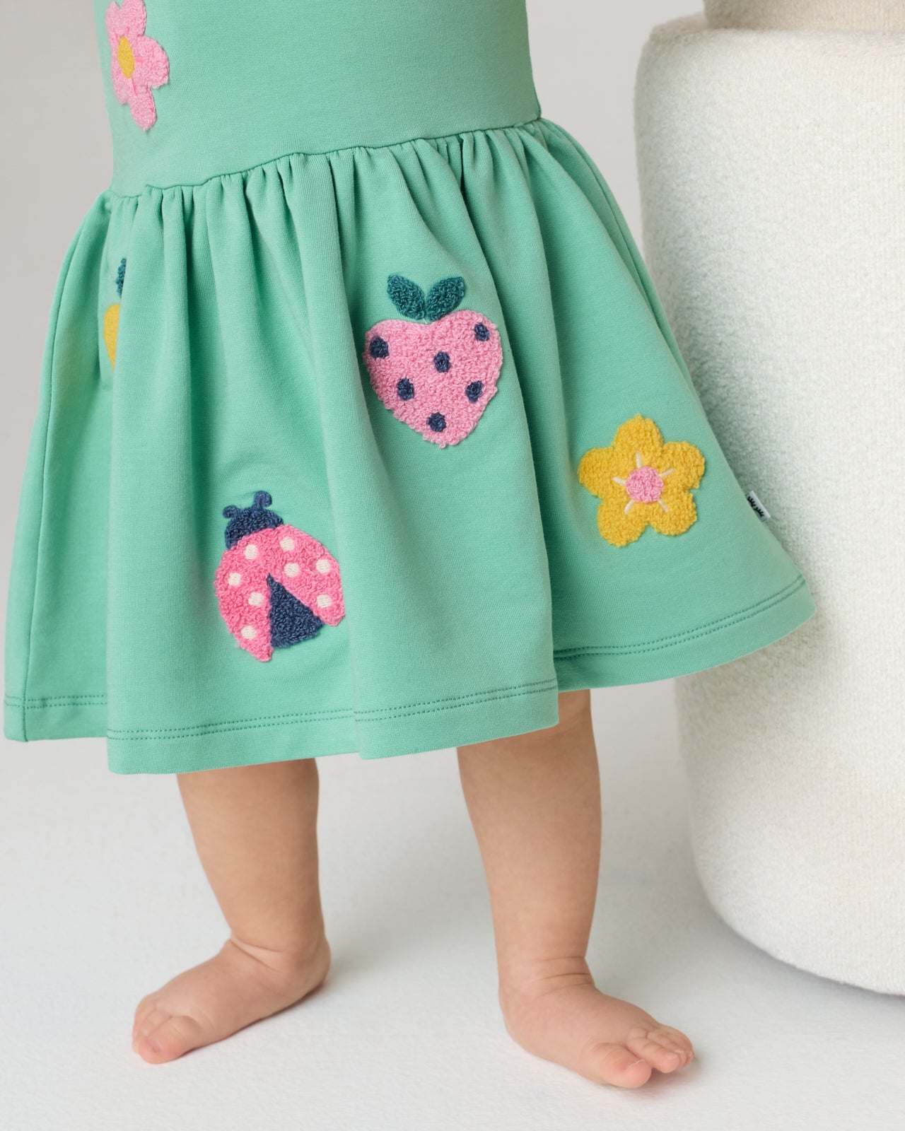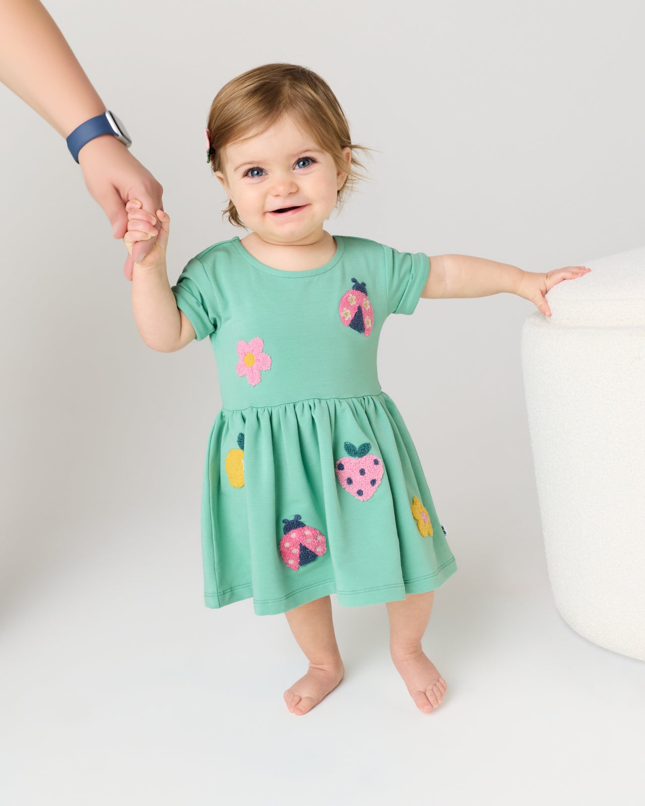All the spring things! The Garden Party Short Sleeve Dress with Bloomer features ladybugs. strawberries. lemons. and flower appliqués on a fresh jade green. Made from durable Soluxe® Bamboo. this toddler dress includes a matching bloomer for easy diaper coverage. So sweet for sibling matching!