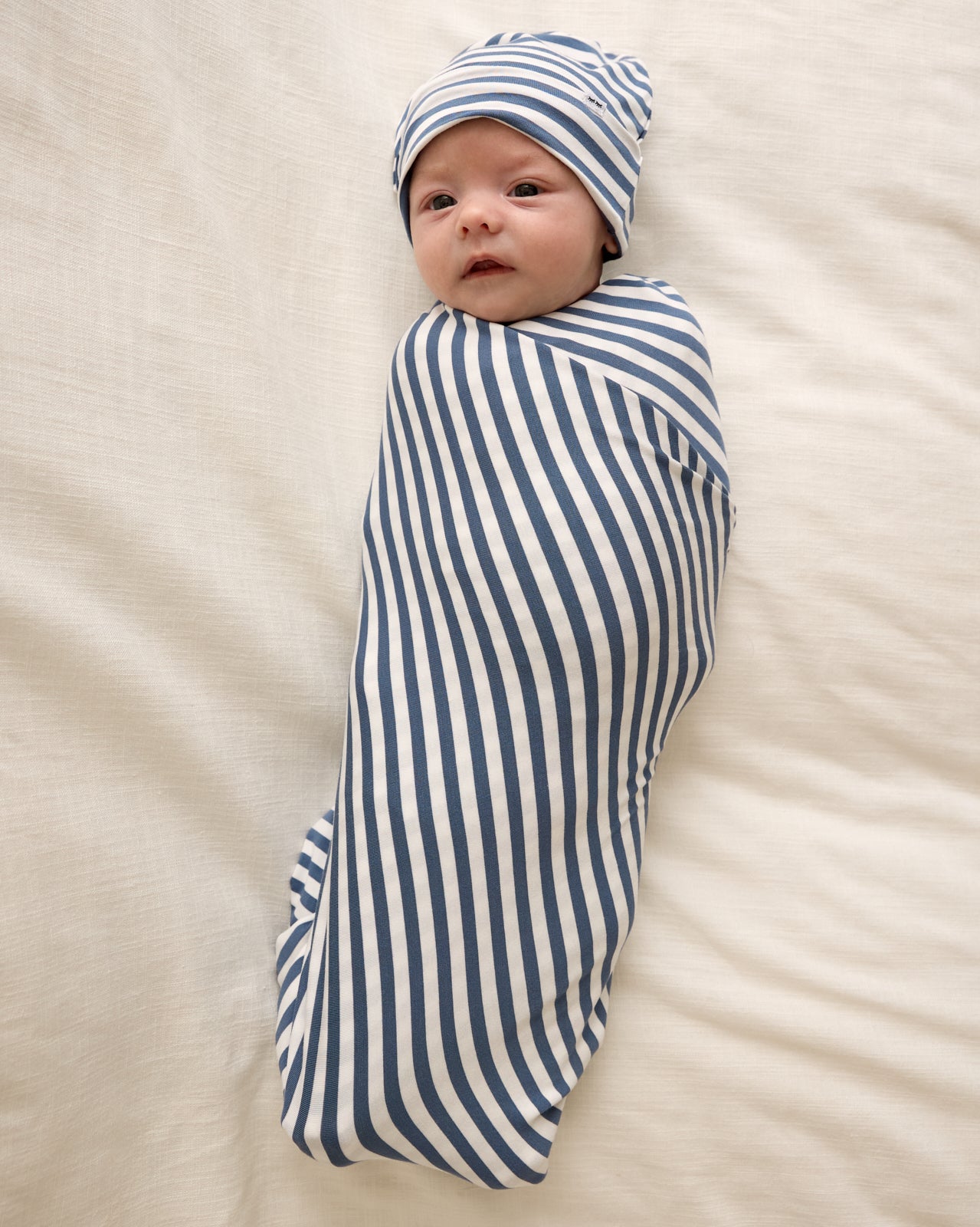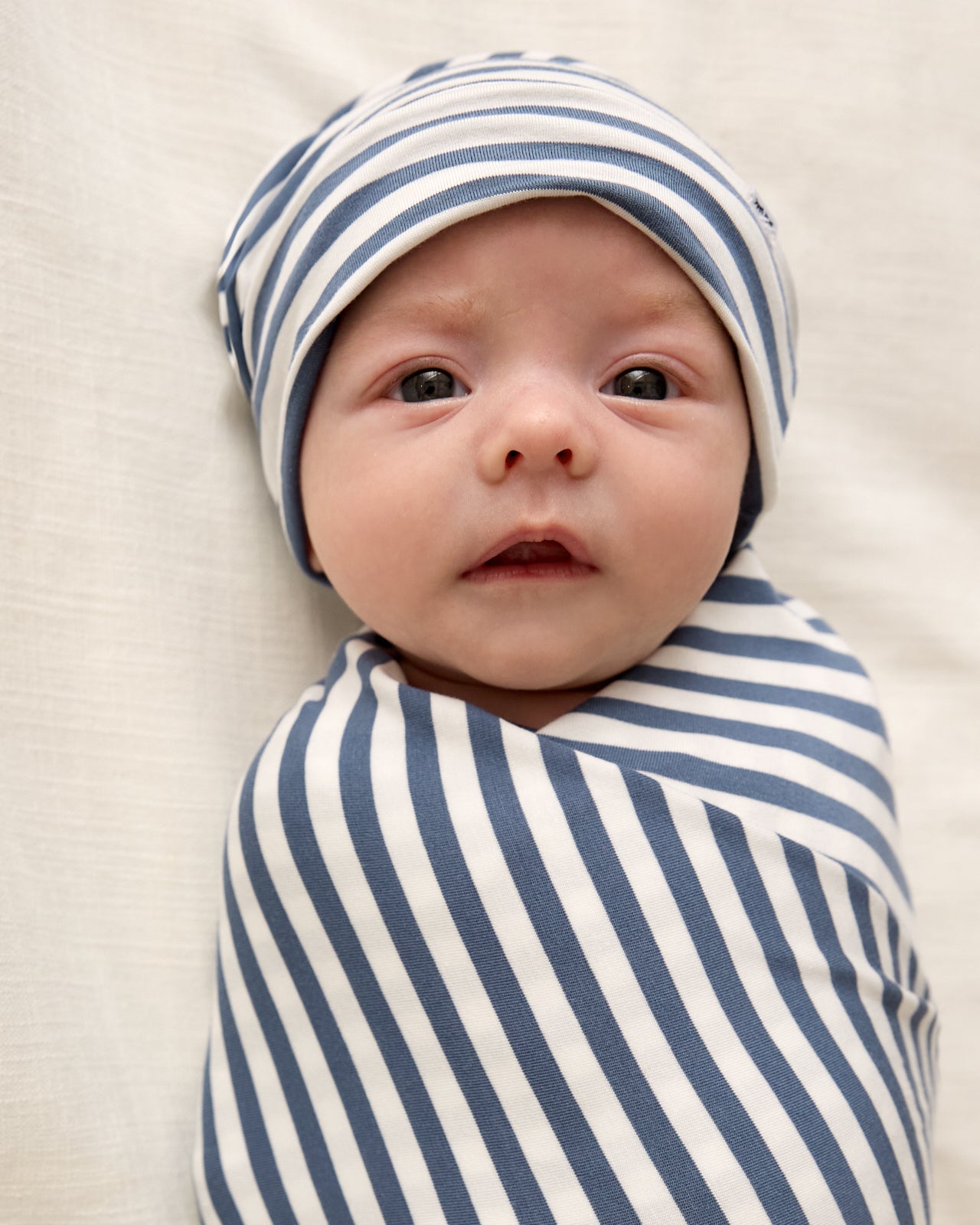 Keep baby cozy. from day one. The Hazy Blue Stripe Swaddle & Infant Beanie Set is made from soft bamboo that’s breathable. hypoallergenic. and gentle on sensitive newborn skin. Its oversized design is so versatile and perfect for tummy time. The matching beanie features a fold-over brim for little heads of all sizes. Just the perfect baby shower gift!