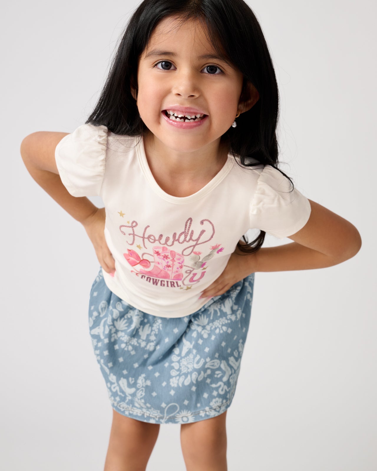 Calling all cowgirls! The Howdy Cowgirl Puff Sleeve Tee features the cutest western graphic with Howdy Cowgirl text overlay. Made from durable Soluxe® Bamboo. this girls t shirt has adorable puff cap sleeves and a slim fit. Pair it with the Bandana Blues Denim Skort for the cutest spring look!