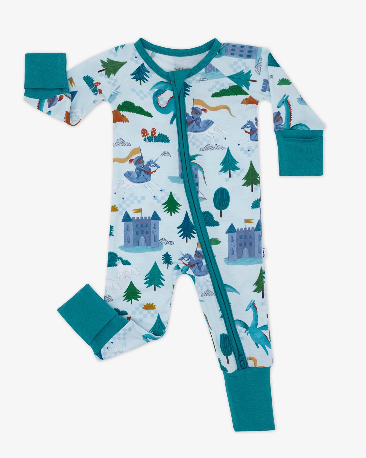 Quest for the coziest dreams! The Knight’s Quest Zippy features knights. dragons. and castles that will inspire your little hero’s bedtime adventures. Made from buttery soft Lunaluxe? Bamboo that’s gentle on sensitive skin. this bamboo baby sleeper keeps them comfy with fold-over mittens. convertible foot cuffs. and an easy double zipper. Perfect for family matching!