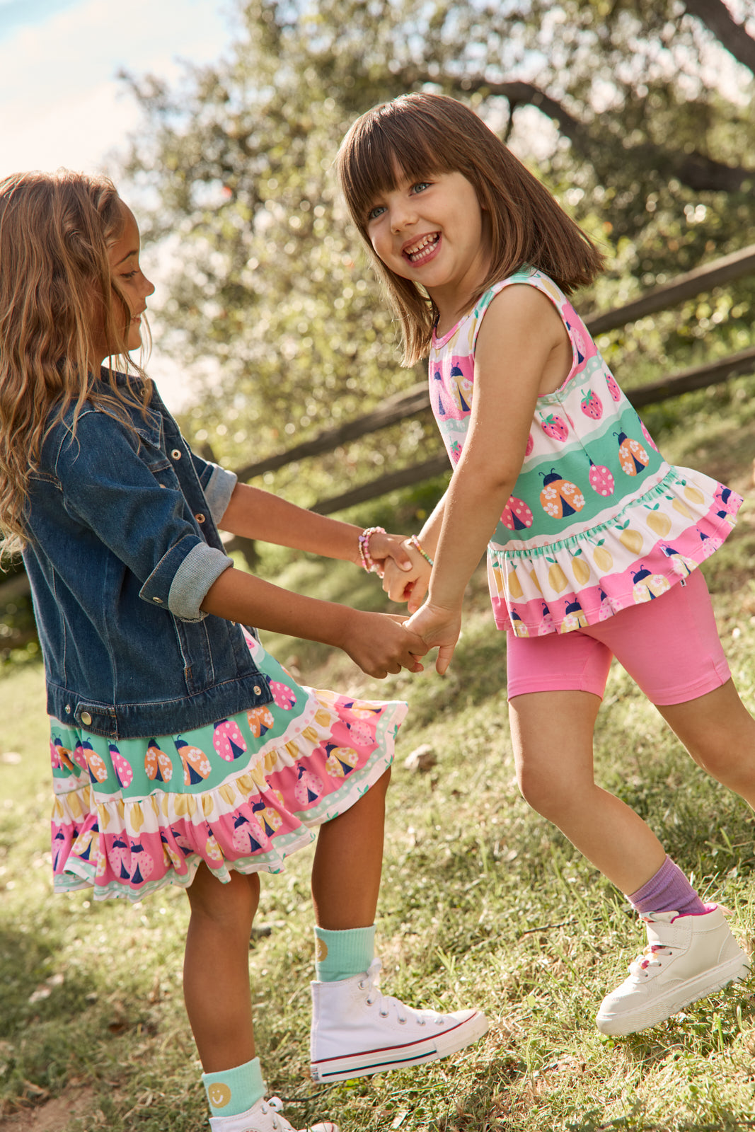 Warm weather ready. The Ladybug Lane Peplum Tank features ladybugs. strawberries. and other springtime motifs in a colorful stripe pattern. Made from durable Soluxe® Bamboo with a relaxed fit perfect for longer days. Pair it with the Sweet Pink Bike Shorts!