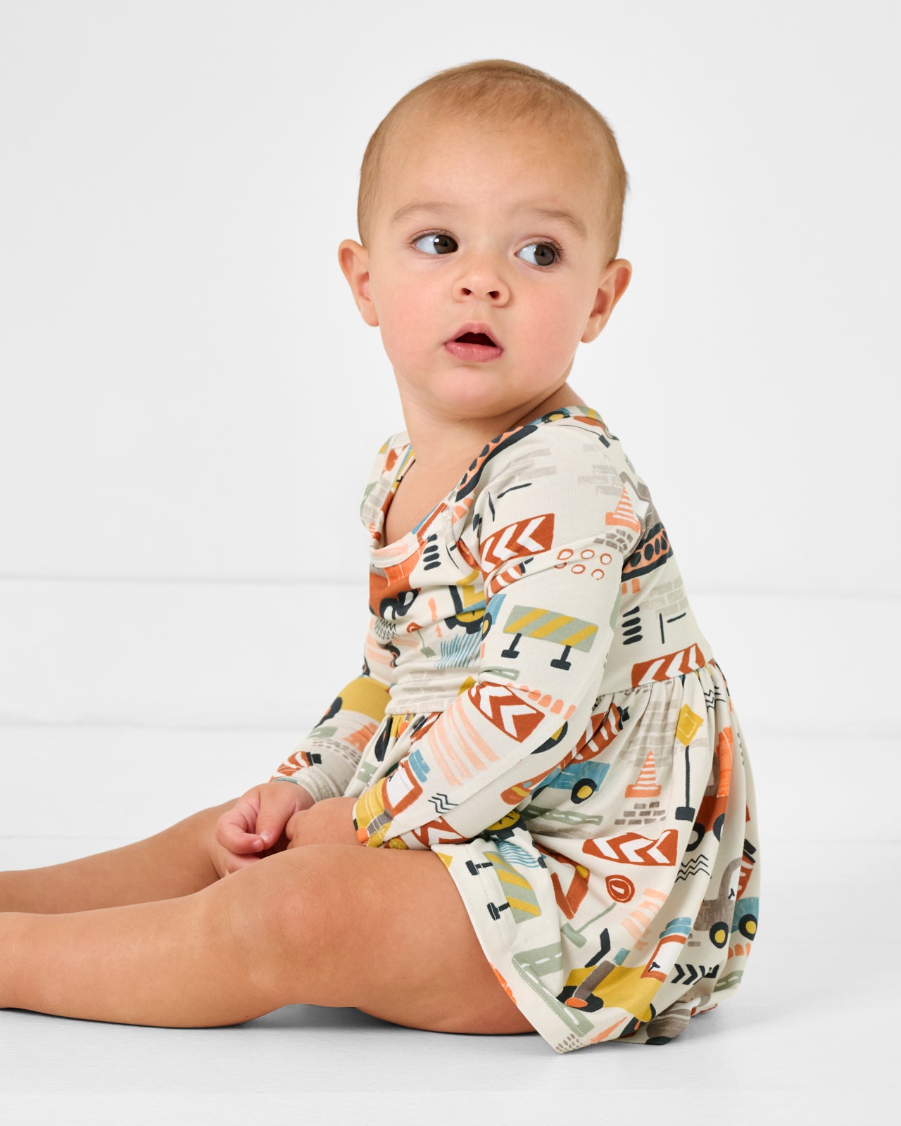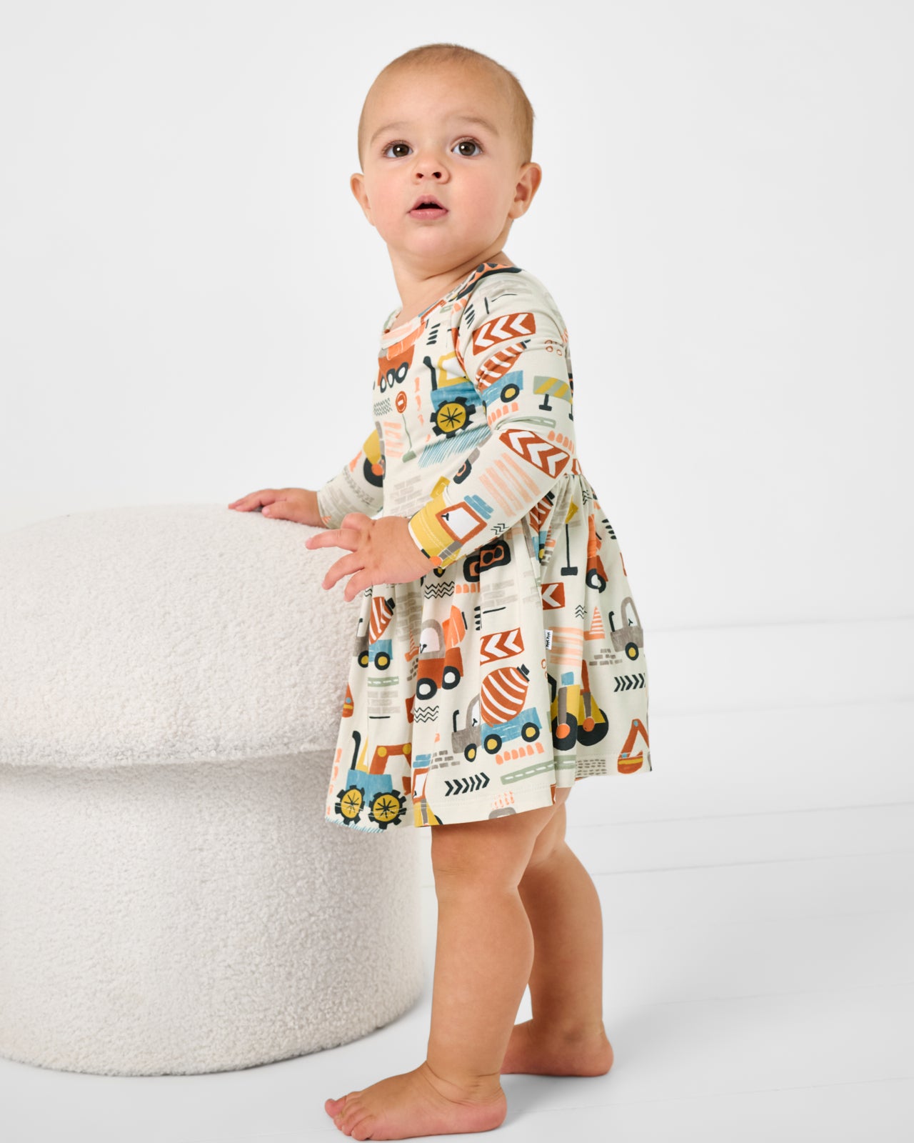 Let’s build something together! The Mini Builders Skater Dress features construction zone cuteness your little builder will love. Made from durable Soluxe® Bamboo with a hidden snappable bodysuit for easy changes. this toddler dress is perfect for sibling matching or playdates with the crew!
