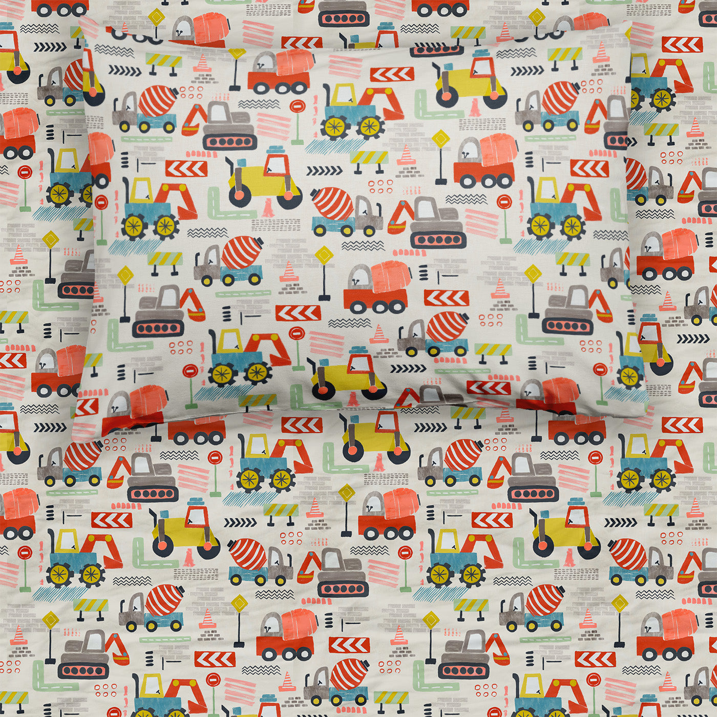 Mini Builders is cream and features cement trucks. excavators. road rollers. traffic cones. and more.