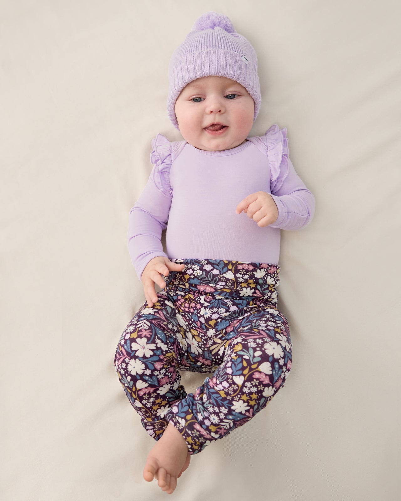 The prettiest anytime essential. The Misty Lavender Flutter Bodysuit is made from soft. durable bamboo with a snug fit. This adorable newborn bodysuit features lap shoulders for easy dressing and fold-over mittens to protect delicate skin from tiny scratches. The flutter details at shoulders add a photo-worthy touch. while snap closures make diaper changes a breeze.