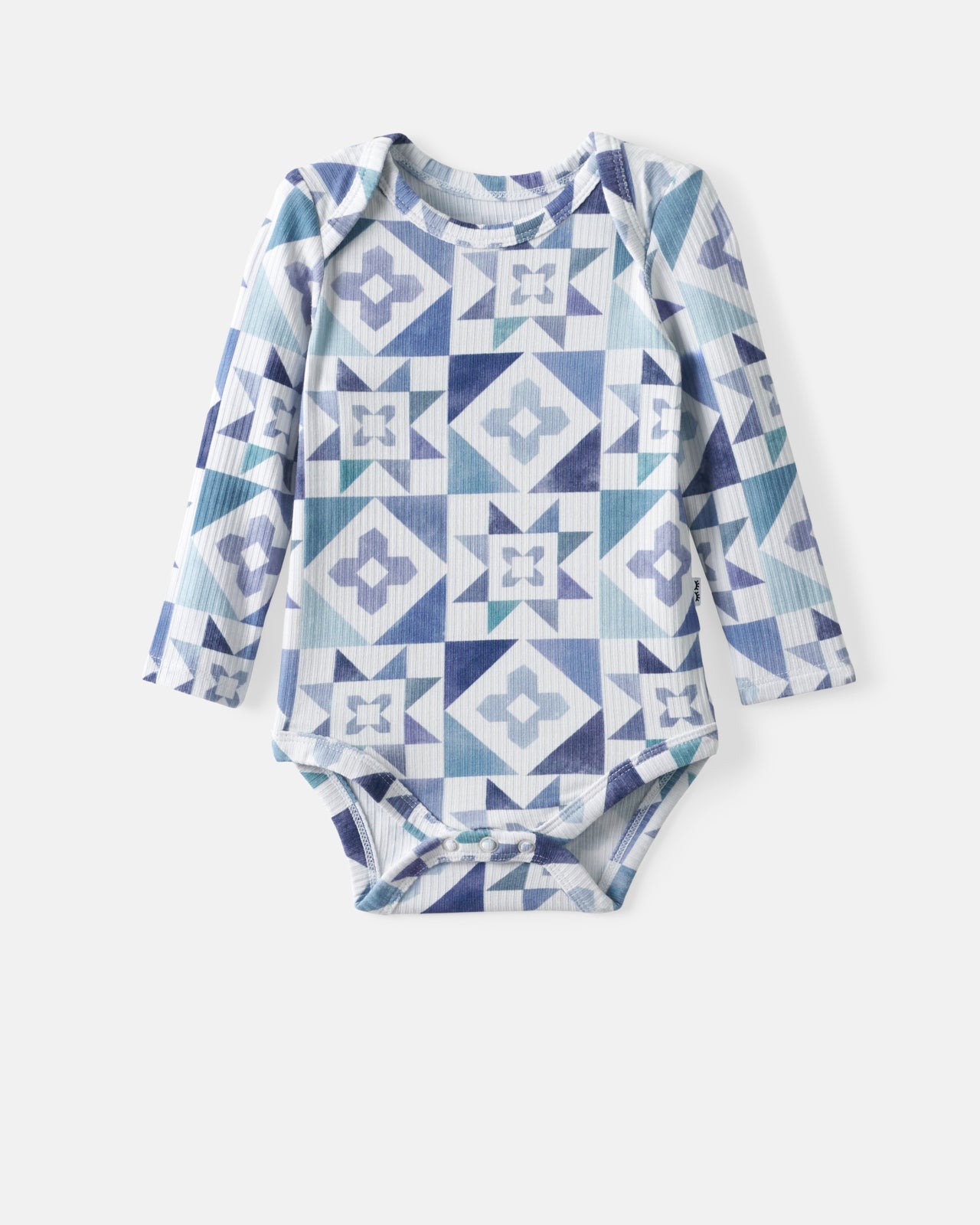 Patched together with love. The Patchwork Indigo Ribbed Bodysuit features a mosaic print in denim-inspired blues. Made from soft ribbed Soluxe® Bamboo that’s gentle on sensitive skin. this baby bodysuit has a snappable bottom for easy changes. Grab matching styles for sibling moments!