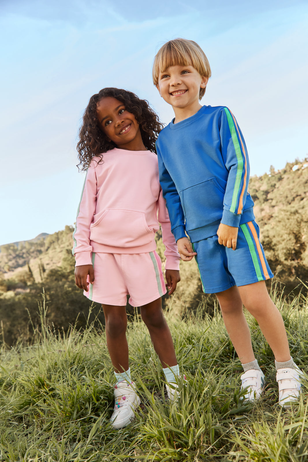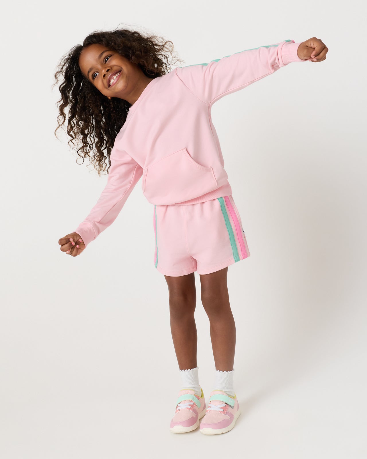 Everyday style. with a twist. The Pink Blossom Side Stripe Short features a soft pink hue with colorful retro stripes on the sides. Made from durable Soluxe® Bamboo with an easy pull-on style and comfy fit. Pair them with the Pink Blossom Pocket Crewneck for a go-to spring set!