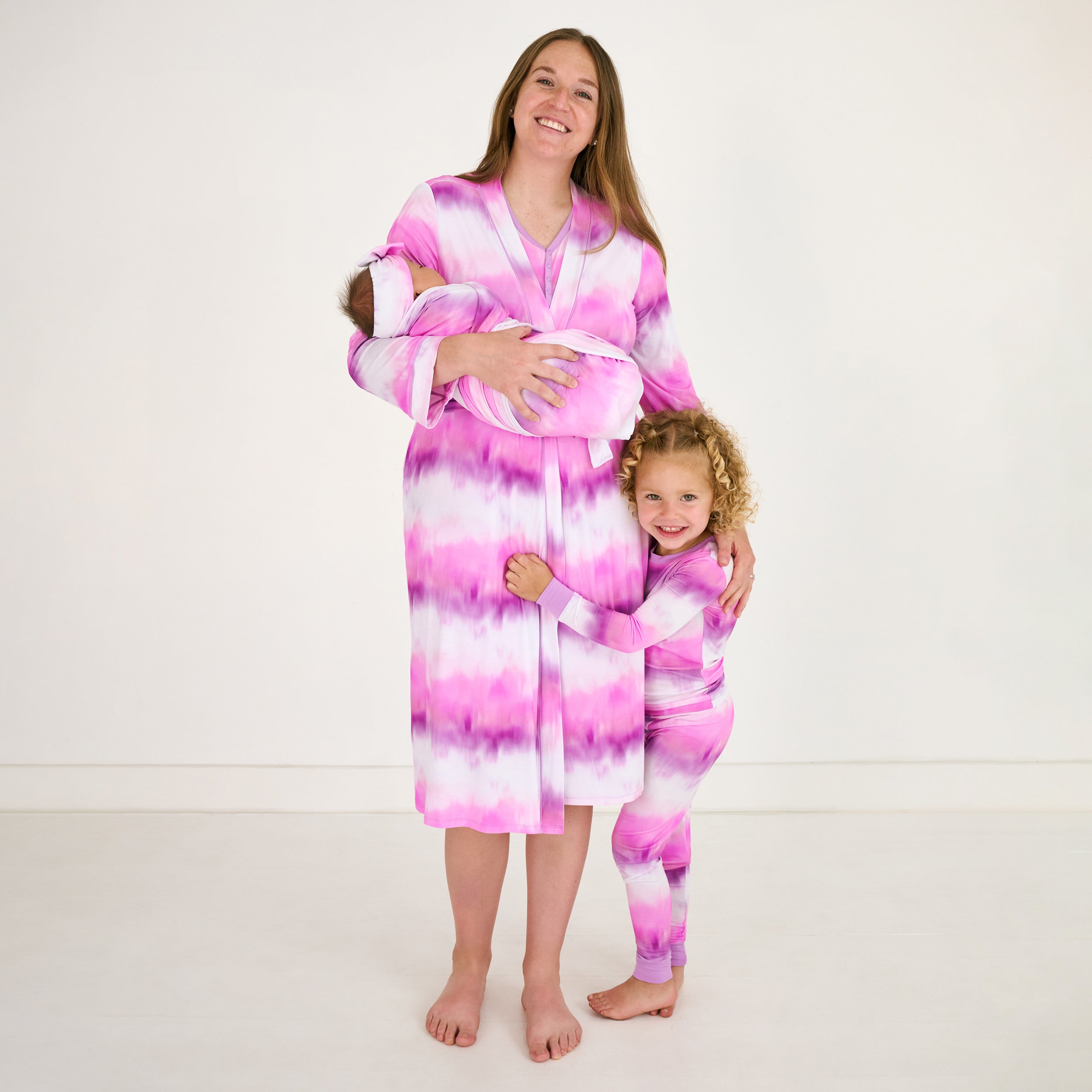 Cozy up in cosmic comfort! This women’s bamboo robe features soothing watercolor waves in a pink ombr?? design. Made from custom-milled Lunaluxe? Bamboo. it boasts two side pockets. contrast piping details. and a relaxed. bump-friendly fit. Pair it with the matching PJs for the dreamiest mornings with the fam!