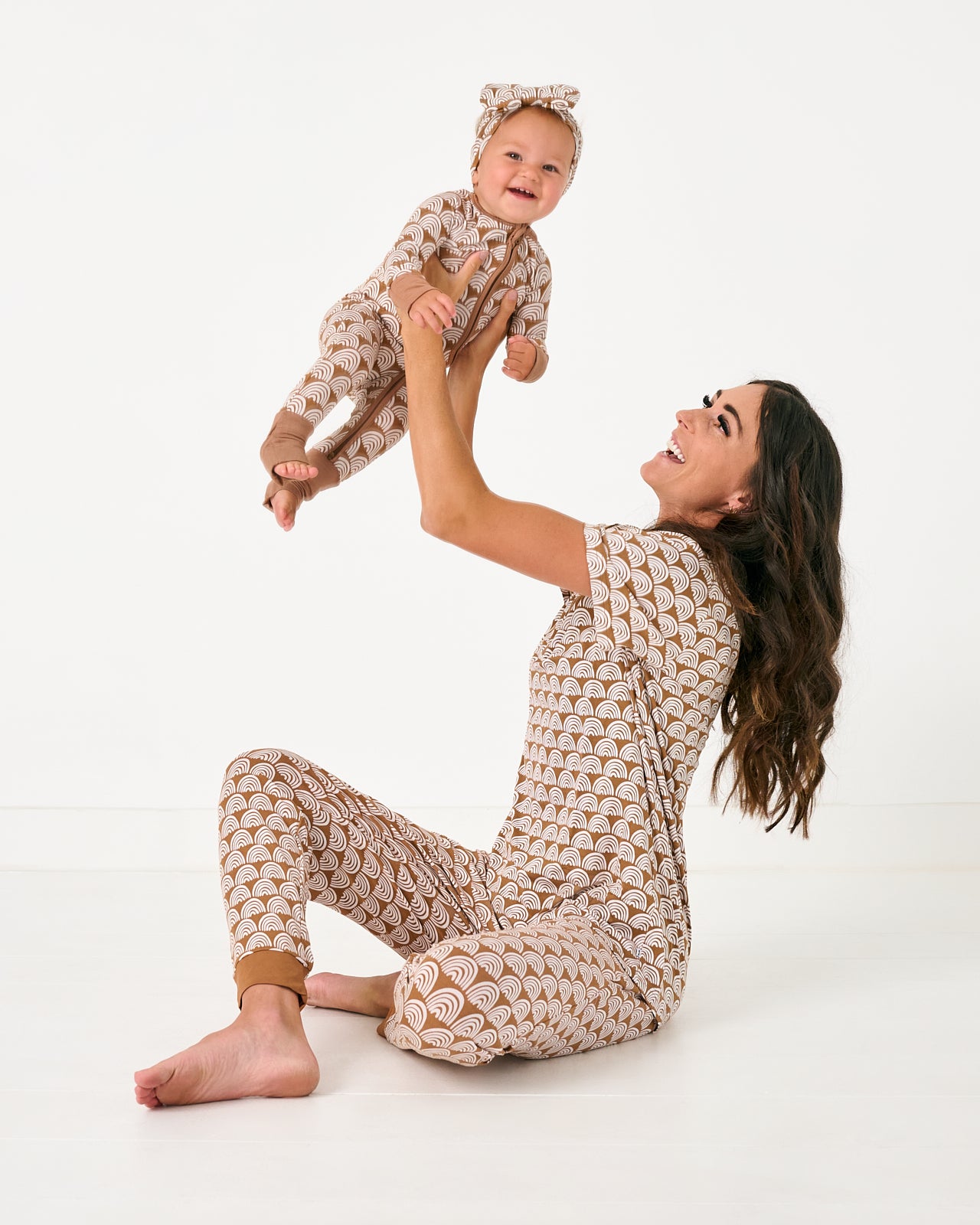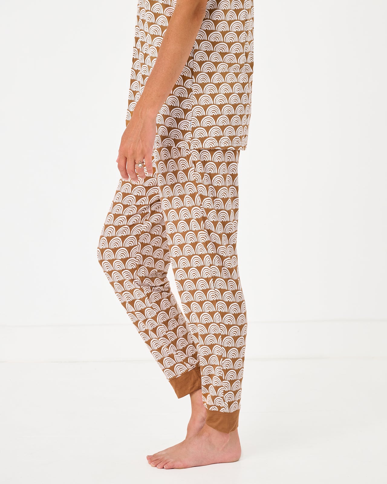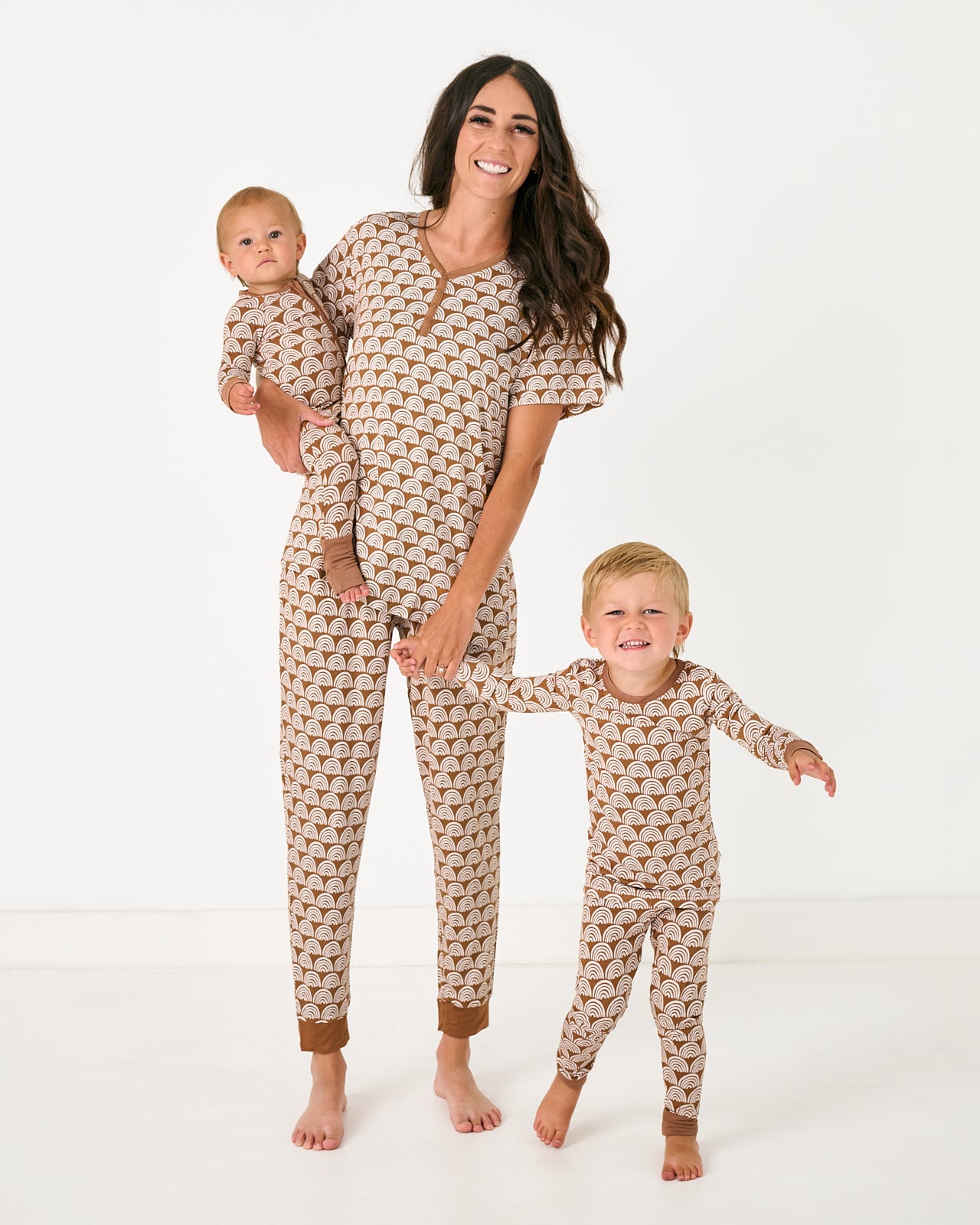 Calling all little dreamers! Featuring white rainbows on a neutral background. Rust Rainbows is a fan-favorite. Crafted from our custom-milled Lunaluxe® Bamboo. these PJ Pants feature deep pockets. a stretchy waistband. and jogger-style cuffs. Pair it with the matching top to complete the set. then grab styles for family matching!