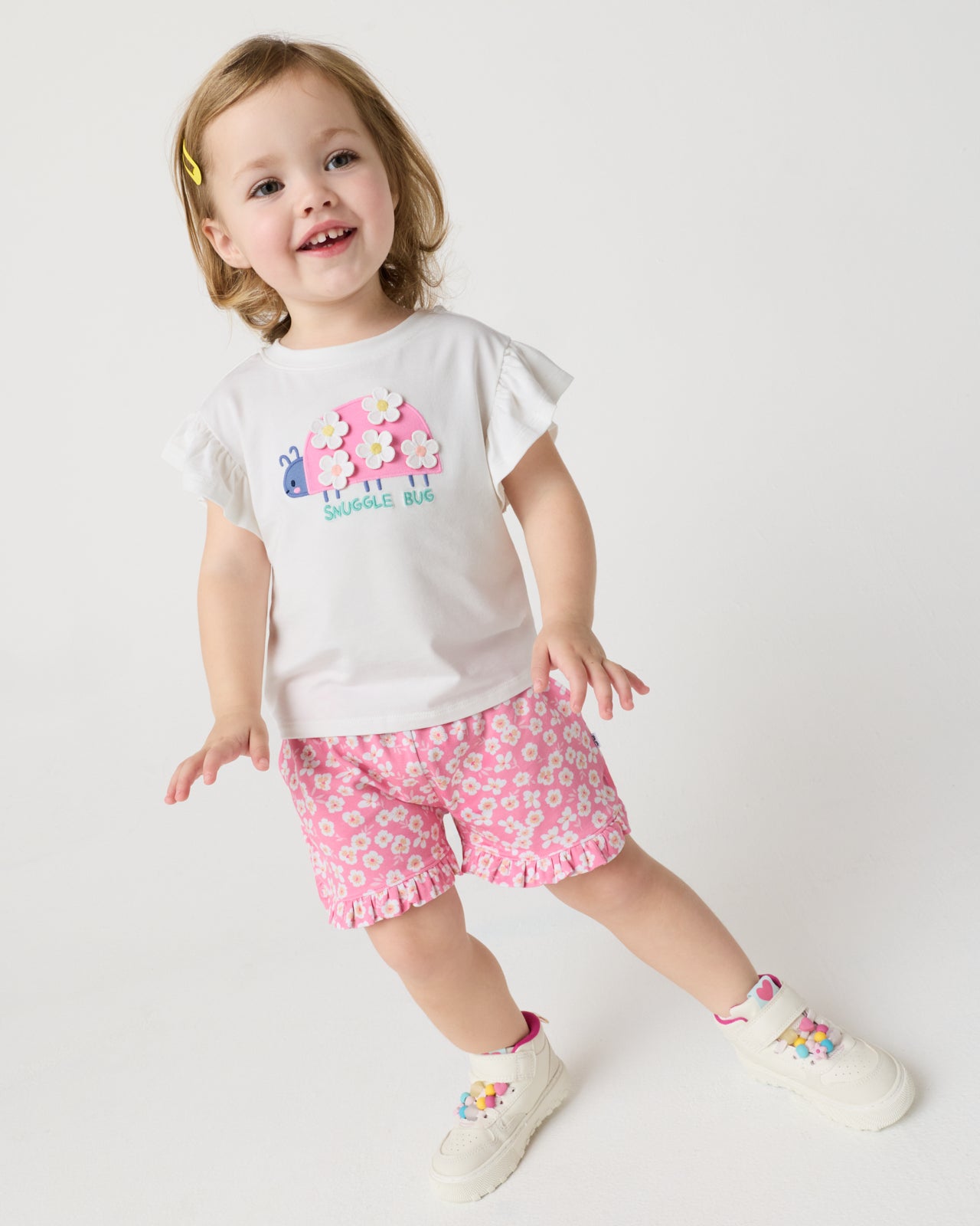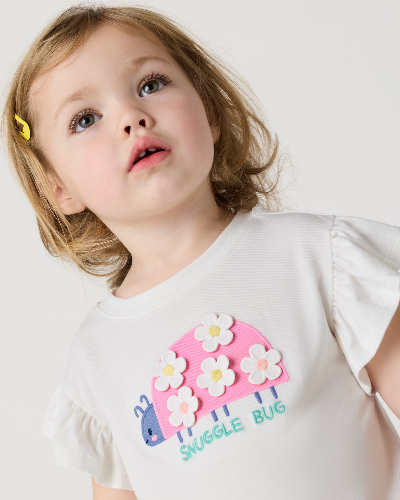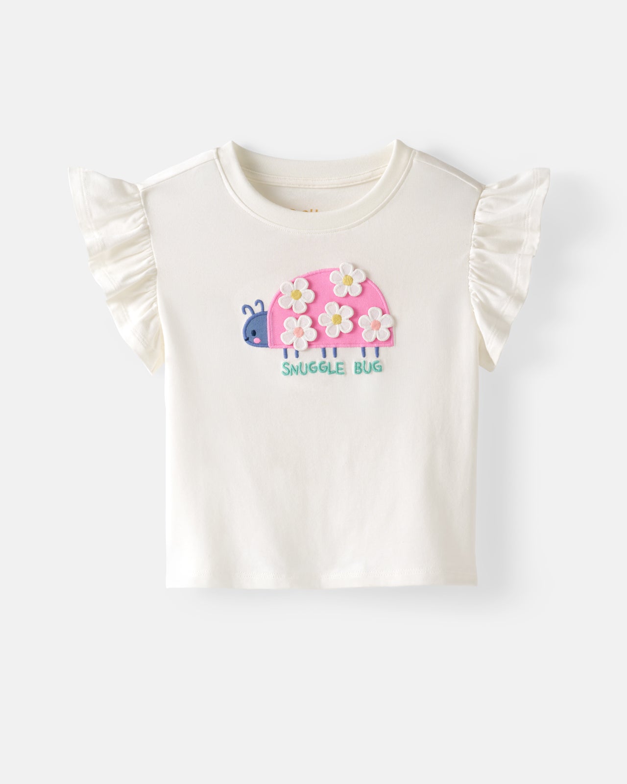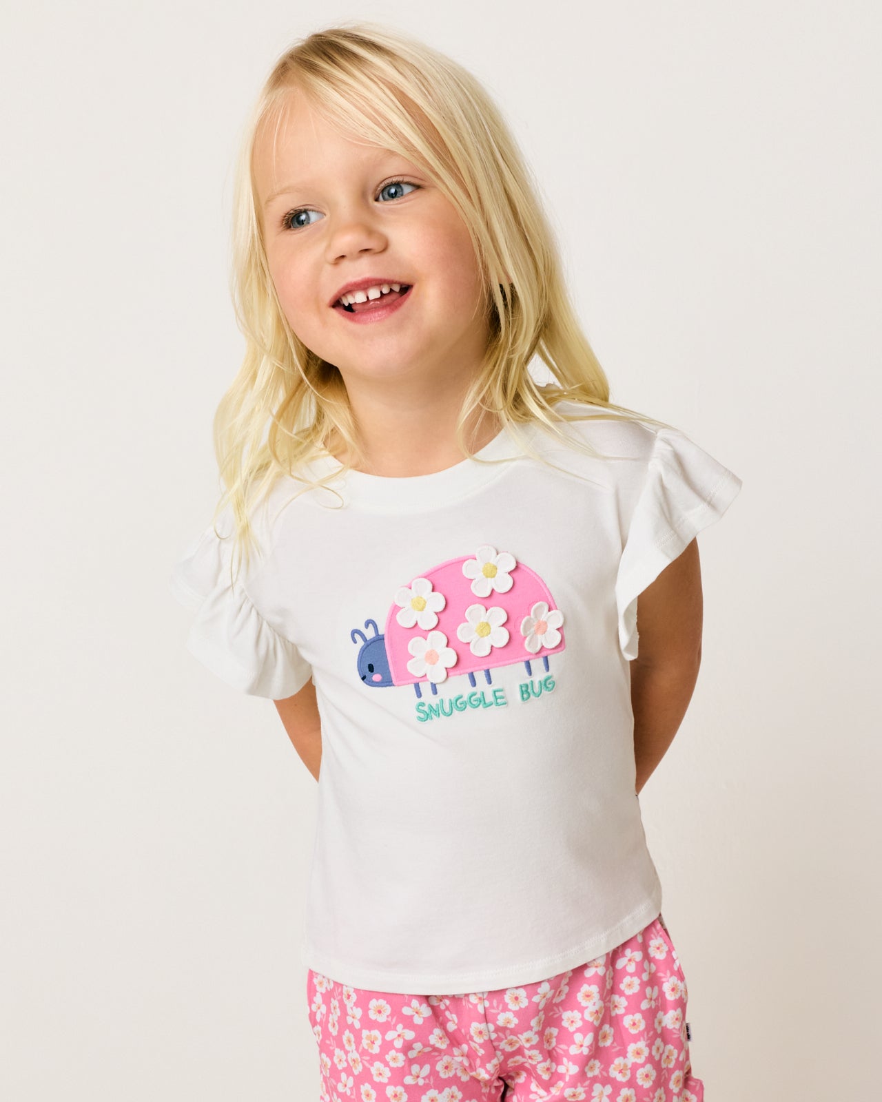 A spring staple for your little lovebug. The Snuggle Bug Flutter Tee features a ladybug graphic with daisy details on soft Soluxe® Bamboo. This girls t shirt has flutter sleeves and a relaxed fit perfect for garden adventures. Pair it with their fave LS bottoms!