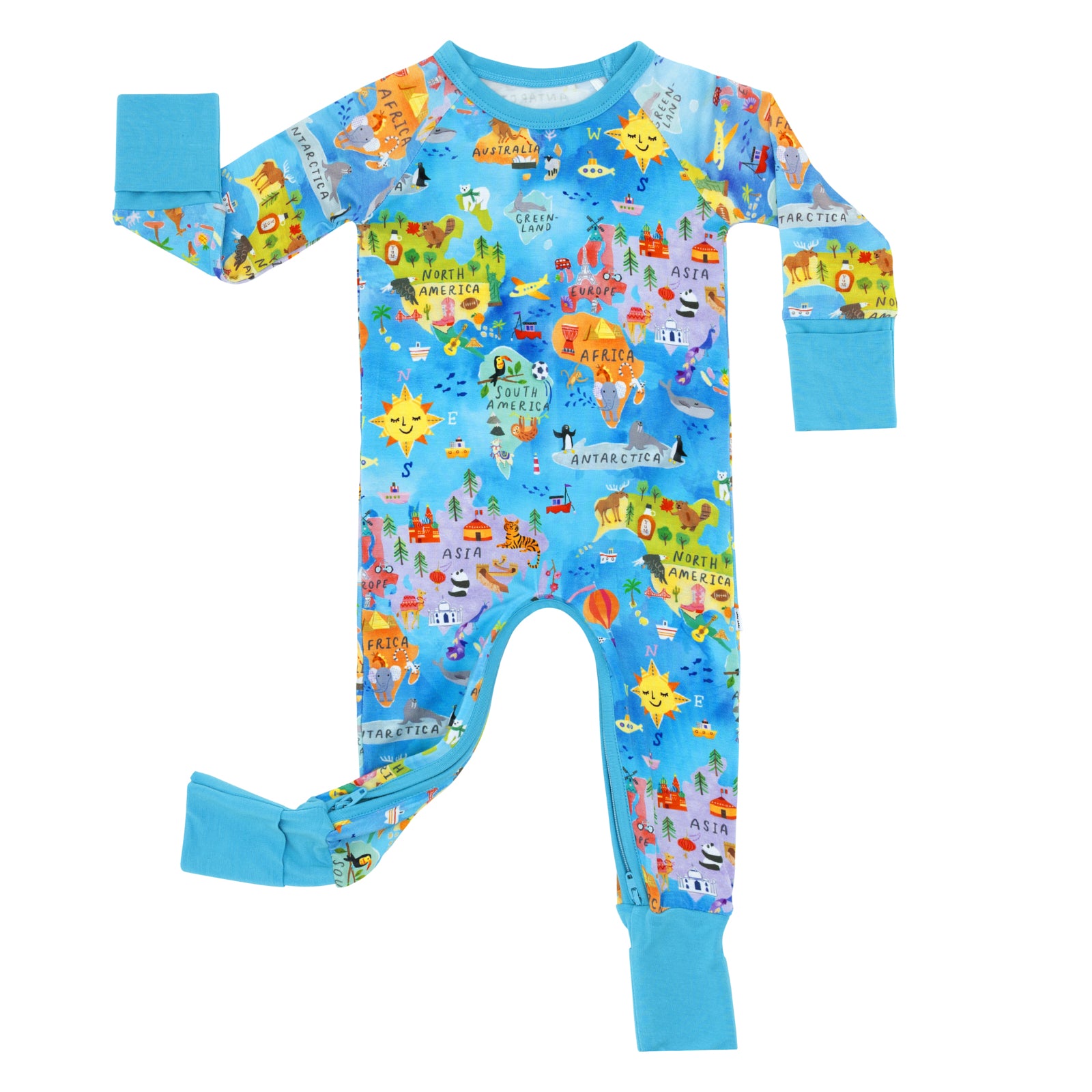 Global adventures await! Tuck your baby in for sweet dreams of future adventures with this one-piece Zippy ??featuring a hand painted world map with iconic landmarks and animals. Made from our buttery soft Lunaluxe® Bamboo. with thoughtful features like fold-over feet and mittens. a u-shaped double zipper and no scratchy tags ??it’s a cute pick for learning more about our great big world. Snag styles for fun family matching!