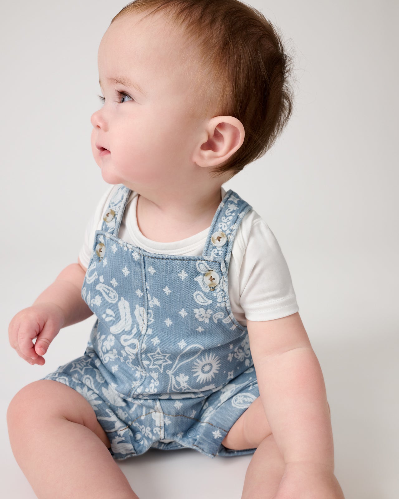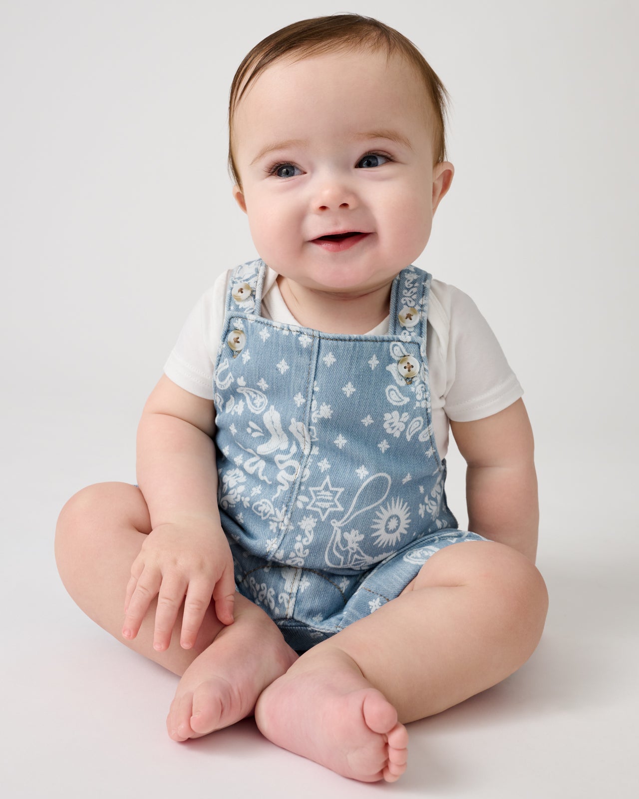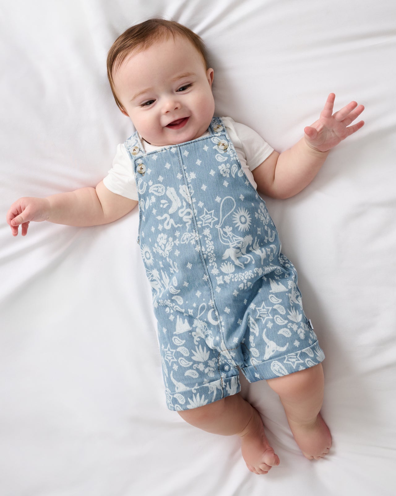 Western charm for everyday wear. The Bandana Blues Denim Shorty Overall features subtle rodeo icons on our special printed denim that’s always soft. Made from durable Soluxe® Bamboo. these baby overalls have adjustable straps and a relaxed fit perfect for playtime. Layer over their fave LS tops!