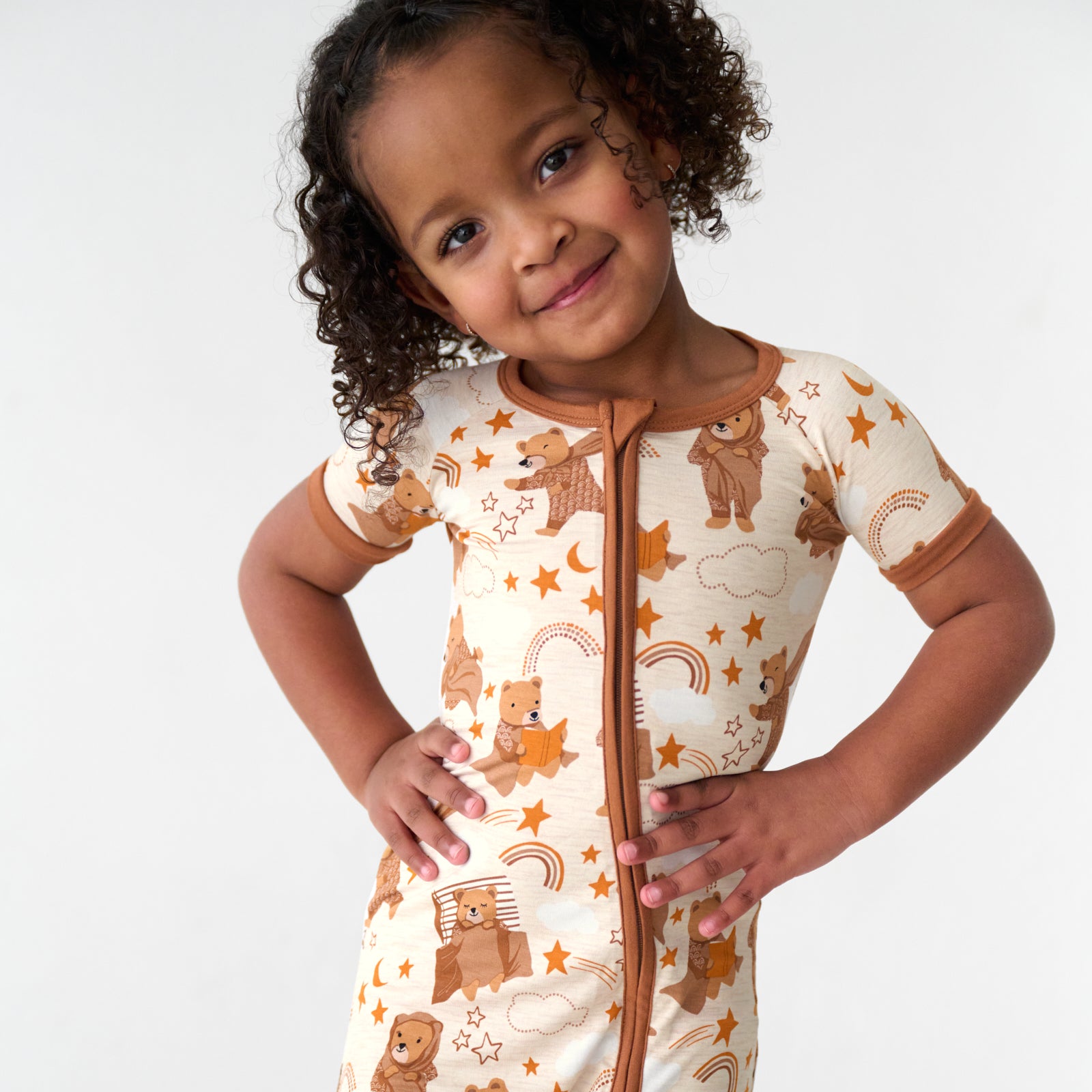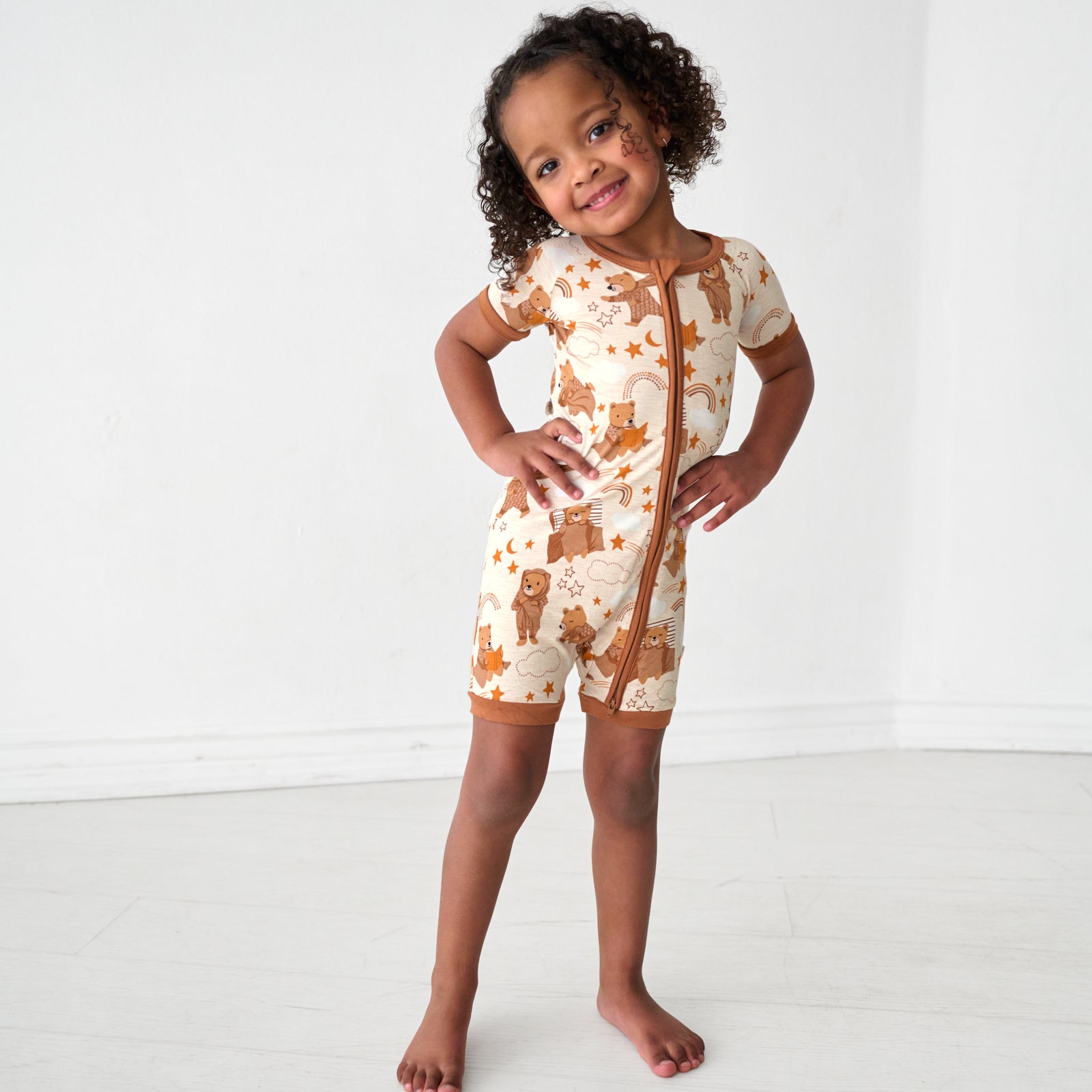 The sweetest Shorty Zippy for your little cub! This charming one-piece zipper pajama features Bowie the Bear getting ready for bed in his Rust Rainbows jams. Made from our signature Lunaluxe® Bamboo. it boasts an updated 2-way zipper design and no scratchy tags. Don’t forget a matching Luxe Bow!