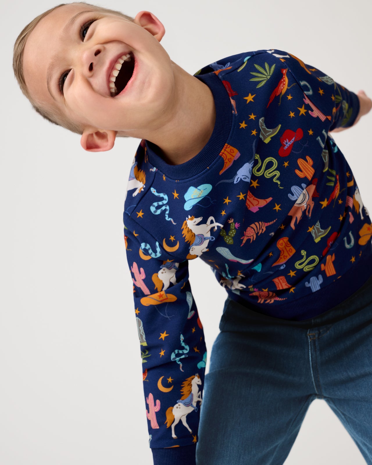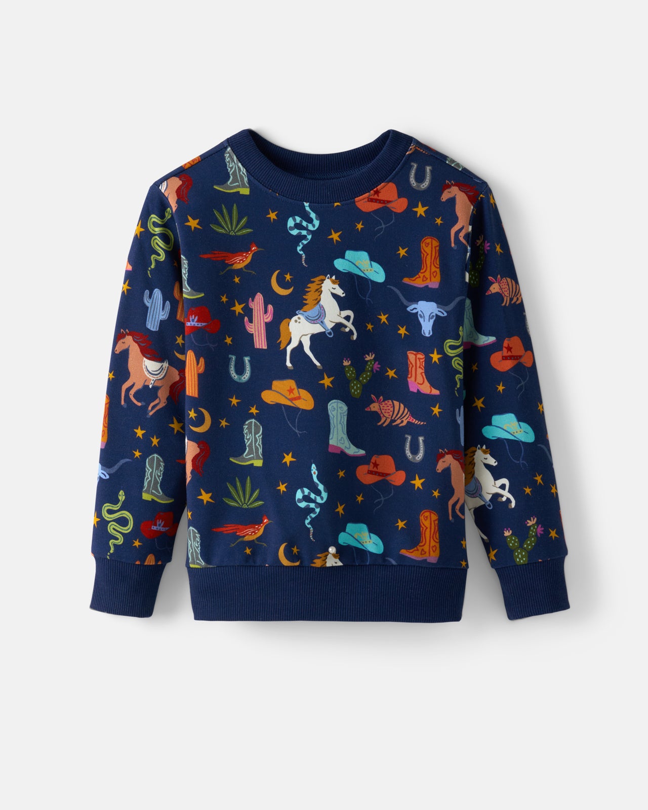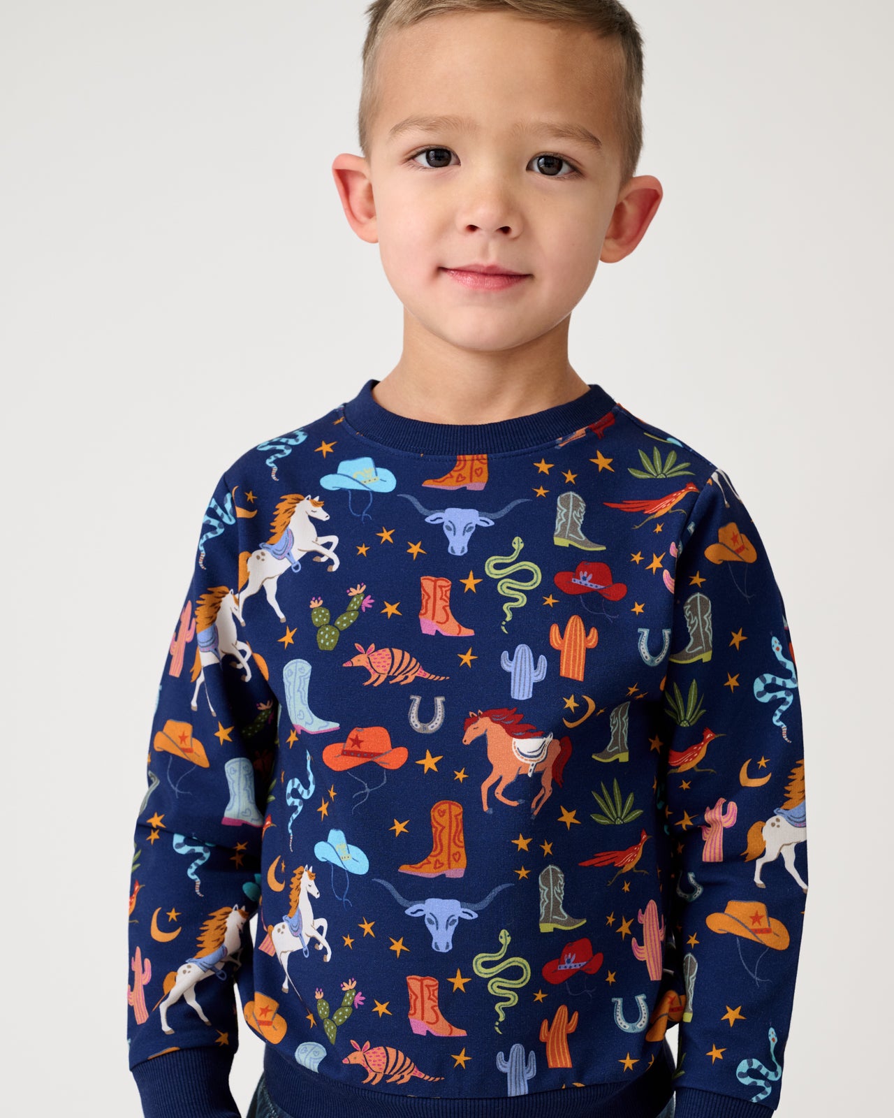 Ready to rodeo! The Rancher Roundup Crewneck Sweatshirt features classic western icons on a deep navy backdrop. Made from soft Soluxe® Bamboo with a cozy French terry interior. this kids sweatshirt has a relaxed fit that’s perfect for layering. Mix & match with their fave LS bottoms!