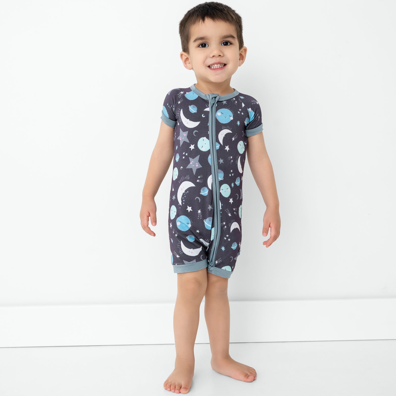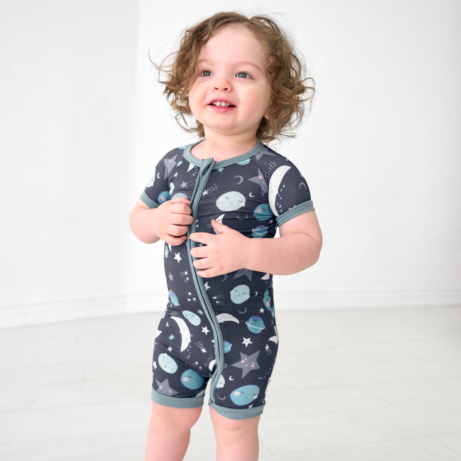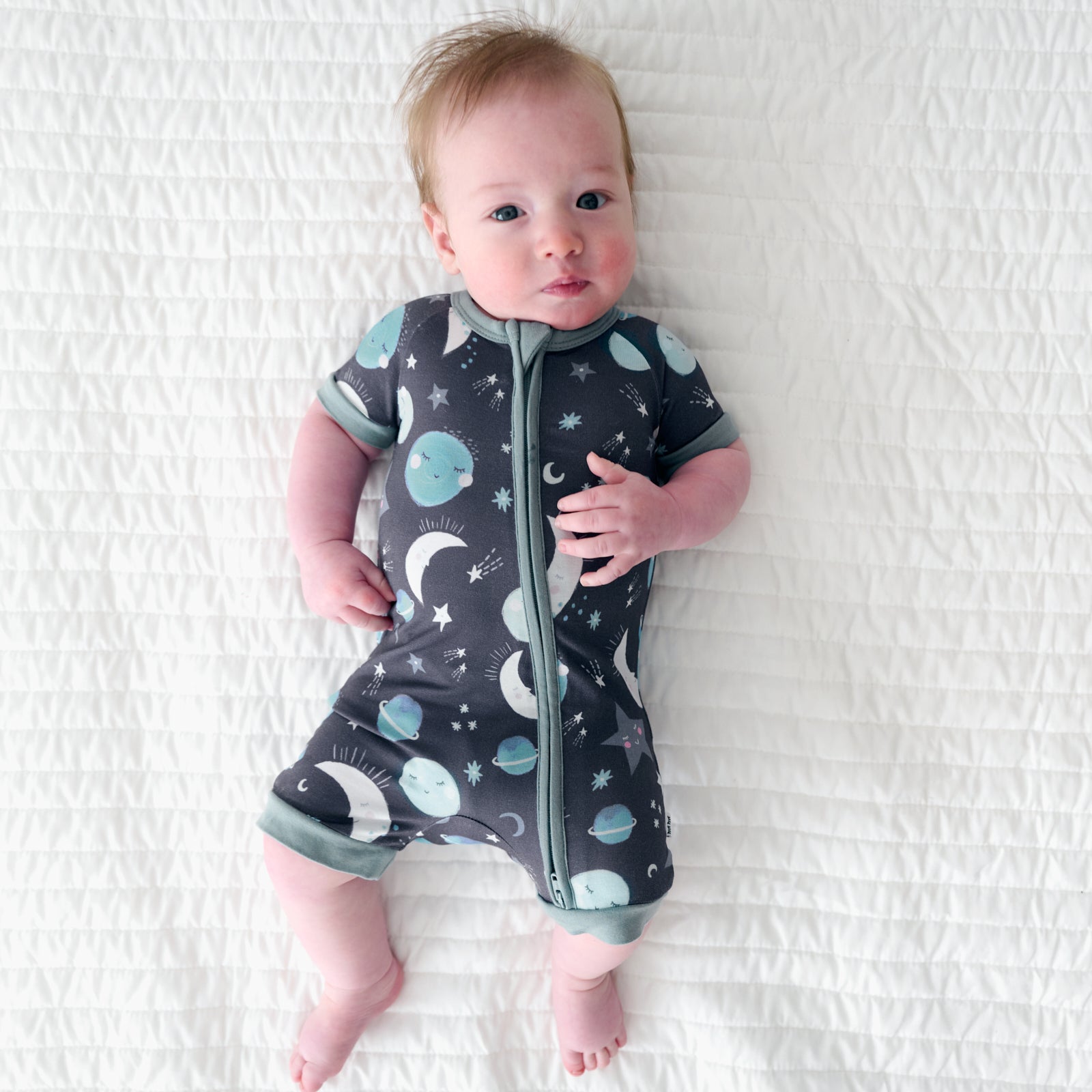Dreamiest Shorty Zippy ever! This fan-fave print features sleepy moons surrounded by sparkling skies on a deep gray background. Made from our signature Lunaluxe? Bamboo. this one-piece zipper pajama boasts thoughtful features like a double-zipper that extends down the leg and no scratchy tags. Snag a Crib Sheet to match!