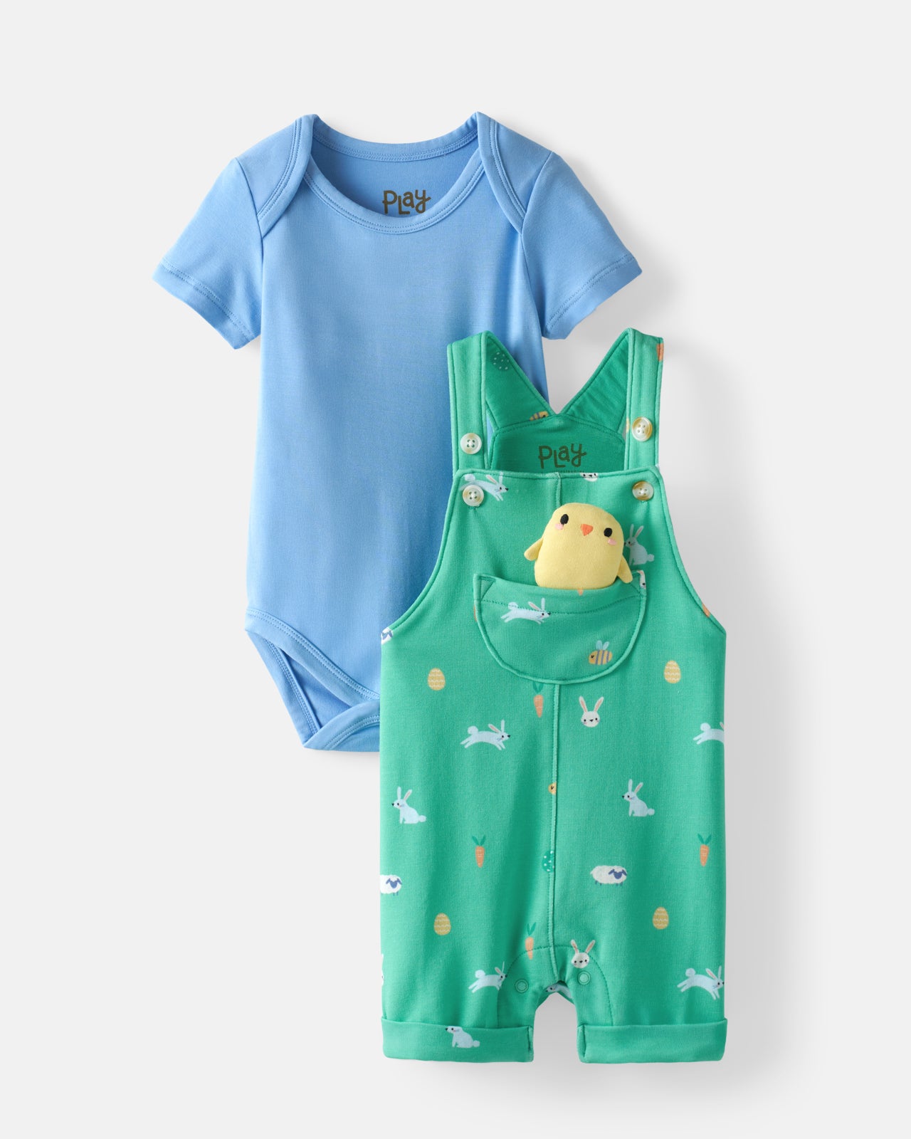Hey. little chick! The Bunny Burrow Shorty Overall Set features playful bunnies. carrots. and Easter eggs on soft Soluxe® Bamboo with an adorable pouch pal peeping out to say hello. These baby overalls have adjustable straps and a coordinating bodysuit included. So perfect for their Easter outfit!
