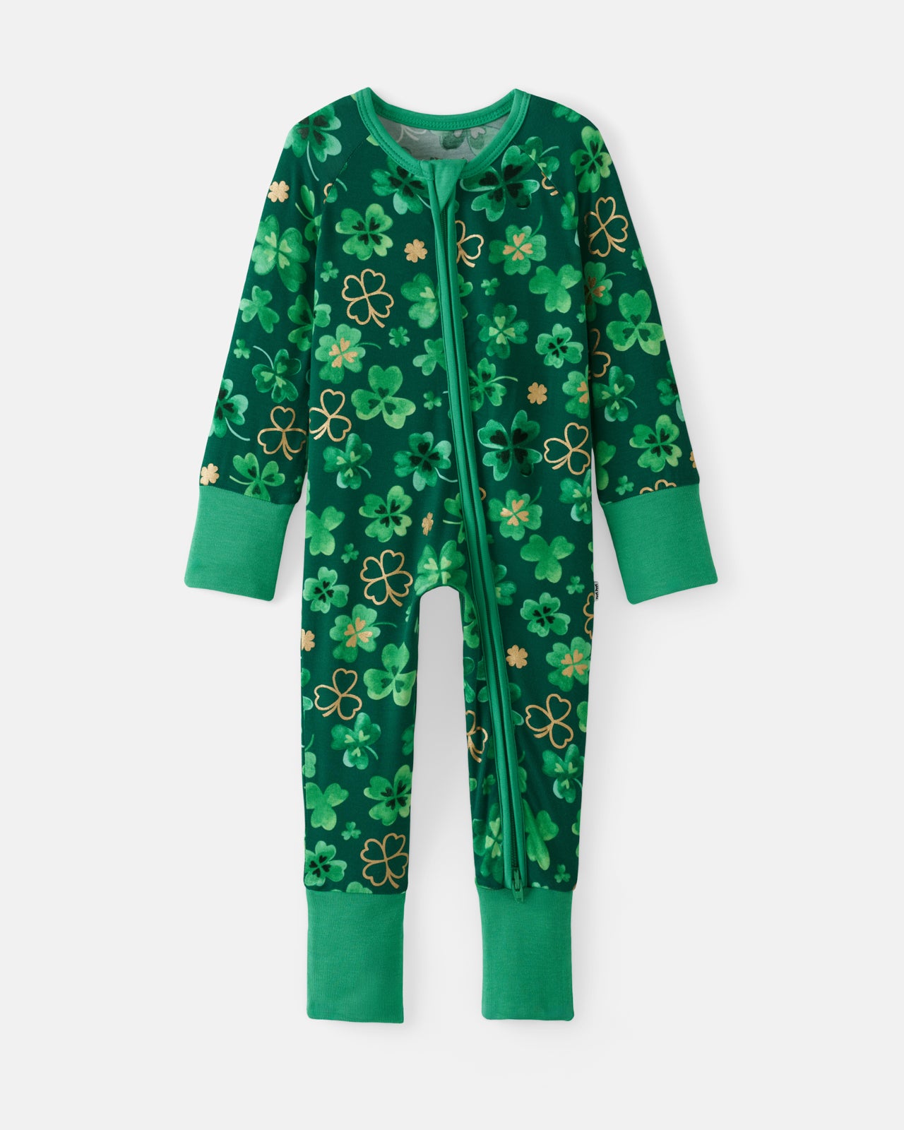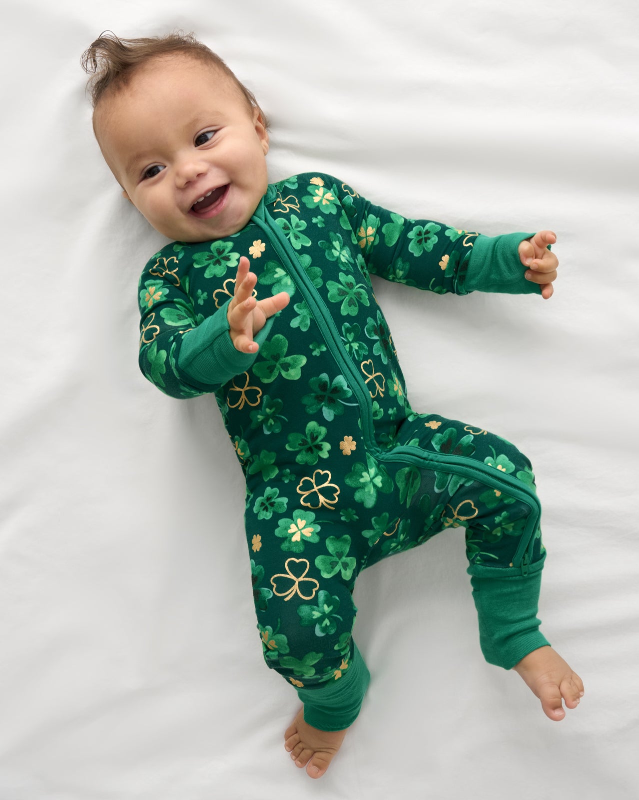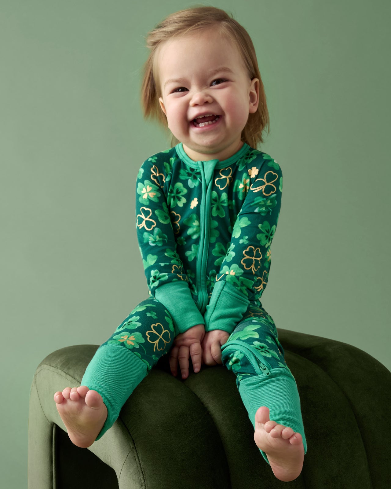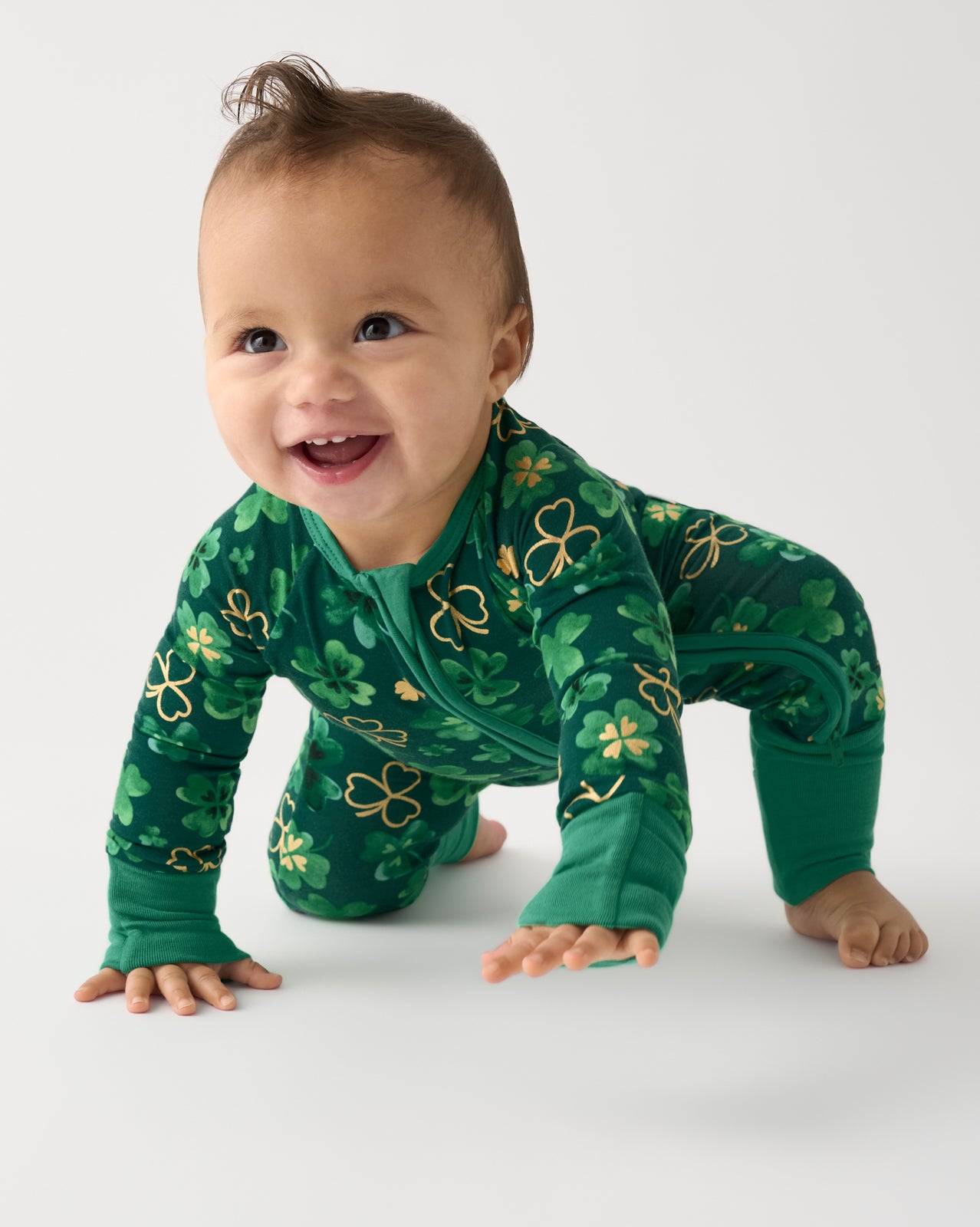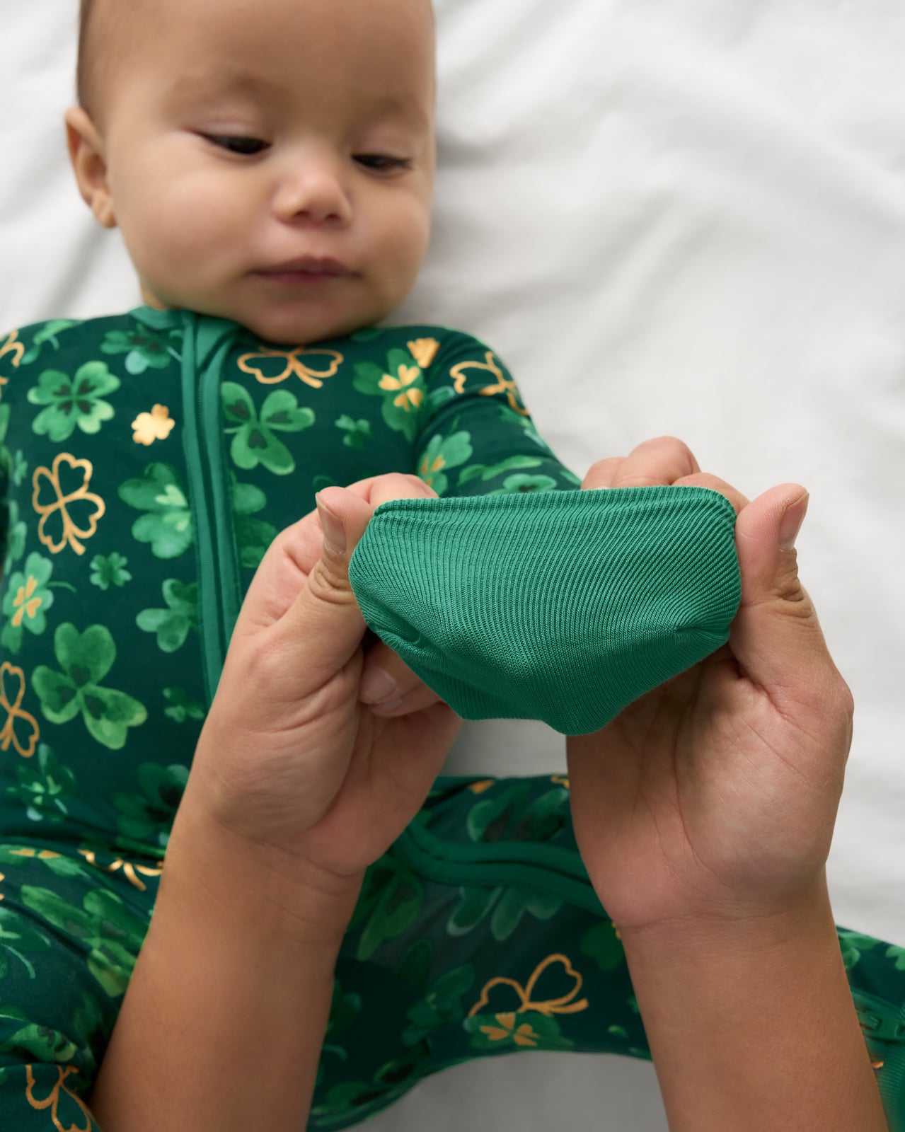 Lucky you! The Clover Cuties Zippy features clovers in green and glimmering gold. Made from ultra-soft Lunaluxe® Bamboo that’s gentle on sensitive skin. this bamboo baby sleeper has fold-over mittens. convertible foot cuffs. and a double zipper for easy changes. Perfect for family matching!