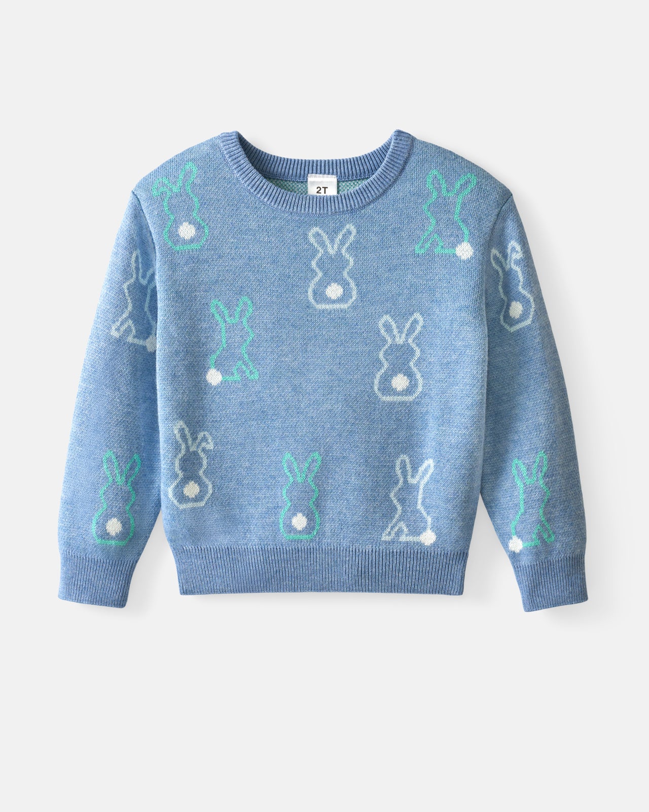 Bunny-soft for Easter. The Cozy Cottontails Sweater features subtle bunny outlines on cozy heather blue Soluxe? Bamboo knit. This kids sweater has a classic pullover style with a flat sewn-in tag for extra comfort. Pair it with their fave LS bottoms for springtime adventures!