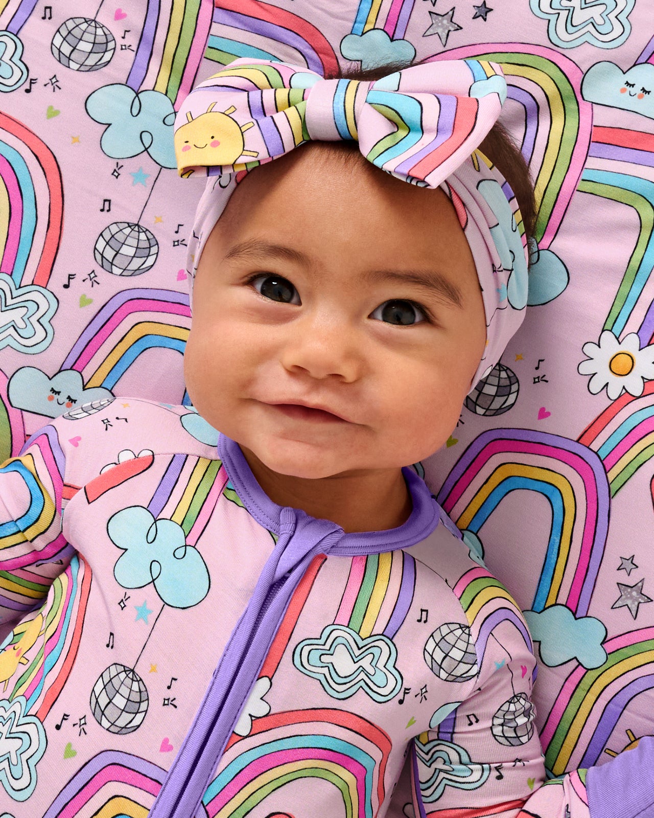 Top off their look with the Disco Rainbows Luxe Bow Headband! Made from buttery soft Lunaluxe? Bamboo that’s gentle on sensitive skin. this no-fuss bow features real loops (no tying needed!). Pair it with Disco Rainbows PJs or your fave solid Sleepies.