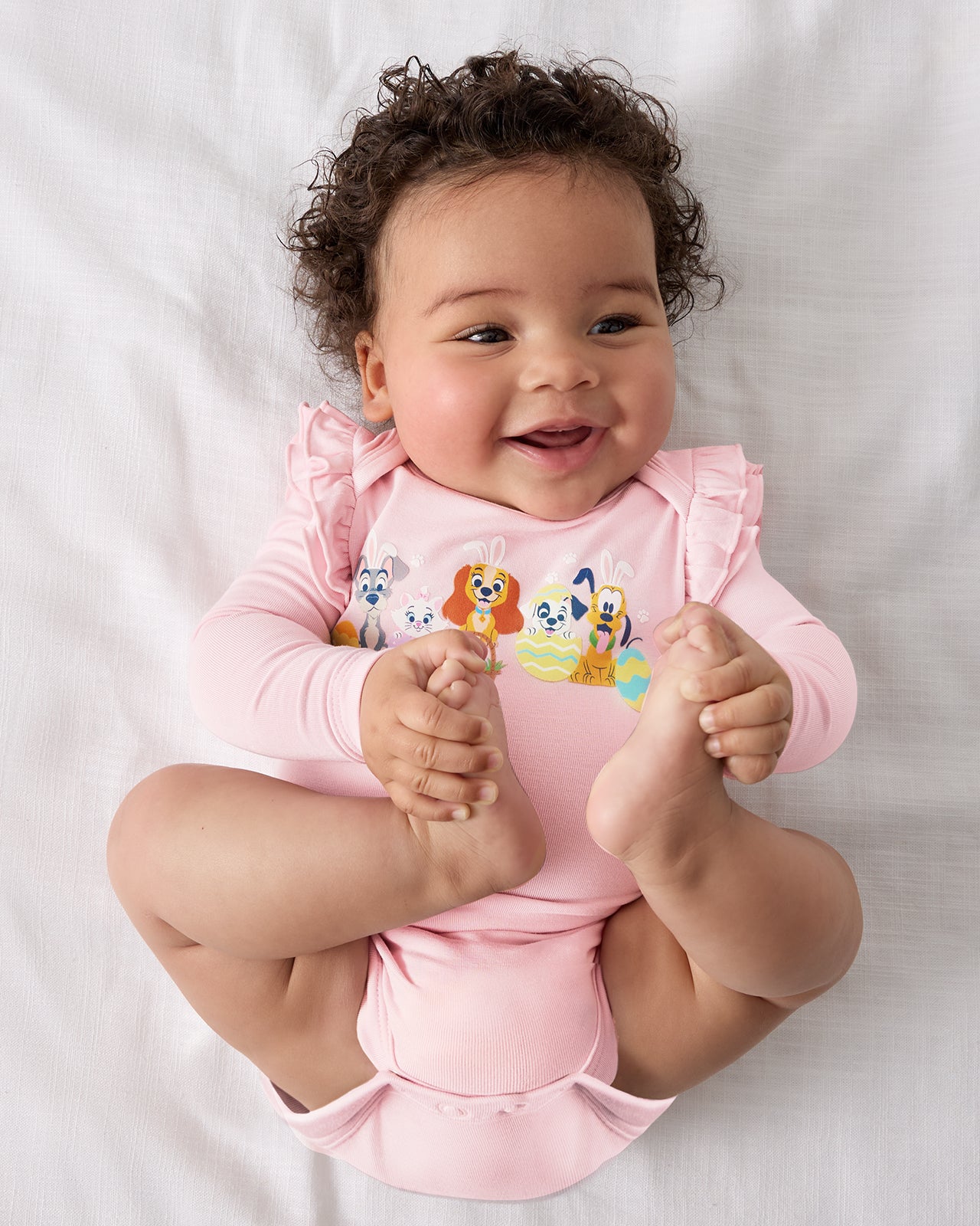 Ready for Easter! The Disney Peekaboo Pets Flutter Bodysuit features a sweet graphic with beloved Disney pets from their favorite movies with bunny ears and Easter eggs. Made from durable Soluxe? Bamboo. this pastel pink baby bodysuit has flutter sleeves. lap shoulders. and a snappable bottom for easy changes. Grab the matching Flutter Tee for sibling moments!