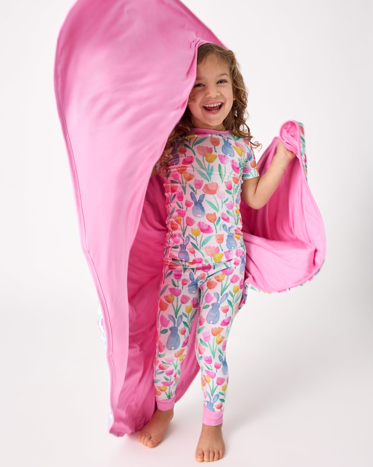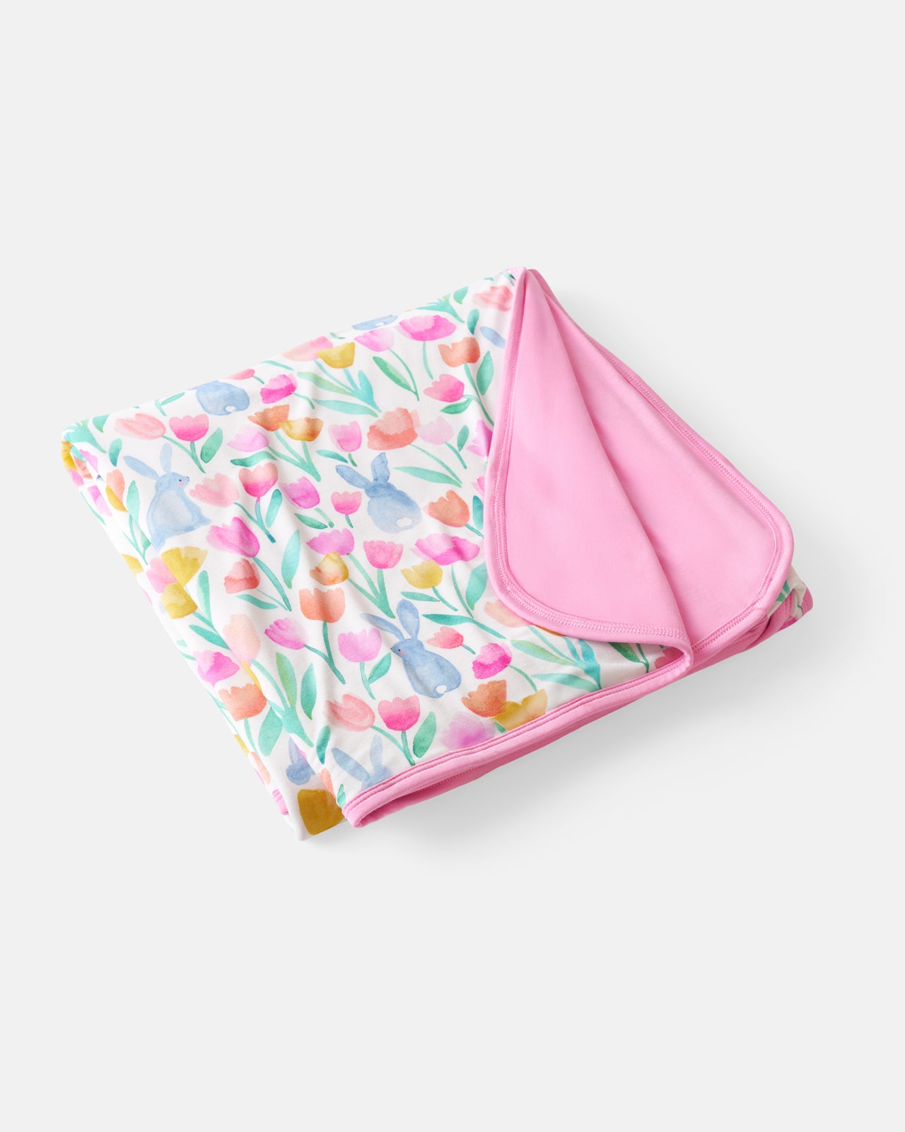 Springtime snuggles. Made from triple-layered Lunaluxe? Bamboo. the Garden Hop Large Cloud Blanket? is ultra-soft and perfect for together-time on the couch. Featuring watercolor tulips and sweet bunnies with a coordinating pink shade on the back. Pair with the matching PJs!