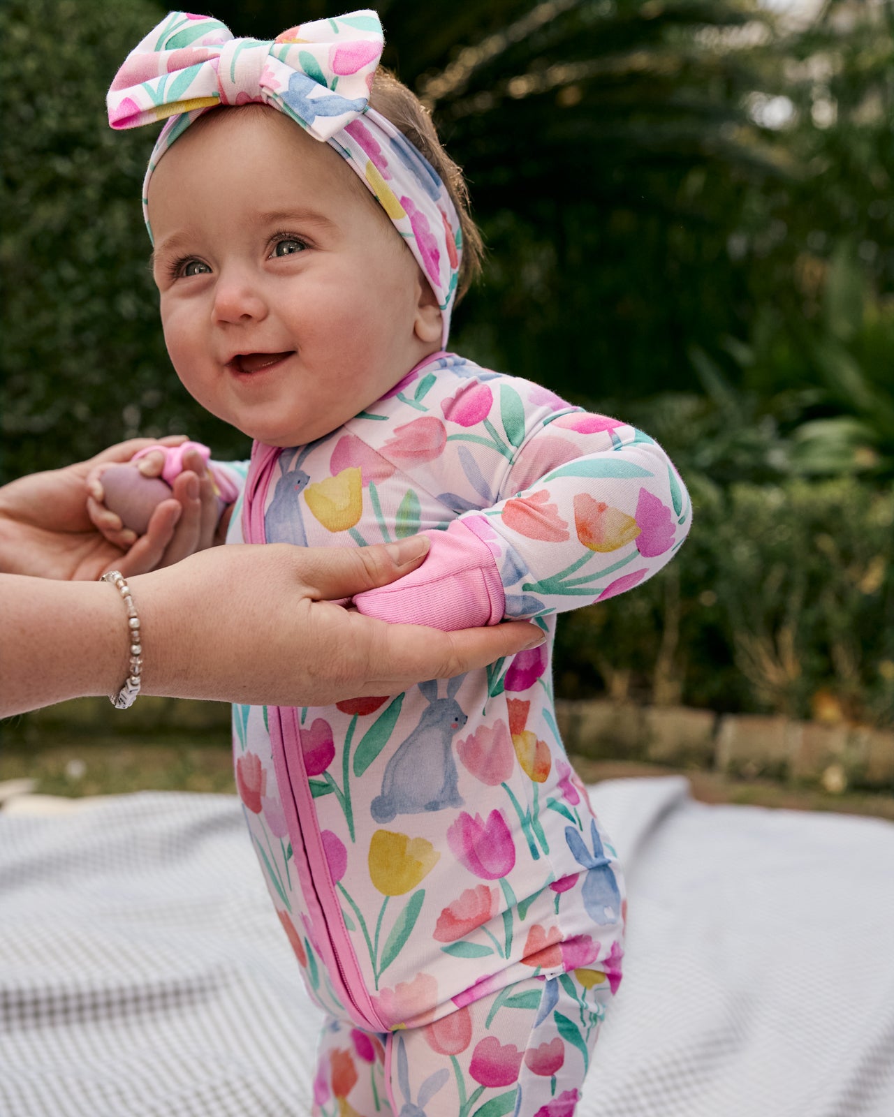 The sweetest finishing touch! The Garden Hop Luxe Bow Headband features watercolor tulips and sweet bunnies on ultra-soft Lunaluxe? Bamboo. This bow headband has real loops and never needs tying. Perfect for Easter photos and springtime adventures!