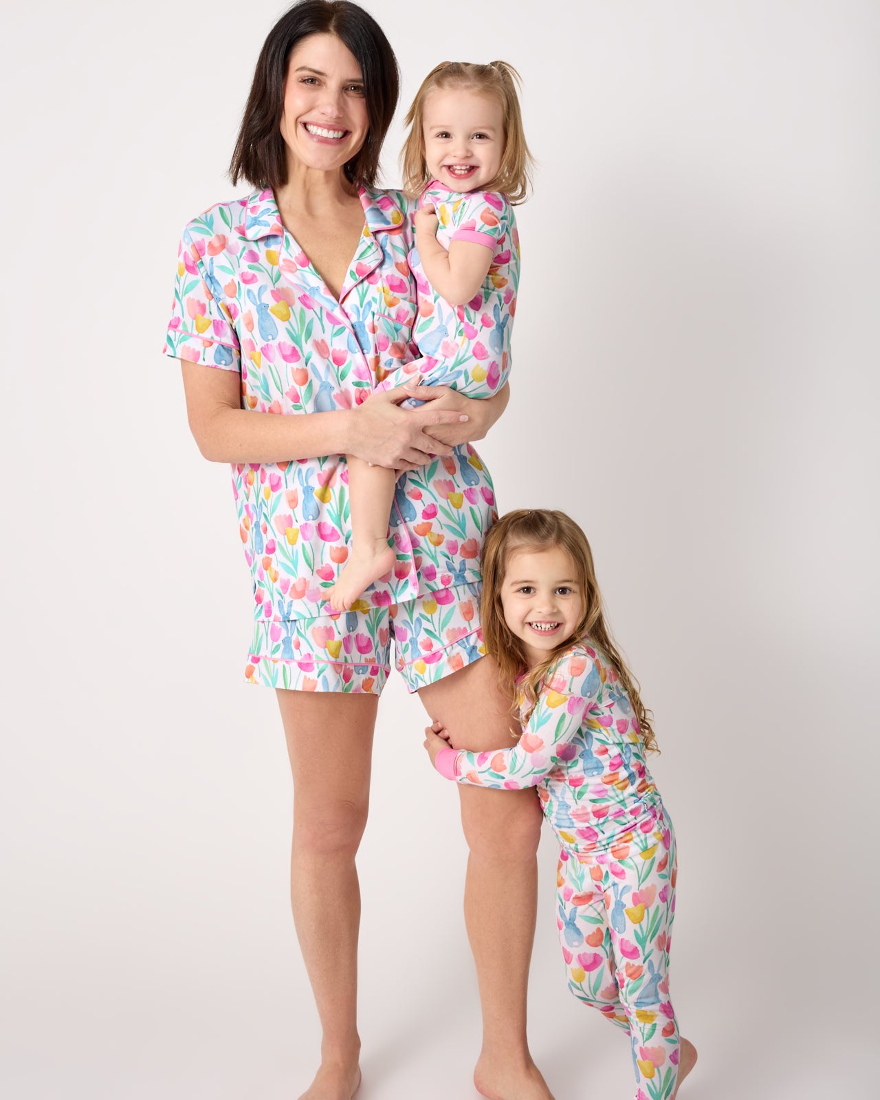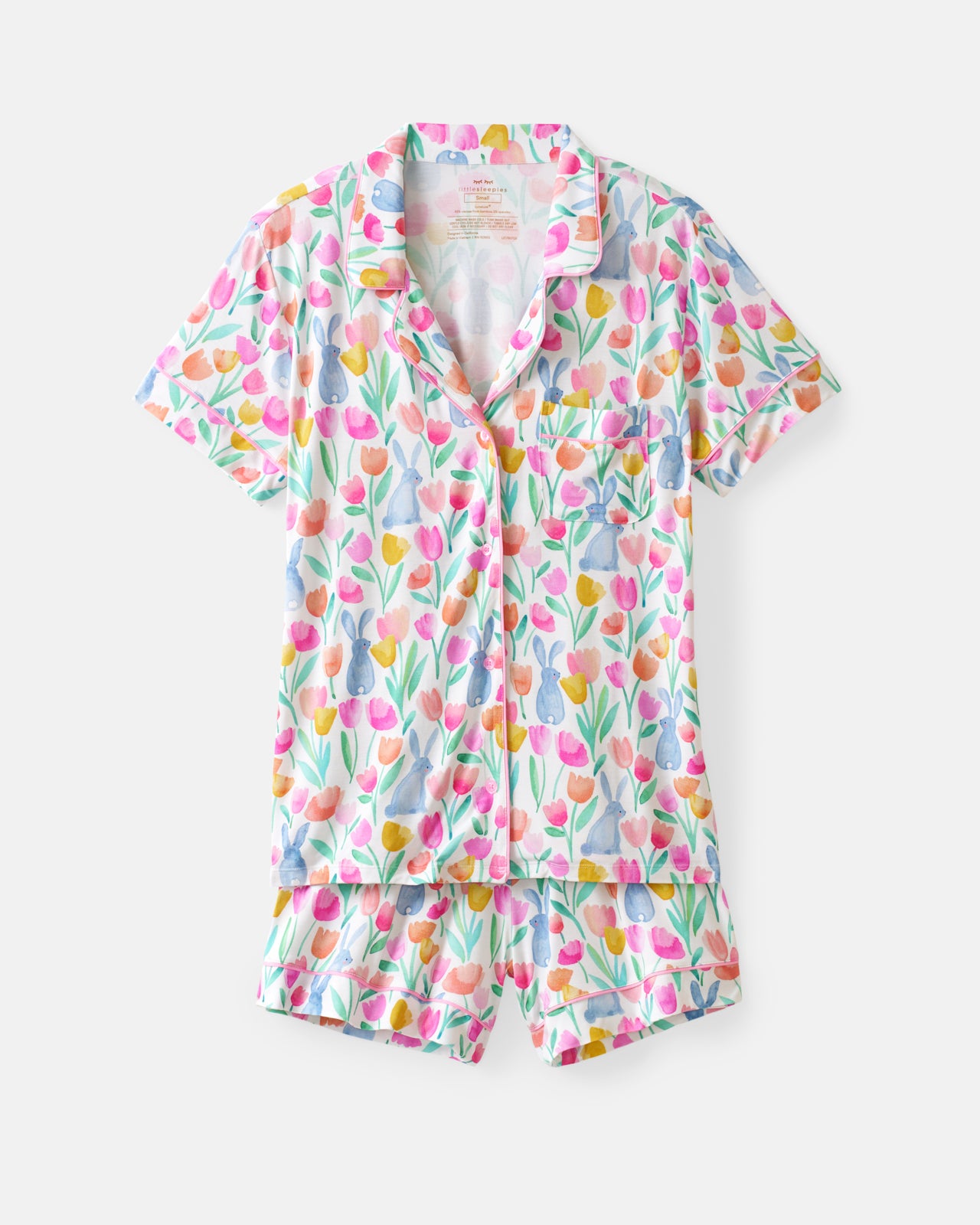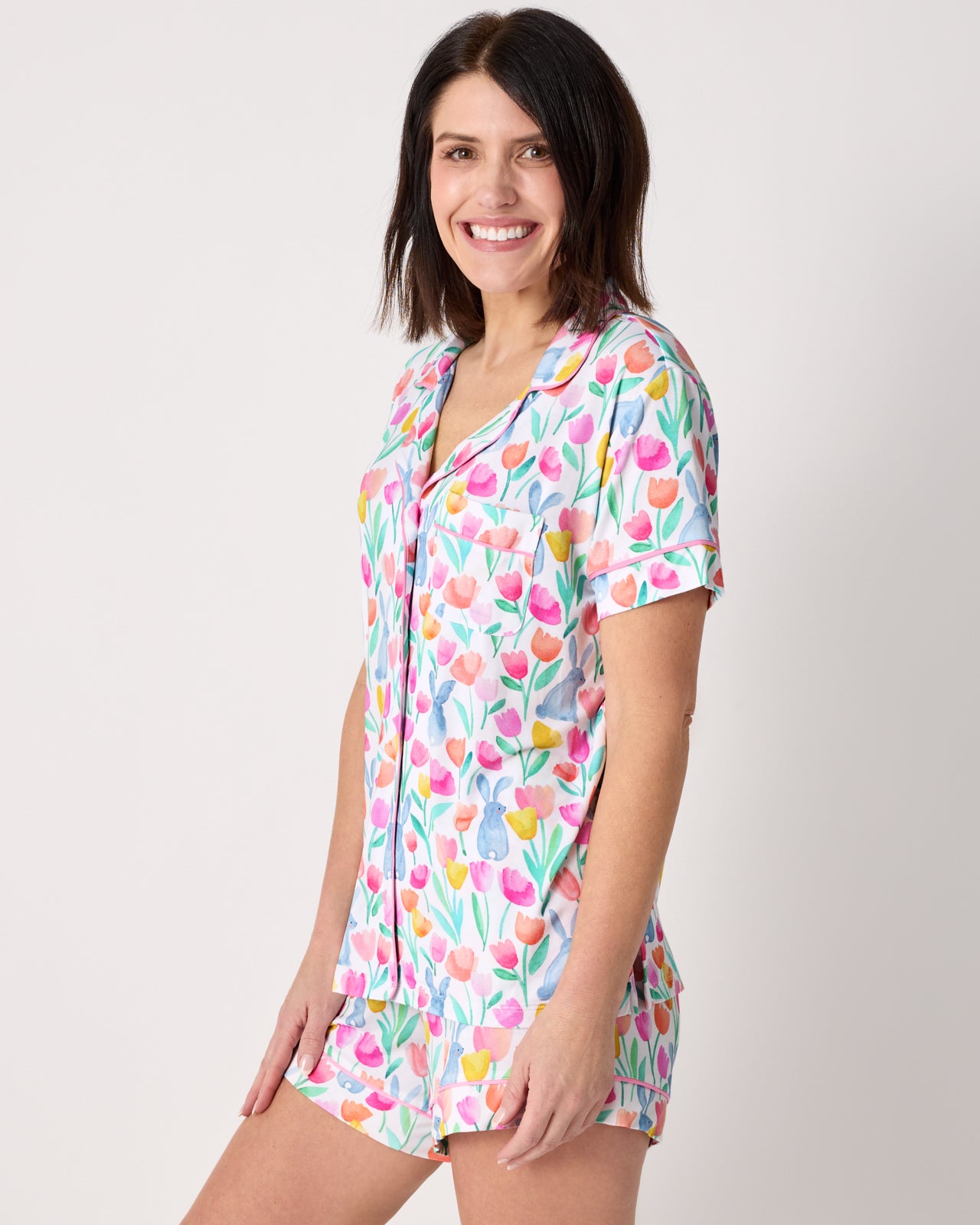 Springtime soft. The Garden Hop Women’s Pajama Set features watercolor tulips and sweet bunnies on a fresh white background. Made from ultra-soft Lunaluxe® Bamboo. this matching pajama set has a button-down top for easy nursing access and relaxed shorts with a bump-friendly waistband. The contrast piping detail and notched collar are the perfect finishing touches. So cute for Easter morning!