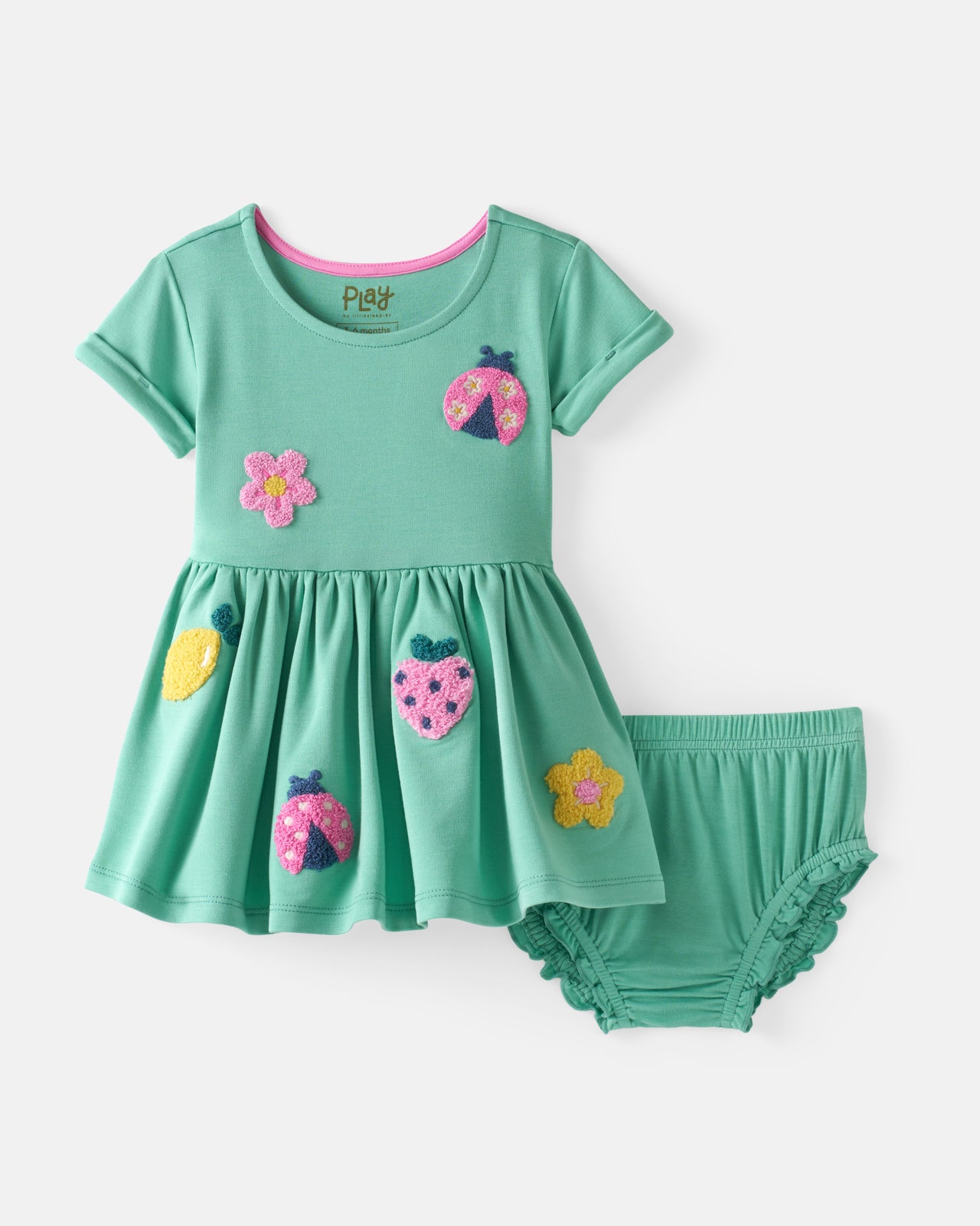 All the spring things! The Garden Party Short Sleeve Dress with Bloomer features ladybugs. strawberries. lemons. and flower appliqués on a fresh jade green. Made from durable Soluxe® Bamboo. this toddler dress includes a matching bloomer for easy diaper coverage. So sweet for sibling matching!