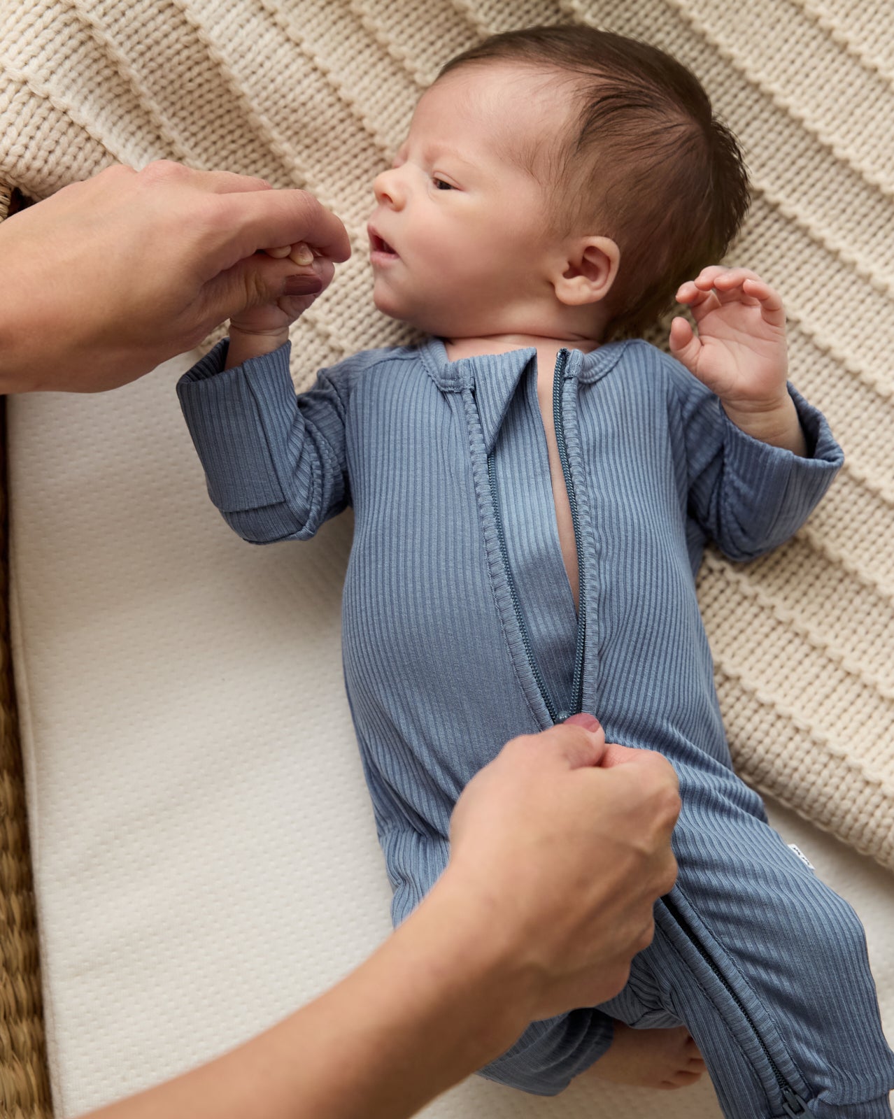 Add a little more comfort to those first winter memories. Made from soft ribbed bamboo. this Hazy Blue Ribbed Zippy is so gentle on baby’s delicate skin. It boasts mama-designed details you’ll love. like fold-over mittens to protect tiny cheeks. convertible feet that adapt as they grow. and a double zipper to make middle-of-the-night changes a little easier. The fabric is a fan-fave for a reason!