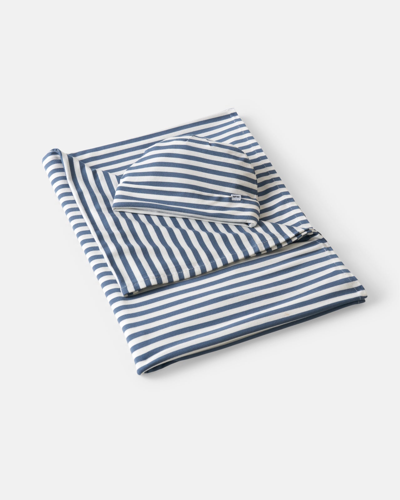 Keep baby cozy. from day one. The Hazy Blue Stripe Swaddle & Infant Beanie Set is made from soft bamboo that’s breathable. hypoallergenic. and gentle on sensitive newborn skin. Its oversized design is so versatile and perfect for tummy time. The matching beanie features a fold-over brim for little heads of all sizes. Just the perfect baby shower gift!