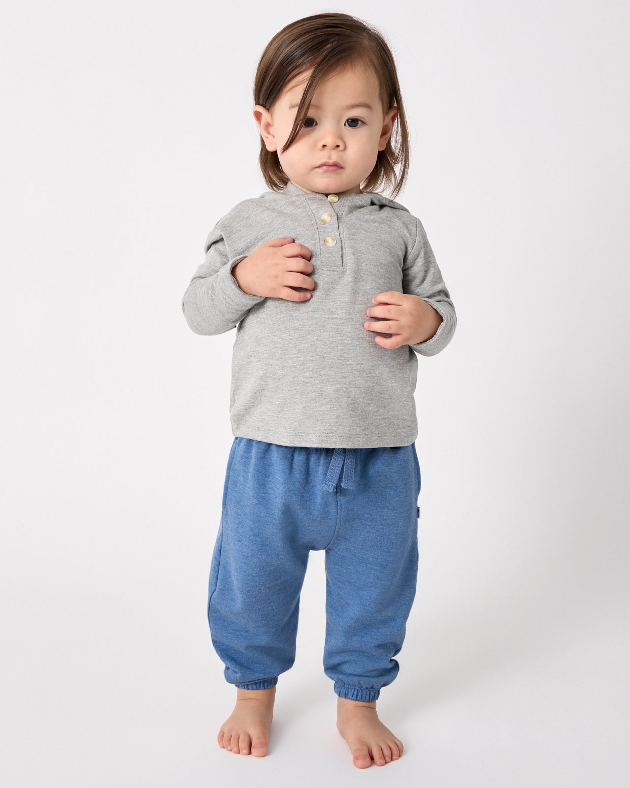 Springtime basics. The Heather Blue Jogger features a classic heather blue shade on soft Soluxe? Bamboo. These versatile baby joggers have an easy pull-on style and comfy cinched detailing. Perfect for pairing with bodysuits or their fave LS tops!