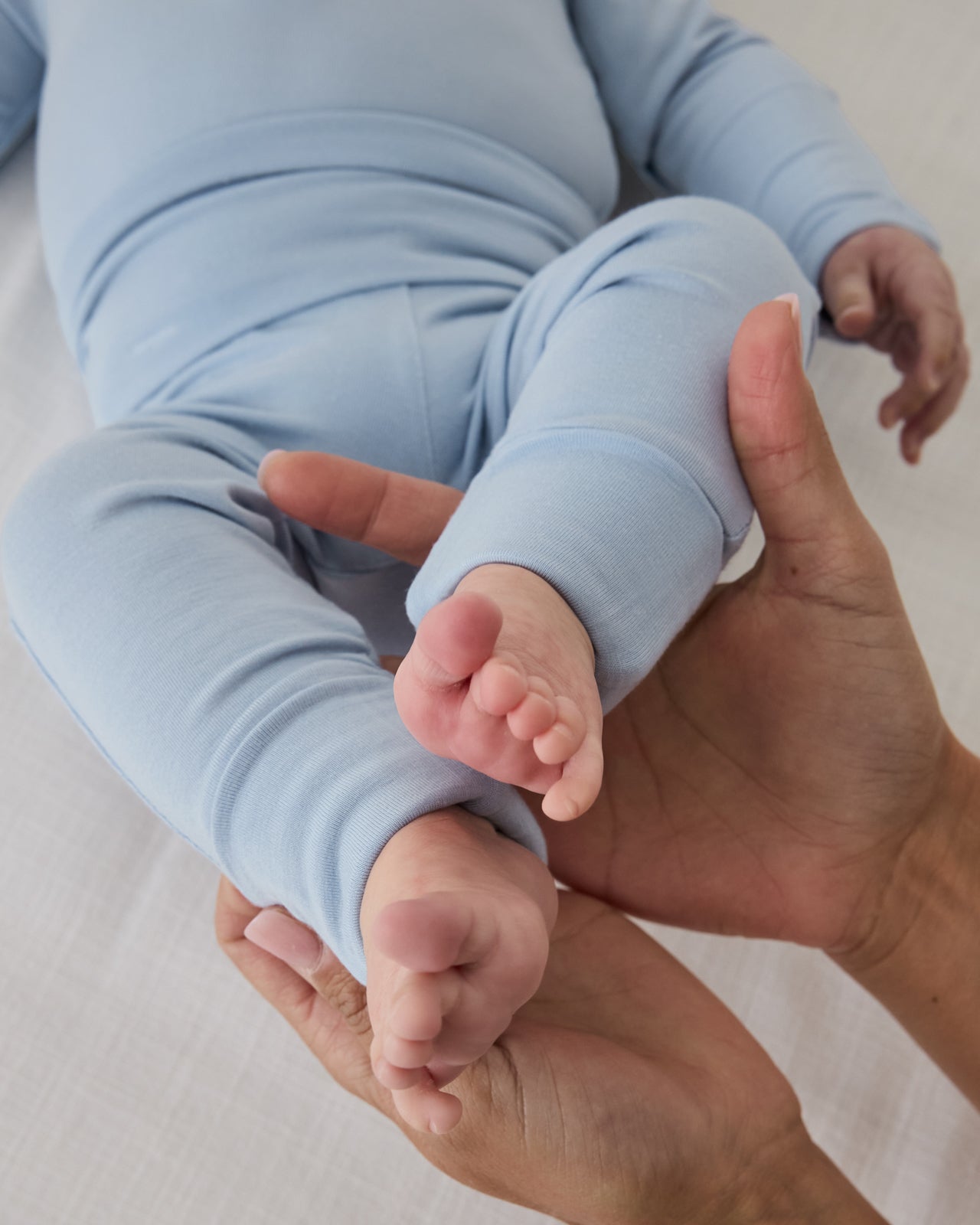 An essential for those precious early days. Our Light Fog Fold-Over Leggings are made with durable Soluxe® Bamboo jersey. complete with an adjustable fold-over waistband that’s perfect for healing belly buttons. The fold-over foot cuffs keep tiny toes warm. while the tagless design protects even the most sensitive skin. Comes in a bamboo keepsake bag that can double as a gift bag. Don’t forget the matching Light Fog Stripe Henley Bodysuit and Infant Beanie for the comfiest daytime look!