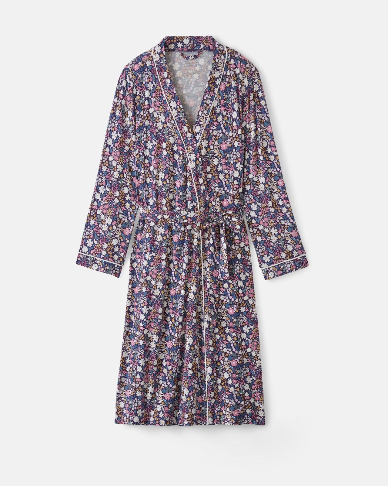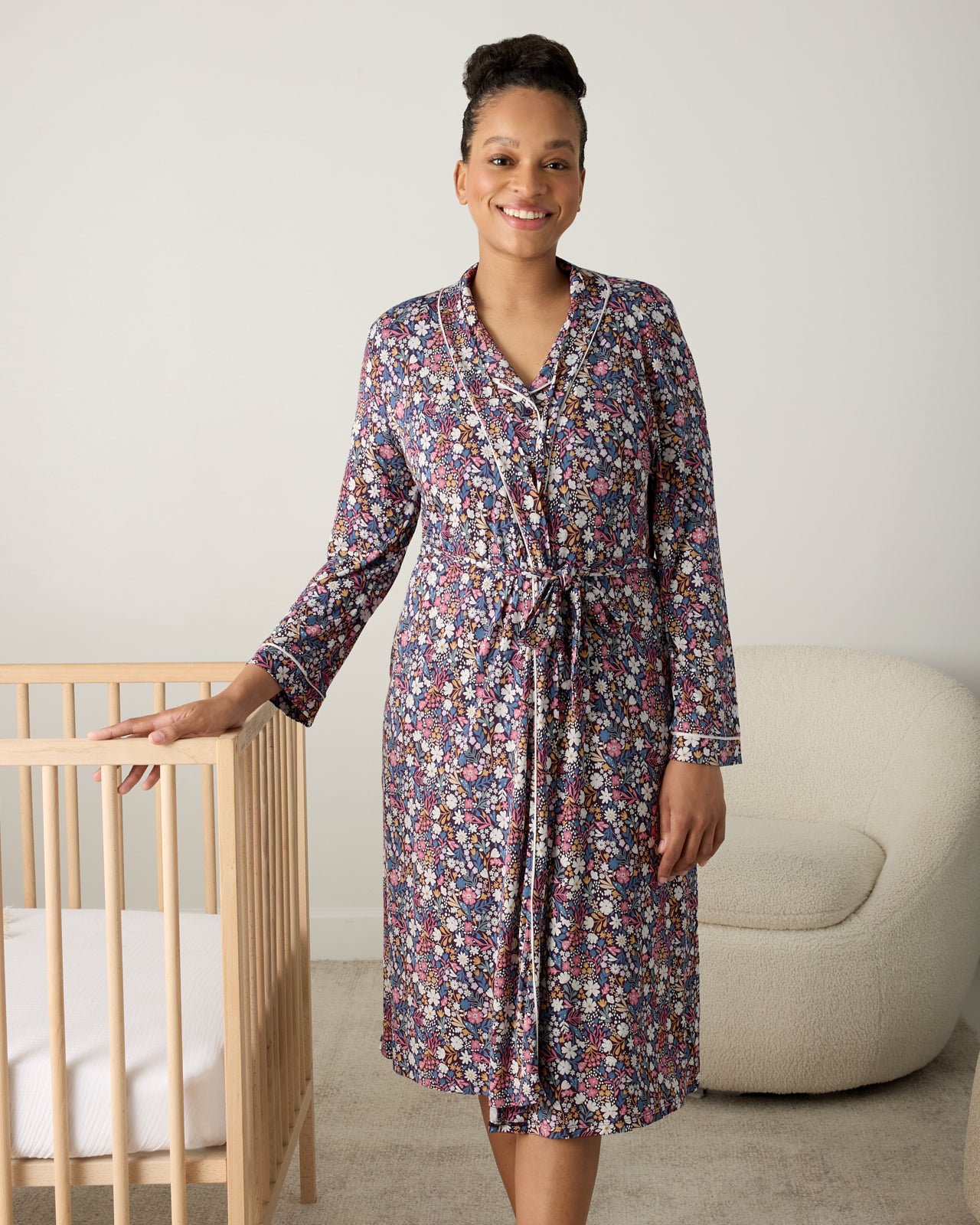 A must-have for mama! This silky soft bamboo floral Robe features a relaxed silhouette with a removable belt and inner tie closure for the perfect fit. The tiny blooms add timeless charm. while two side pockets keep your essentials close. With its tagless design. this dreamy robe is perfect for hospital homecomings. slow Sunday mornings. and matching with your little blossom.