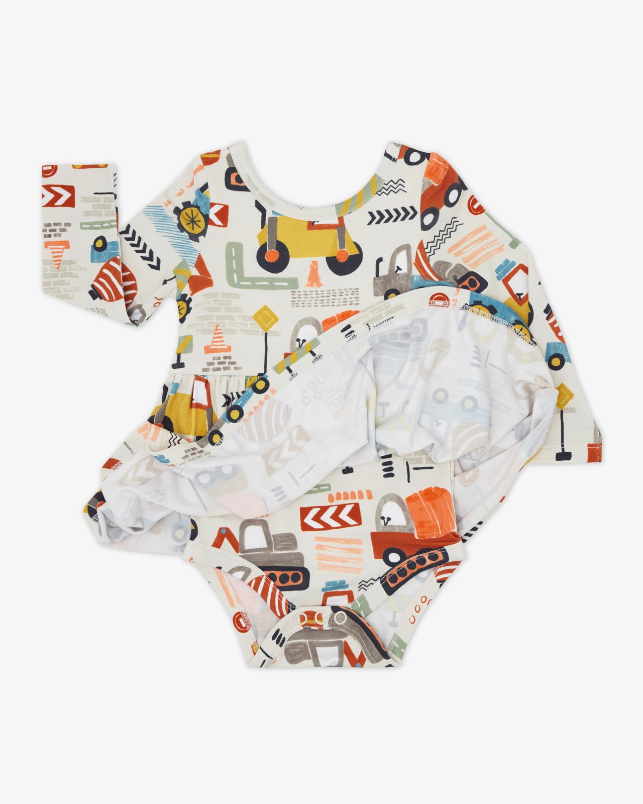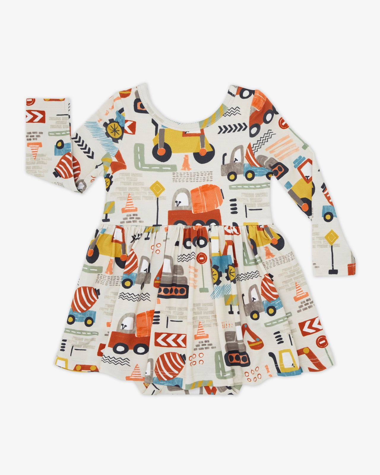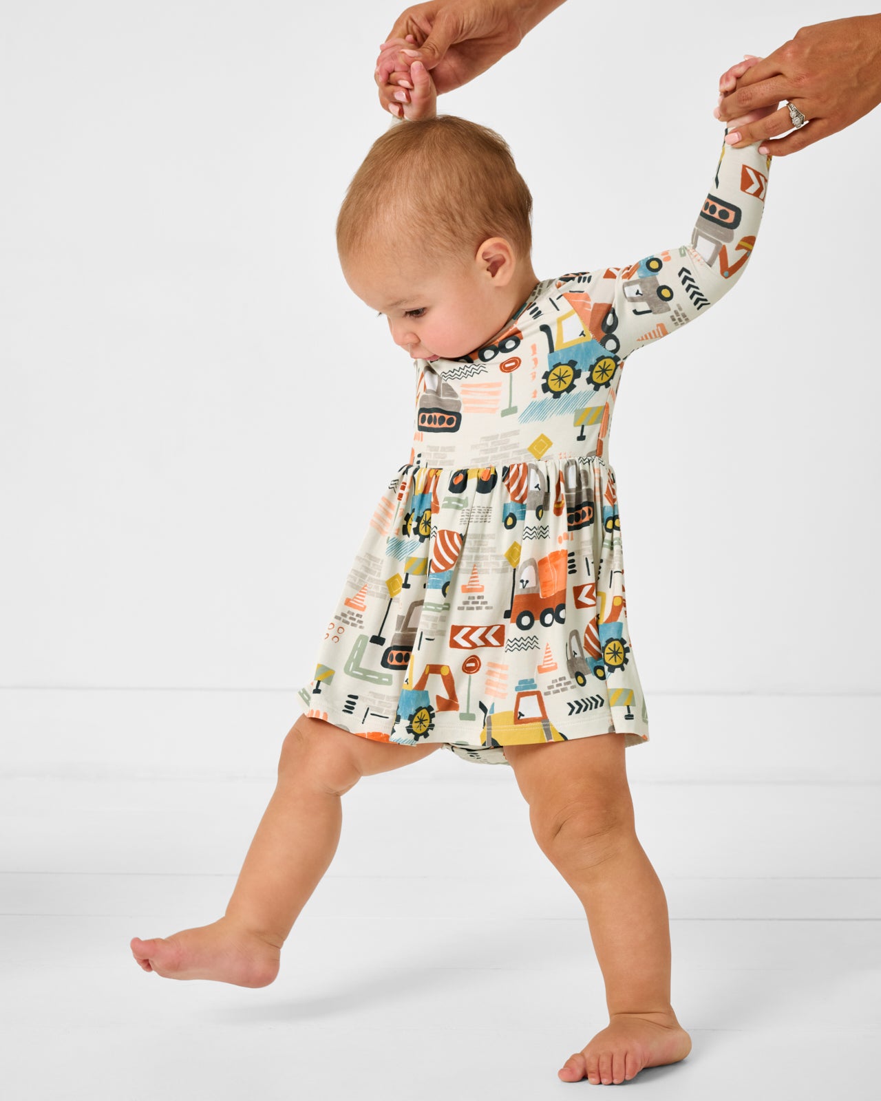 Let’s build something together! The Mini Builders Skater Dress features construction zone cuteness your little builder will love. Made from durable Soluxe® Bamboo with a hidden snappable bodysuit for easy changes. this toddler dress is perfect for sibling matching or playdates with the crew!
