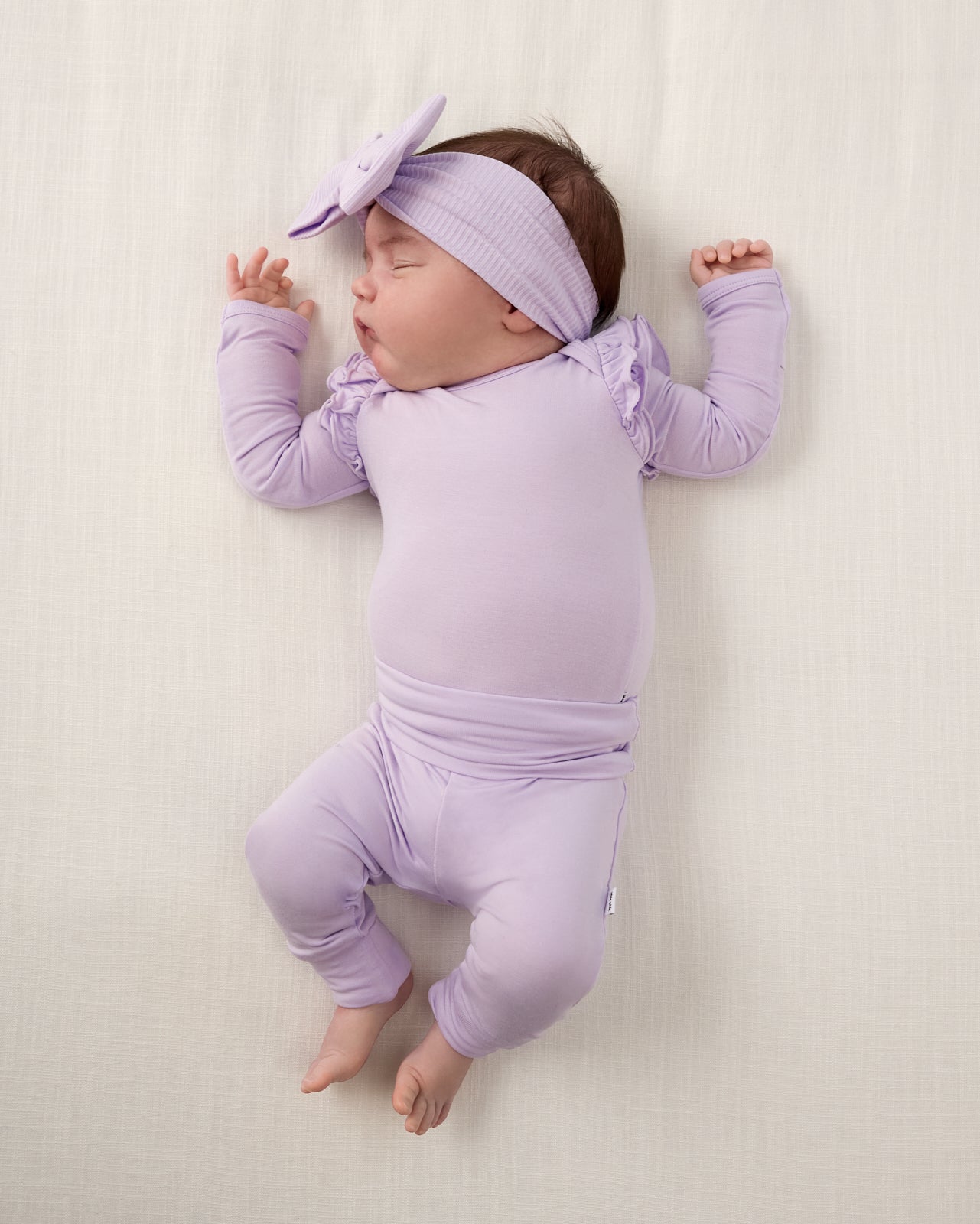 The prettiest anytime essential. The Misty Lavender Flutter Bodysuit is made from soft. durable bamboo with a snug fit. This adorable newborn bodysuit features lap shoulders for easy dressing and fold-over mittens to protect delicate skin from tiny scratches. The flutter details at shoulders add a photo-worthy touch. while snap closures make diaper changes a breeze.