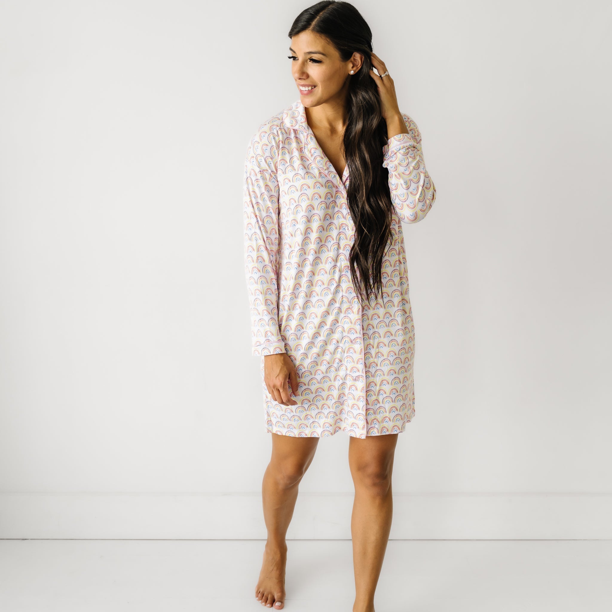 Snuggle up with the kiddos under countless dreamy rainbows! Made from our buttery soft Lunaluxe? Bamboo and designed by a mama. this sleep shirt features buttons down the front for easy nursing access. Grab styles for mommy & me matching!