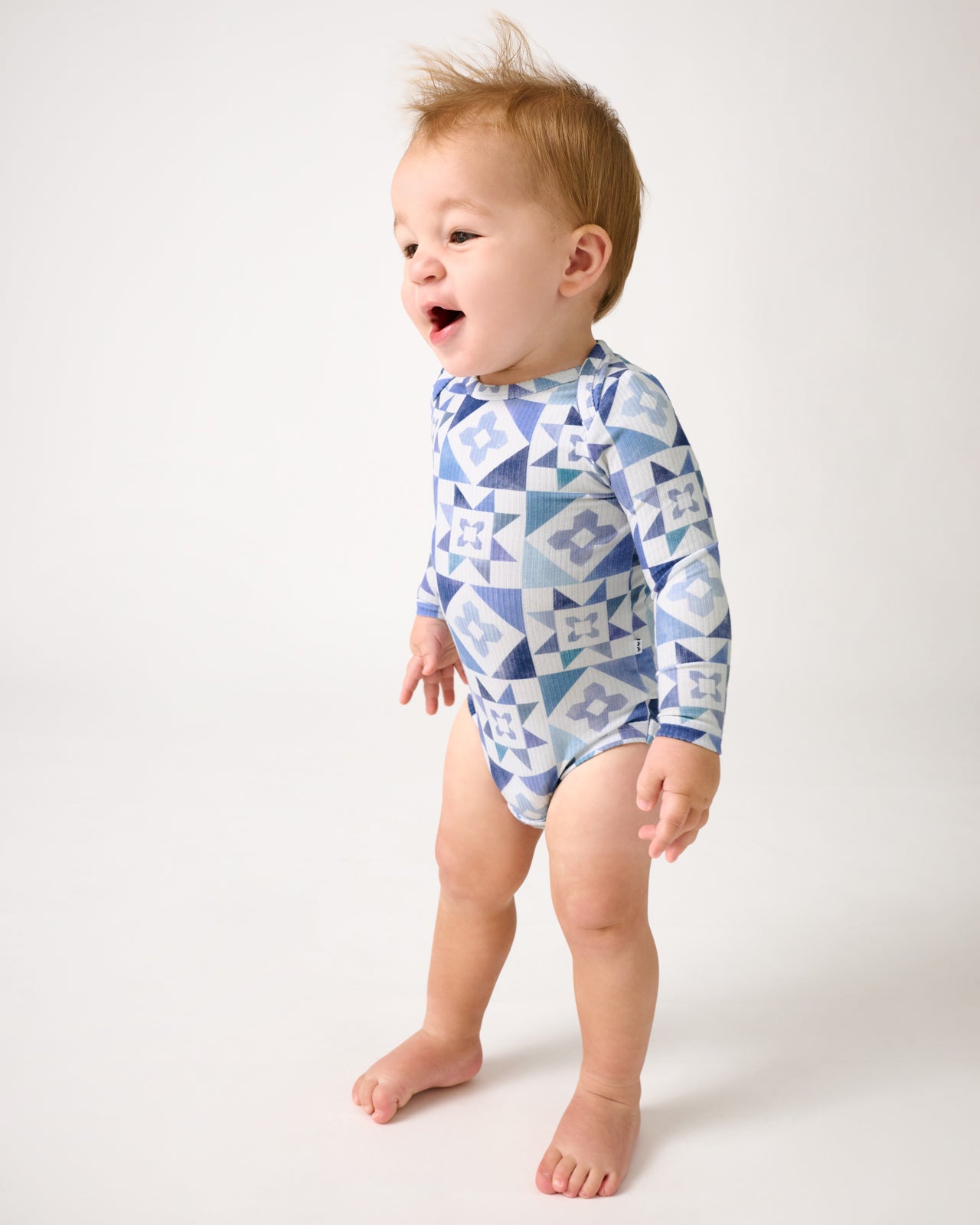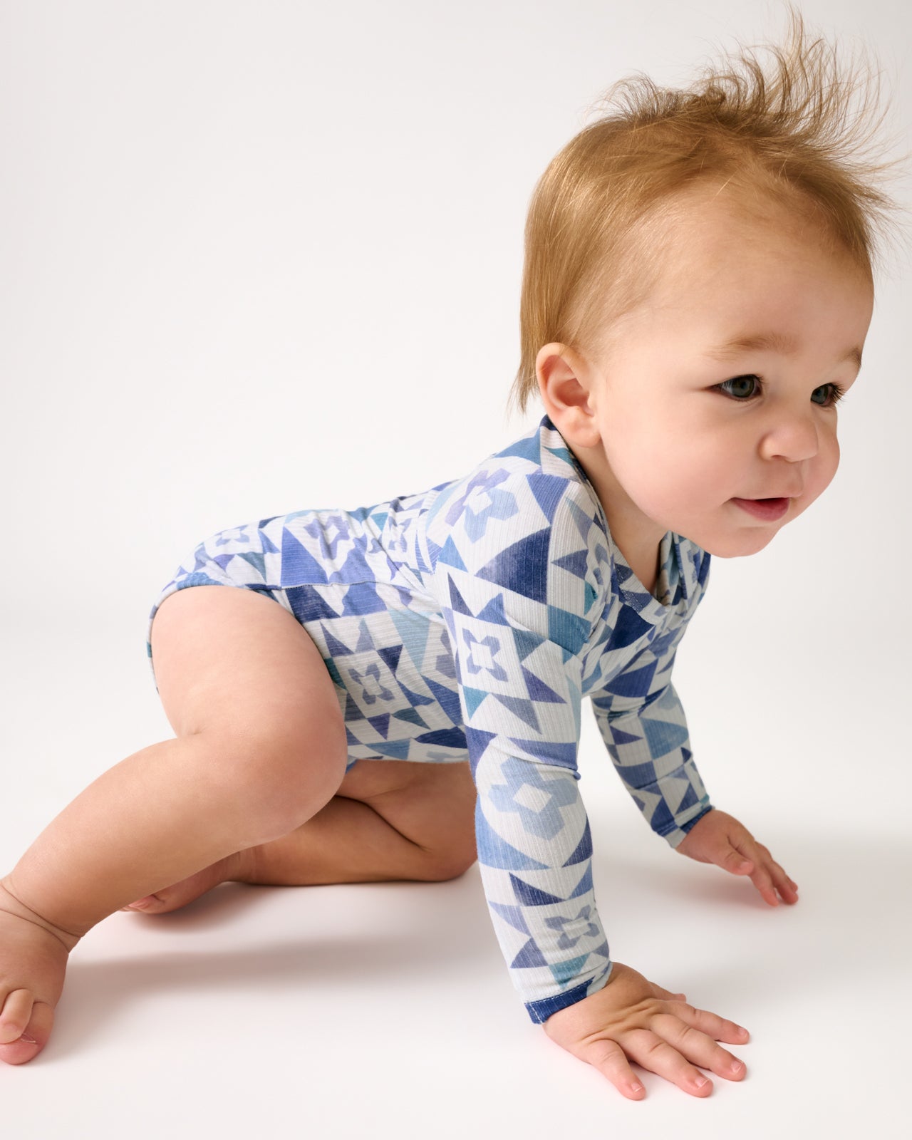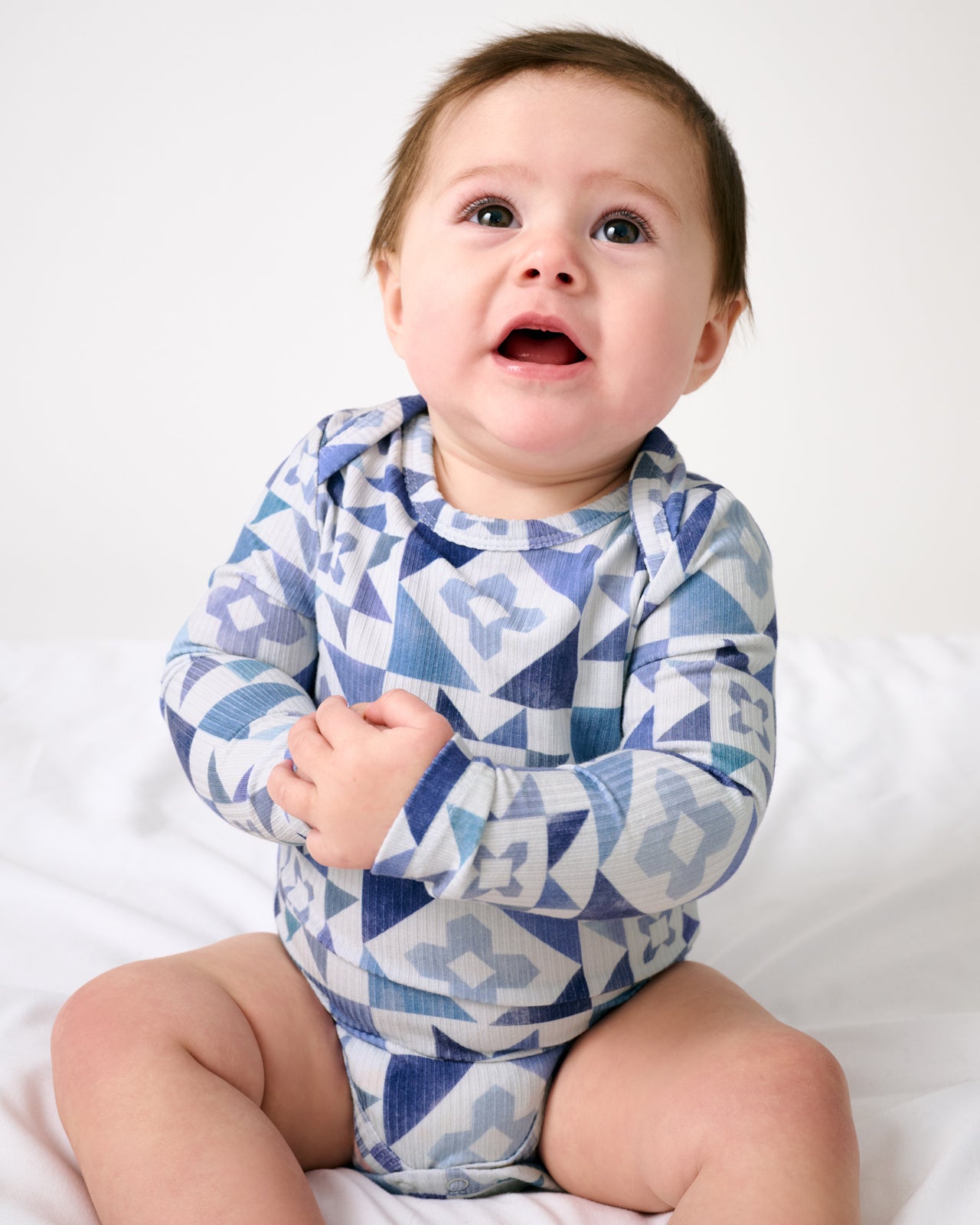 Patched together with love. The Patchwork Indigo Ribbed Bodysuit features a mosaic print in denim-inspired blues. Made from soft ribbed Soluxe® Bamboo that’s gentle on sensitive skin. this baby bodysuit has a snappable bottom for easy changes. Grab matching styles for sibling moments!