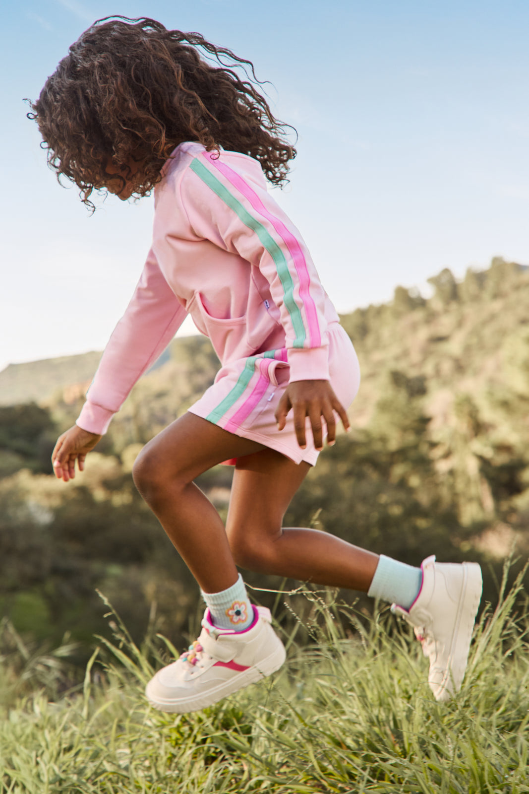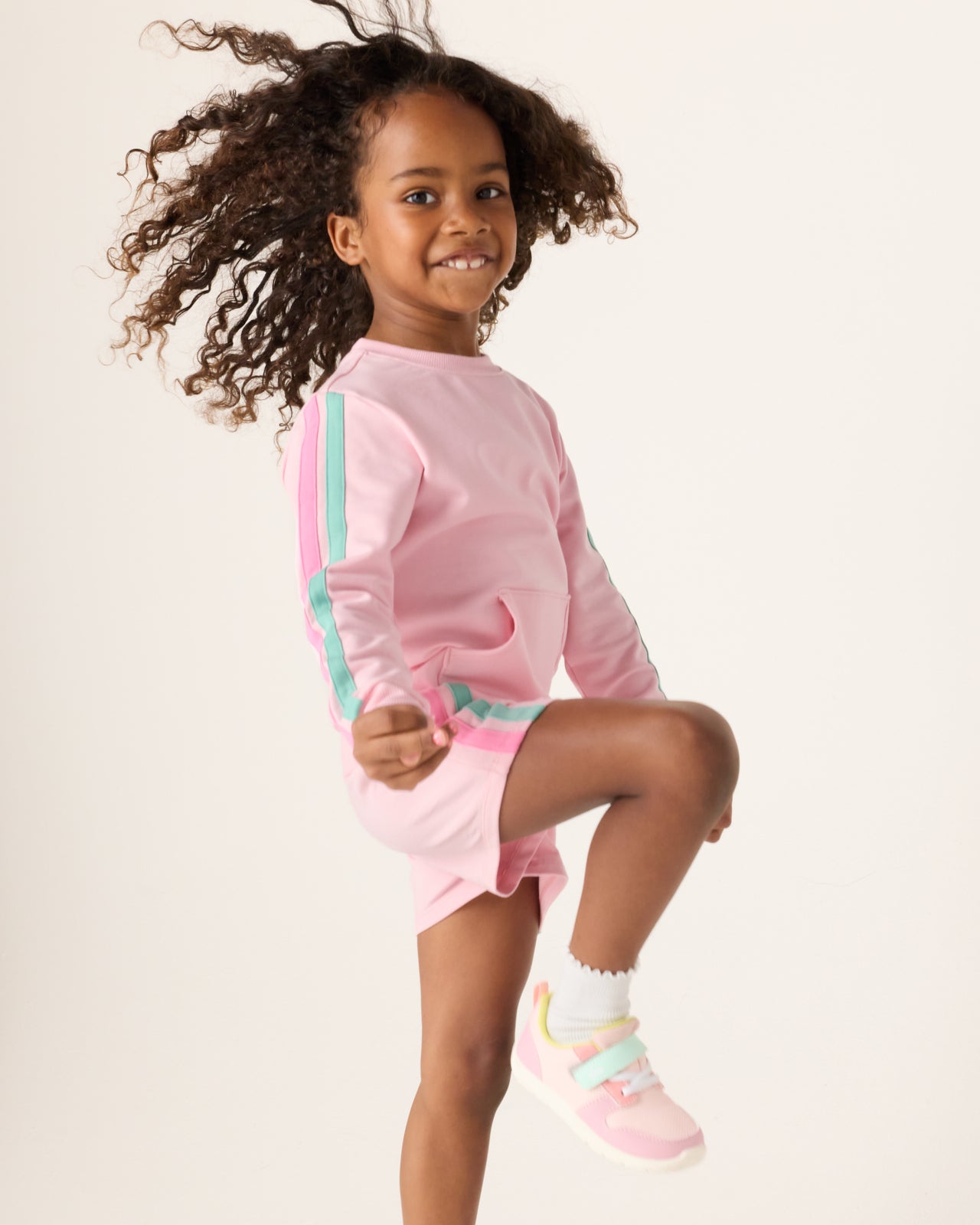 Everyday style. with a twist. The Pink Blossom Side Stripe Short features a soft pink hue with colorful retro stripes on the sides. Made from durable Soluxe® Bamboo with an easy pull-on style and comfy fit. Pair them with the Pink Blossom Pocket Crewneck for a go-to spring set!